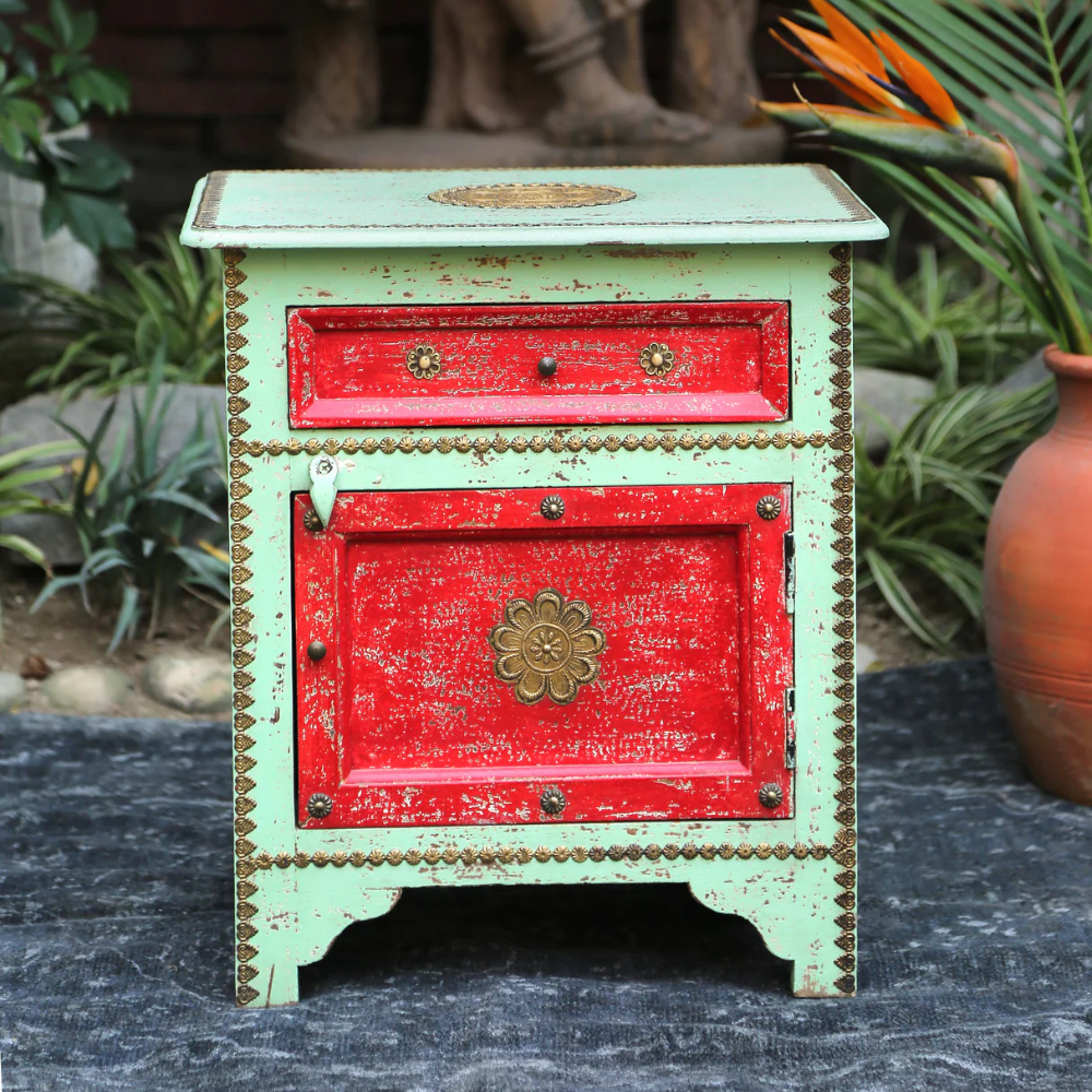 This artistic cabinet is handcrafted and Hand Painted by our artisans from Rajasthan . Perfect as side table or an accent pc. This piece of furniture can elegantly compliment a vintage look.
