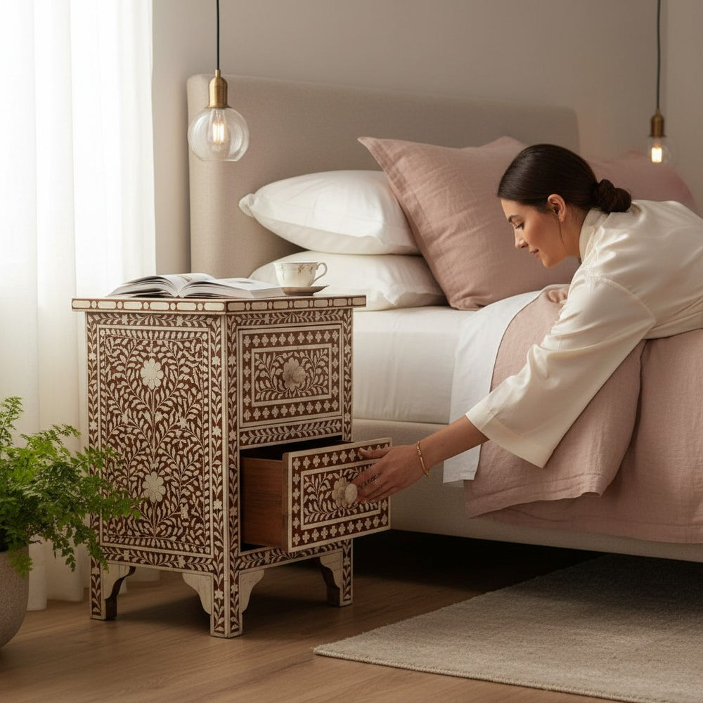 Bring timeless artistry into your bedroom with this exquisite Handcrafted Bone Inlay Bedside Table, designed to elevate your space with warmth, charm, and functional elegance. Its floral inlay patterns create a serene, luxurious atmosphere—perfect for peaceful mornings, cozy evenings, or a beautifully styled bedside vignette.