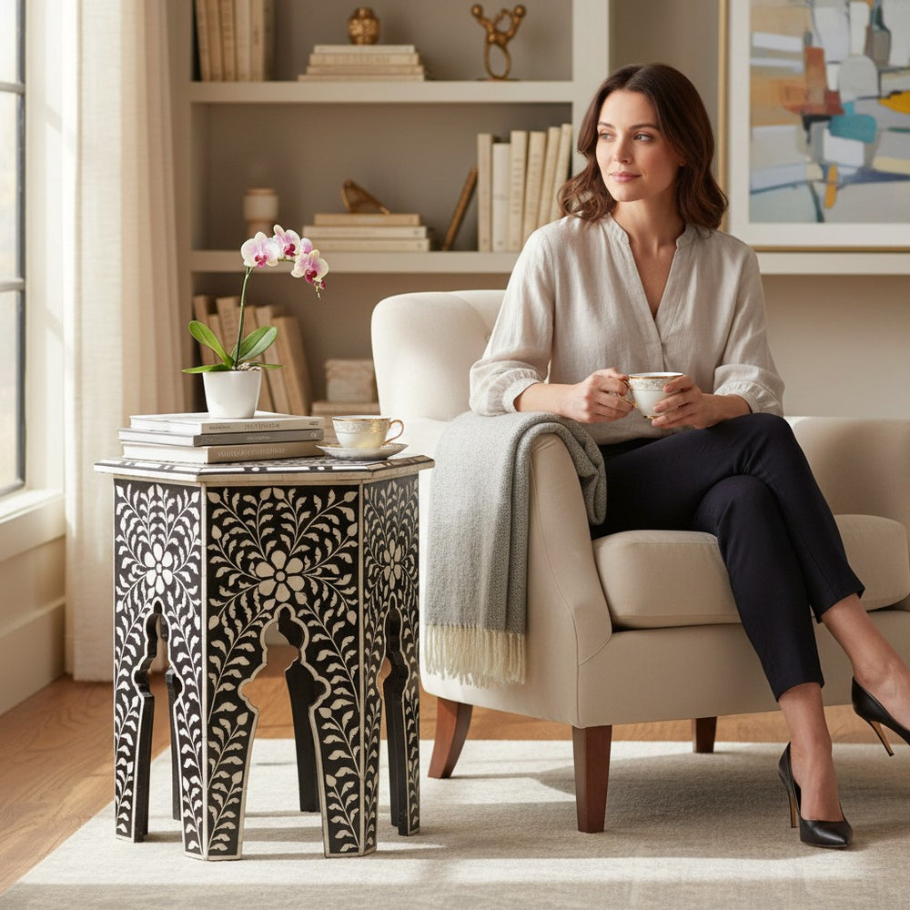 Bring a touch of cultural artistry and bohemian charm into your home with this exquisite Boho Bone Inlay Side Table. Designed with intricate floral and geometric hand-inlay work, this piece adds warmth, character, and visual elegance to any living room, reading nook, or bedroom corner. Its unique arch-legged silhouette and striking black-and-white contrast make it a statement accent that blends beautifully with modern, eclectic, coastal, and global-inspired interiors. Perfect for morning coffee, décor styling, or displaying plants, it elevates daily routines with a luxurious handcrafted feel.