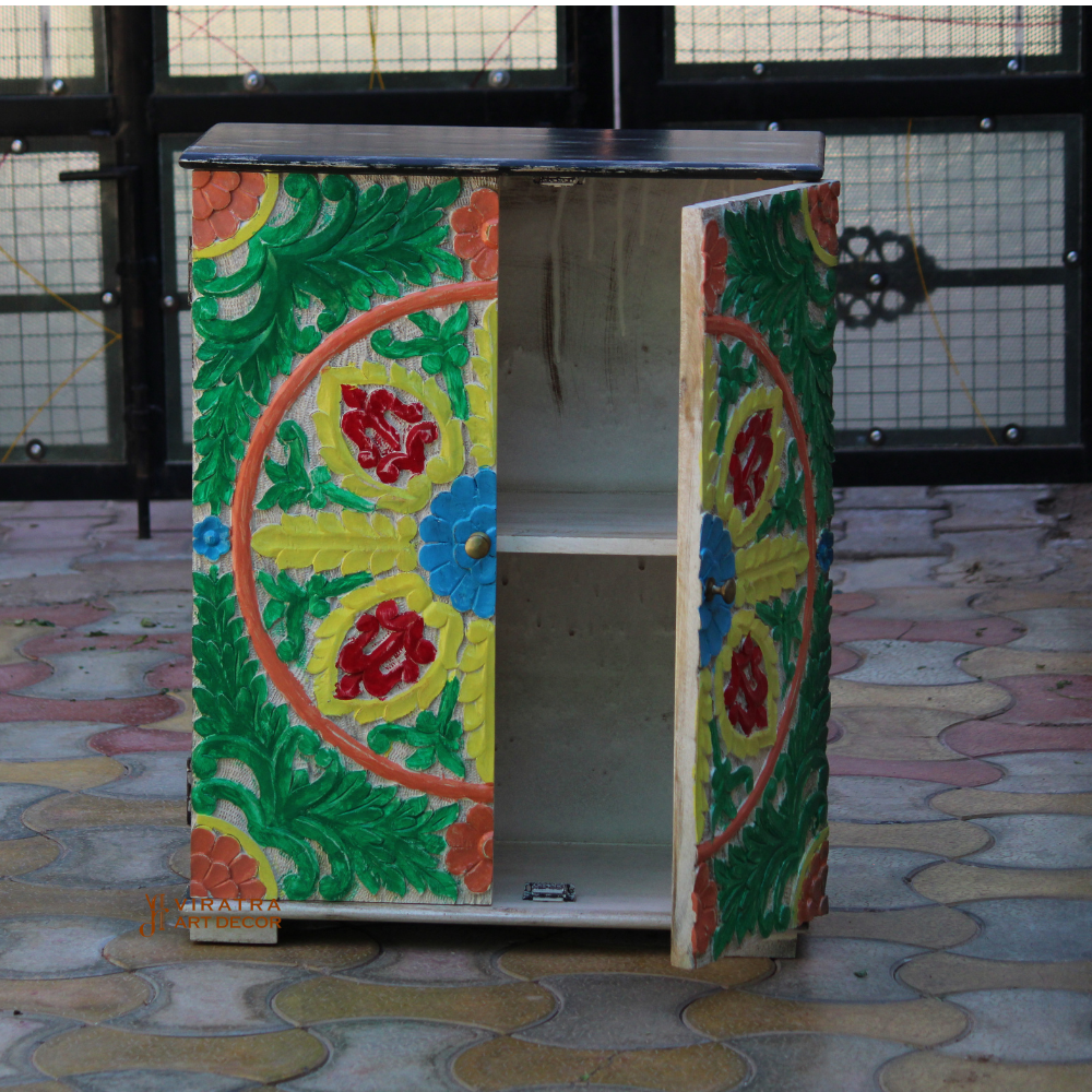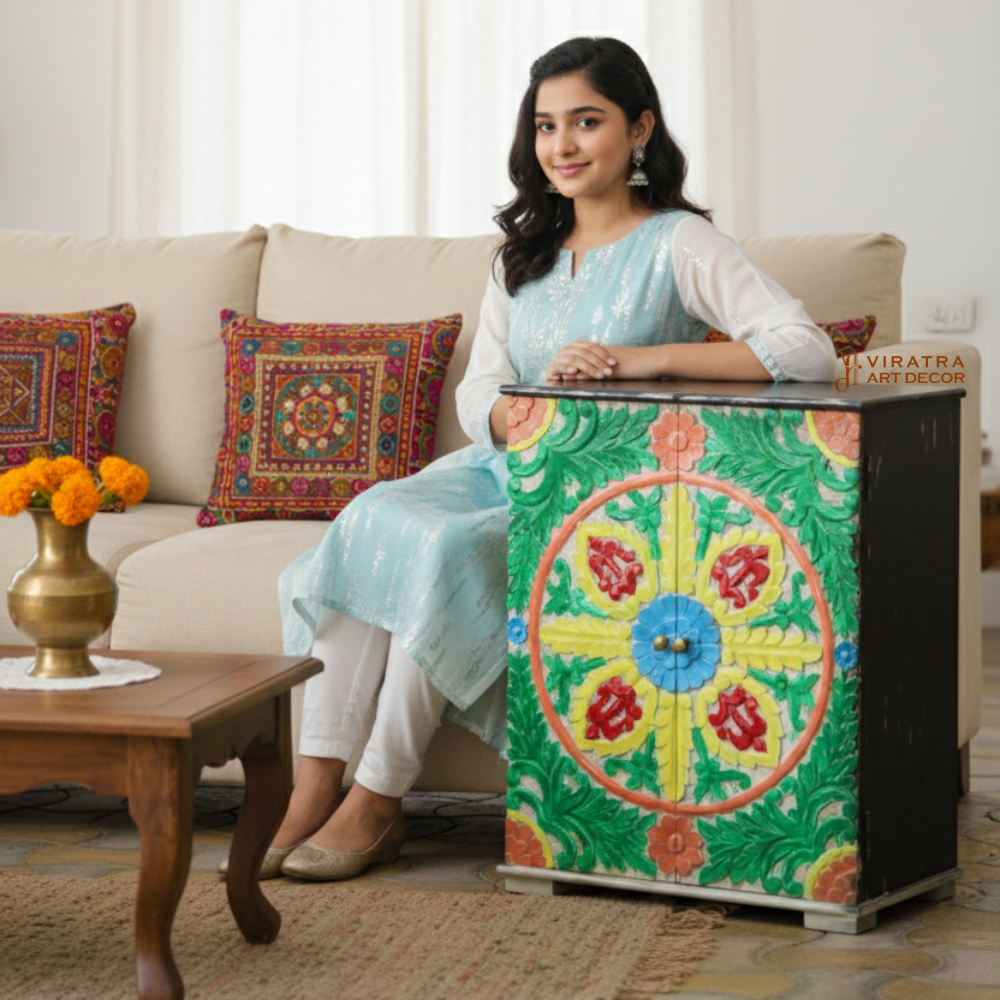 Wooden Bedside Cabinet | Solid Mango Wood Sideboard | Hand Carved Vintage Look Indian Furniture | Living Room Storage | Handmade Home Décor