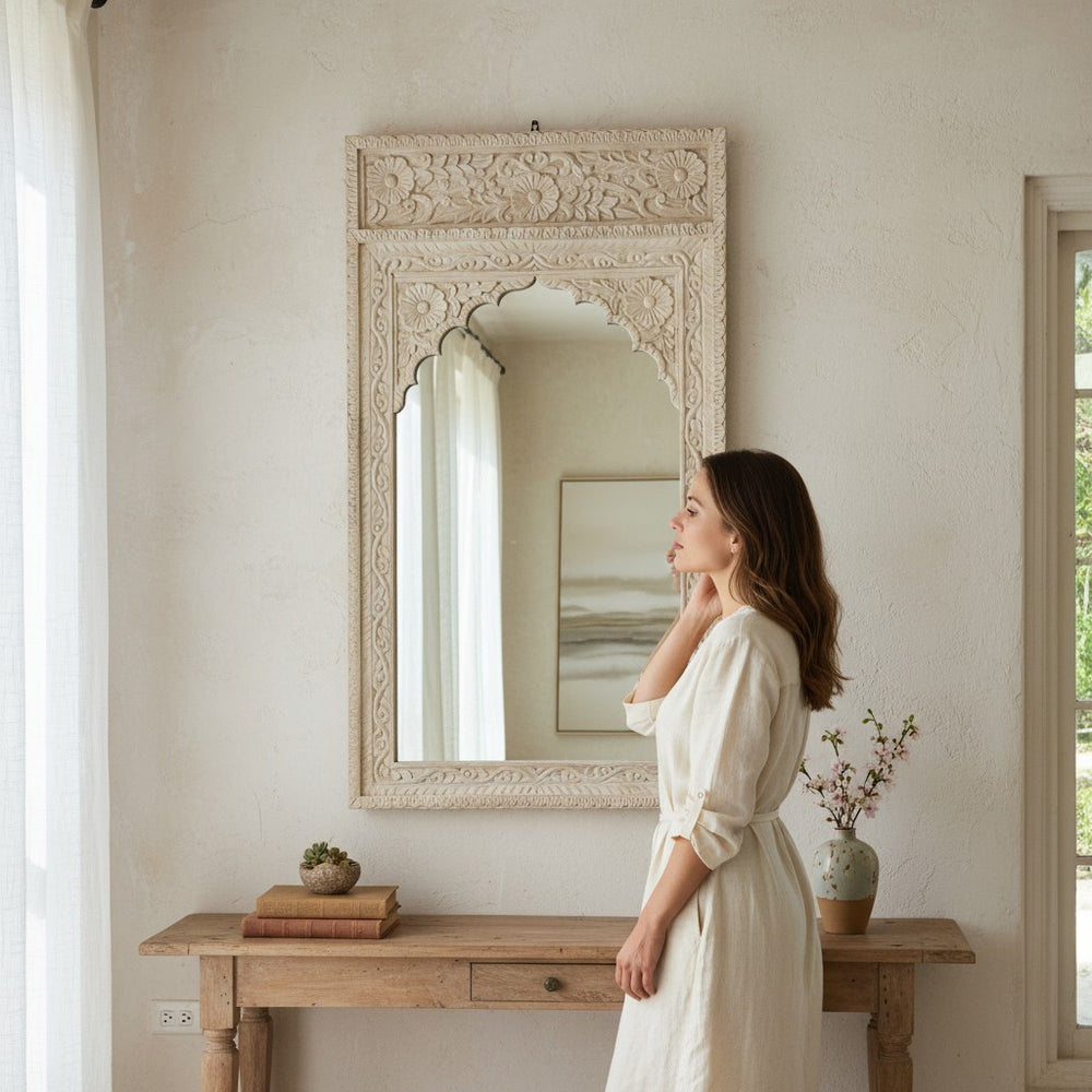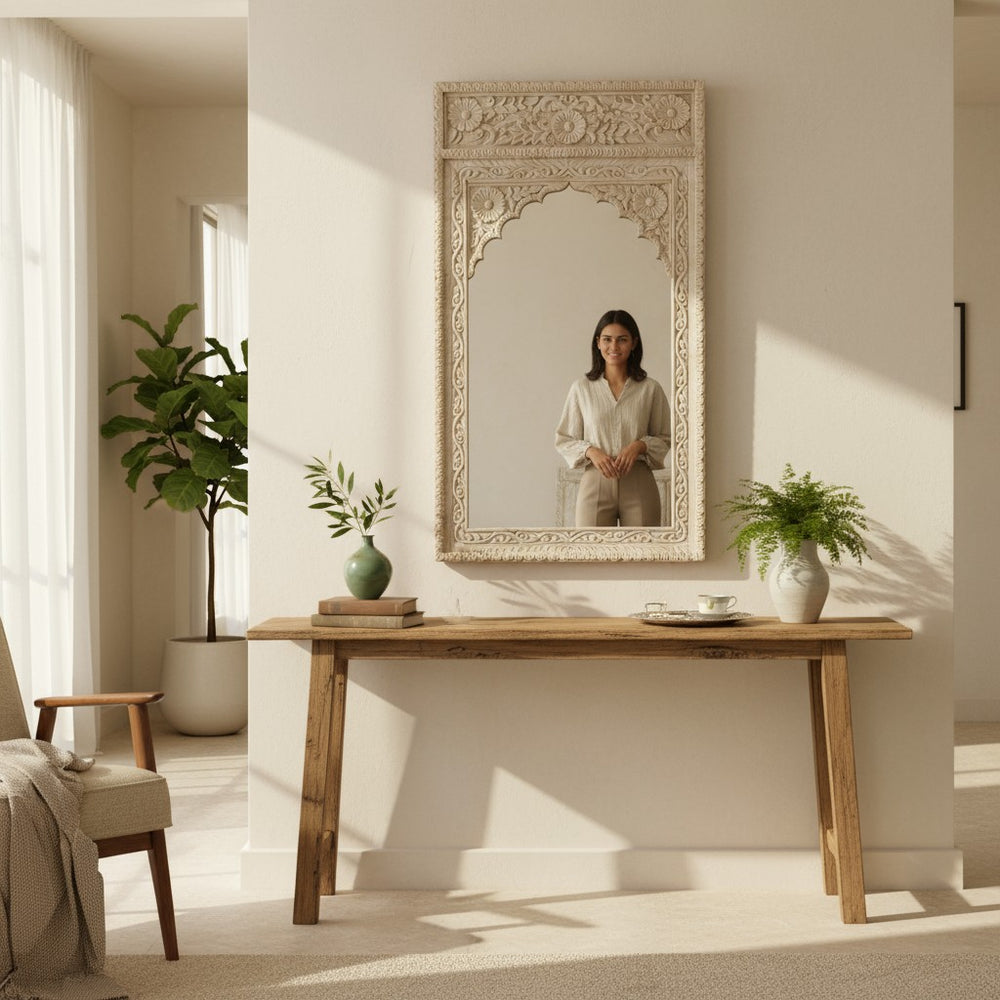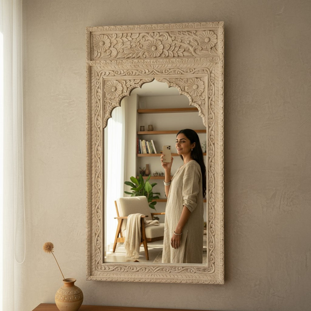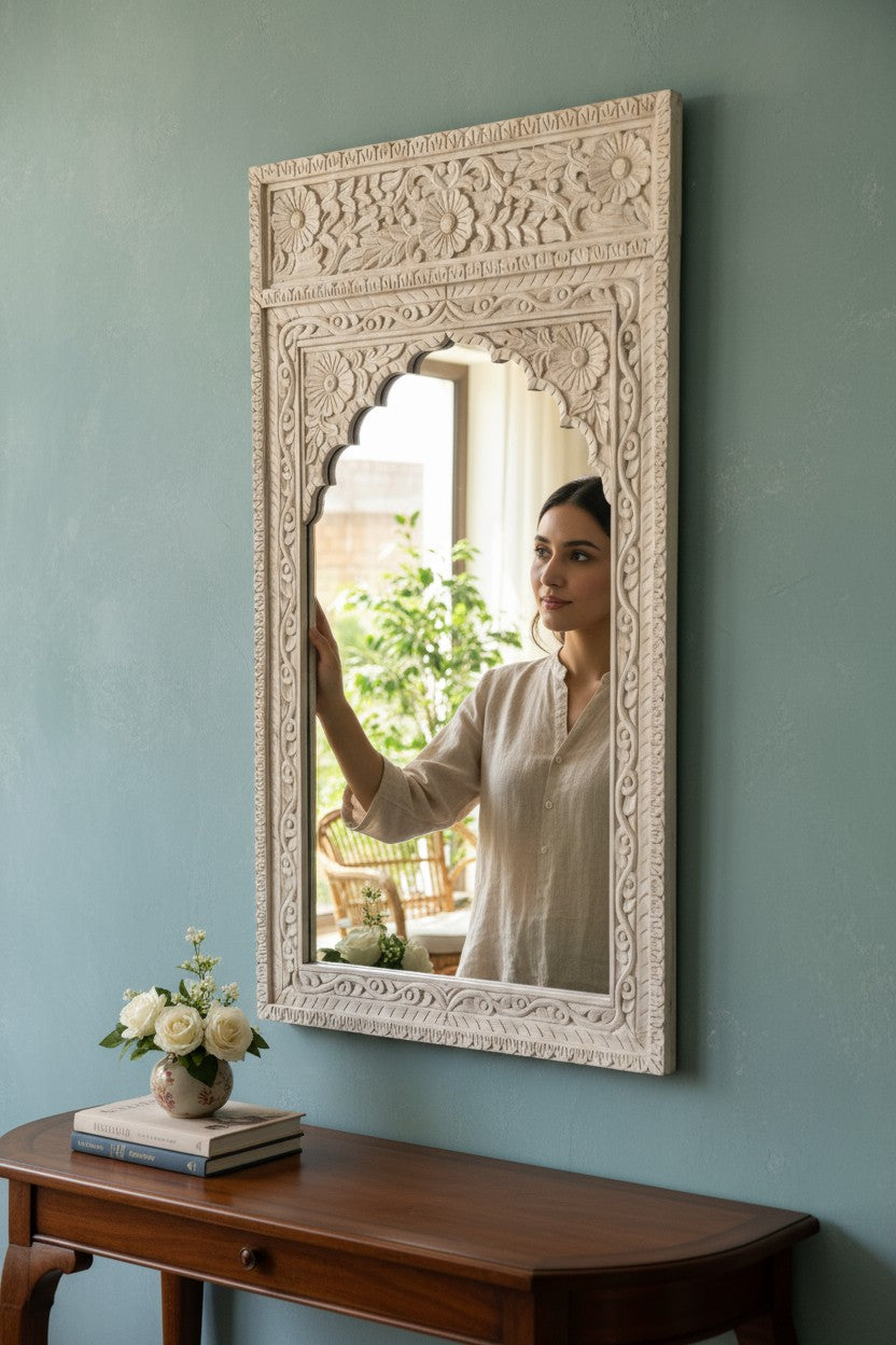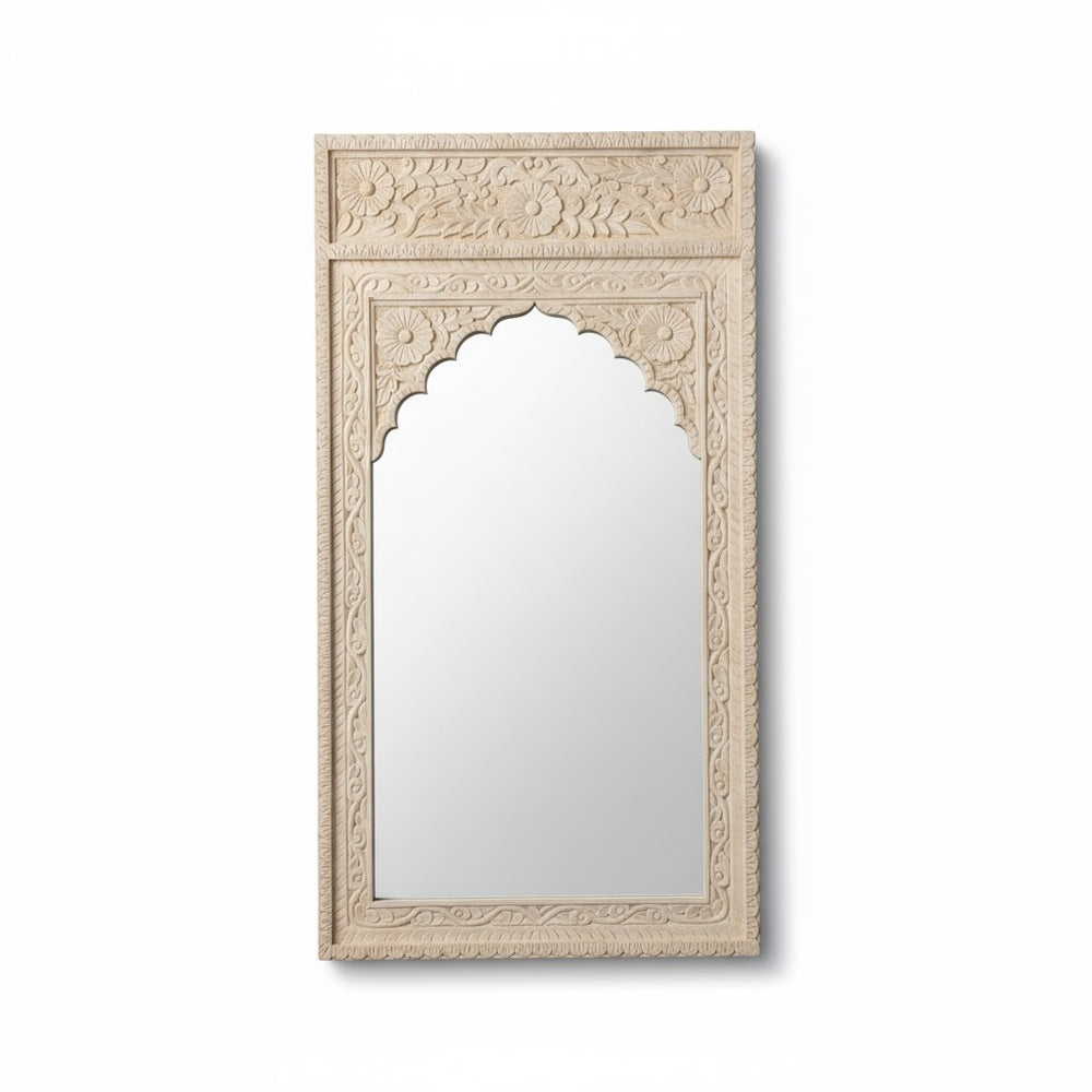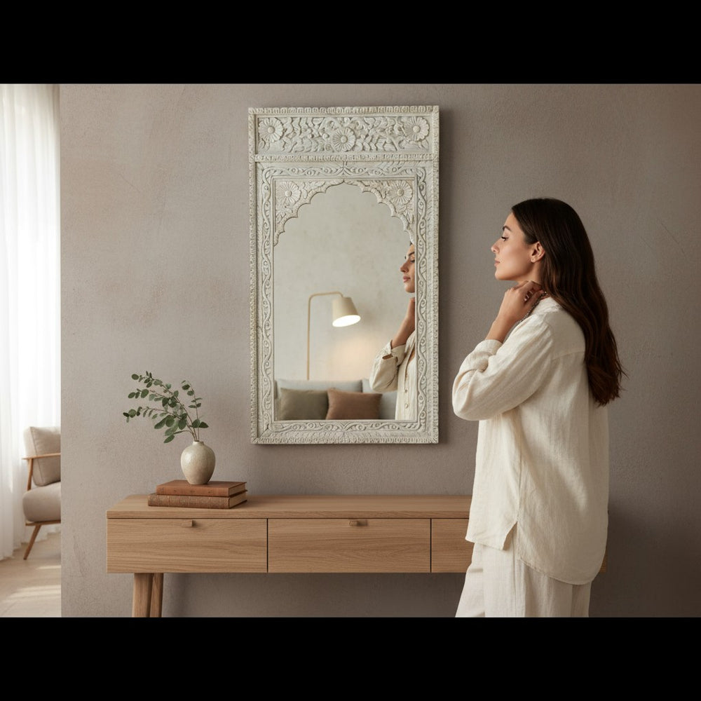 Add timeless charm to your home with this beautifully hand-carved wooden frame mirror, inspired by classic Indian arch designs. Its soft white finish, floral carving, and tall vertical shape elevate any room — from the entryway to the bedroom or living area. This striking decor piece enhances natural light, enlarges visual space, and brings serene, earthy elegance to your everyday lifestyle.