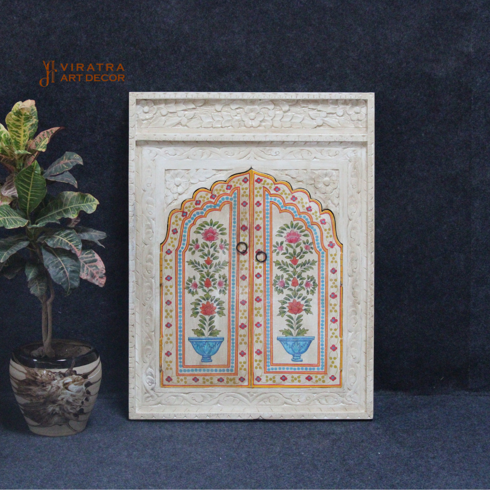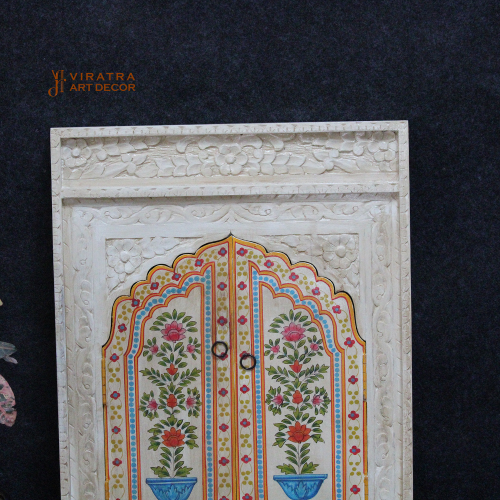 Indian craftsmanship into your home with this intricately hand-carved and hand-painted wooden wall panel. Measuring 130 cm in height, 70 cm in width, and 5 cm in depth, this decorative piece features a traditional floral motif framed by an ornate arch and detailed carvings, inspired by Rajasthani jharokha window frames.