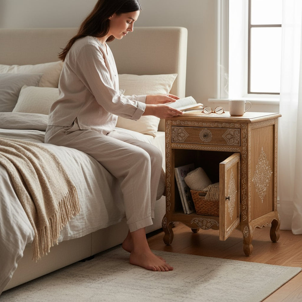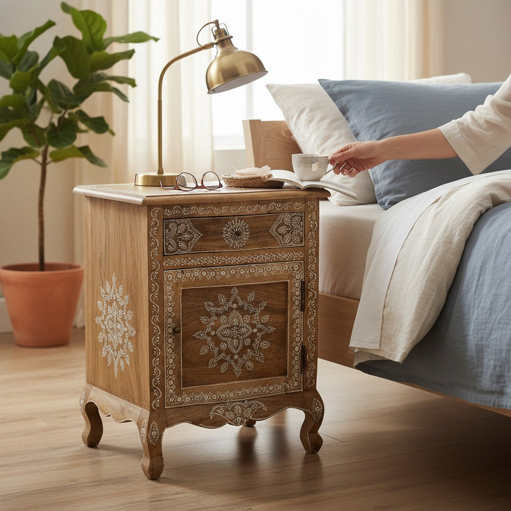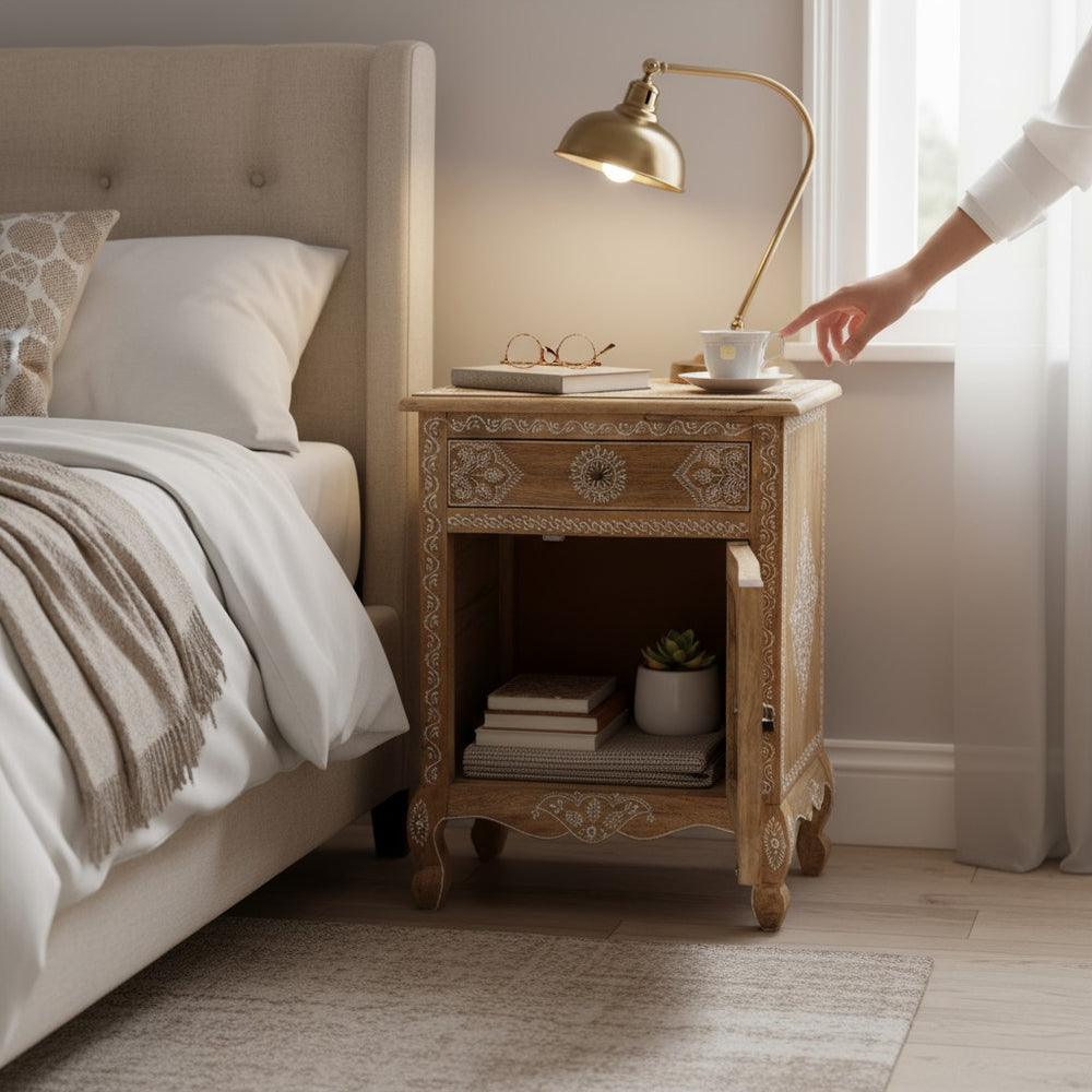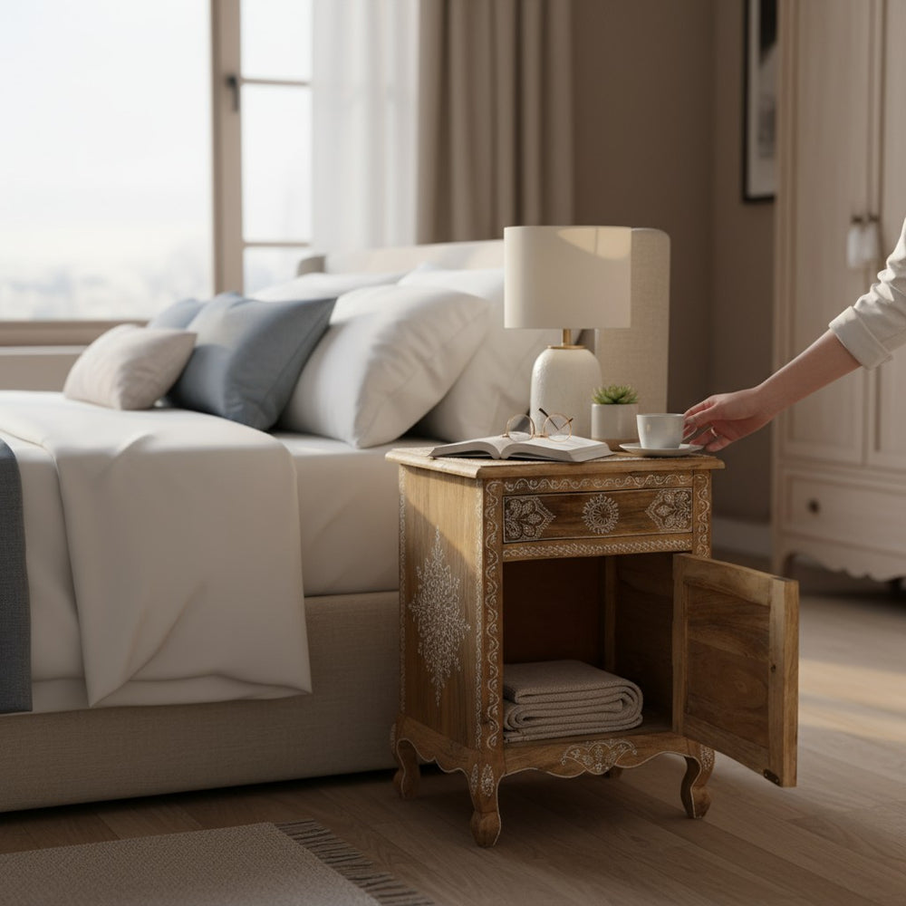 Bring charm and calm to your bedroom with this Hand-Painted Indian Bedside Table, beautifully crafted to blend traditional artistry with modern comfort. Its intricate white motifs, warm natural wood finish, and elegant curved legs create a serene and stylish space—perfect for morning tea, nighttime essentials, or decorative accents. Ideal for adding handcrafted elegance and practical storage to bedrooms across the world.