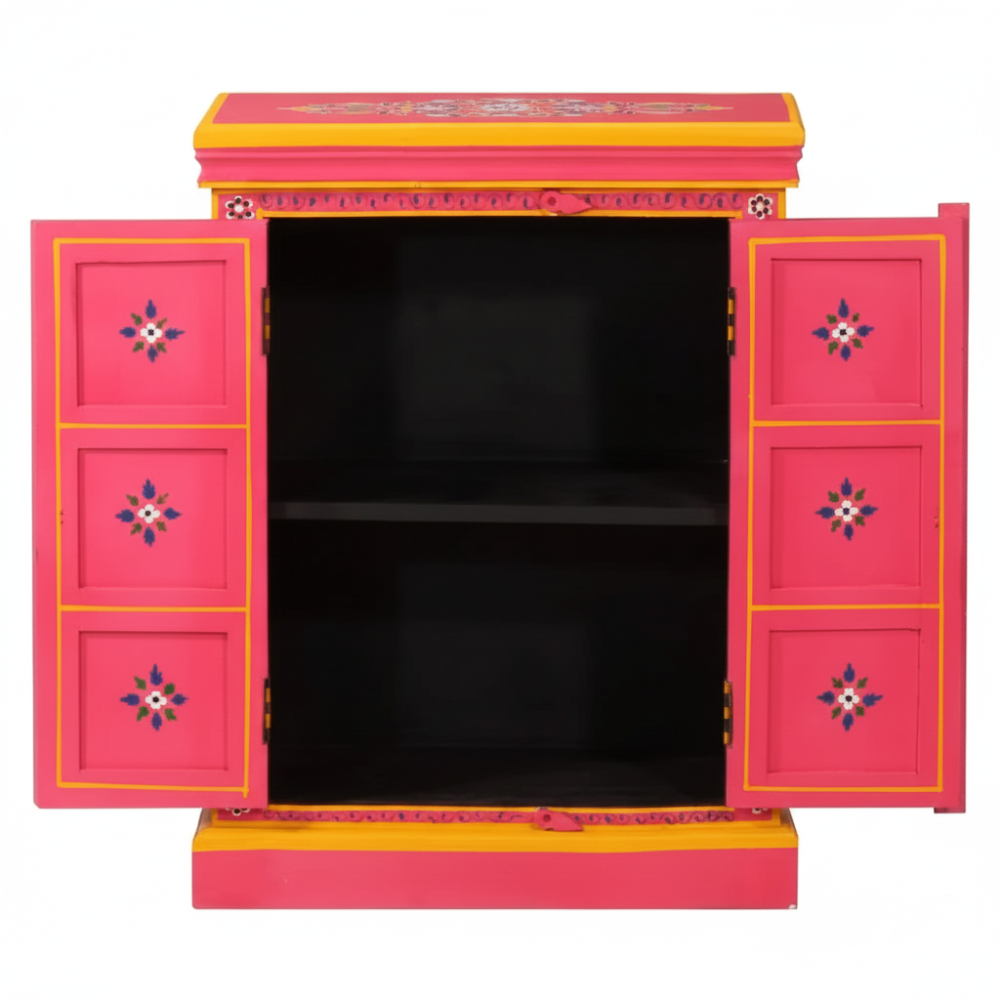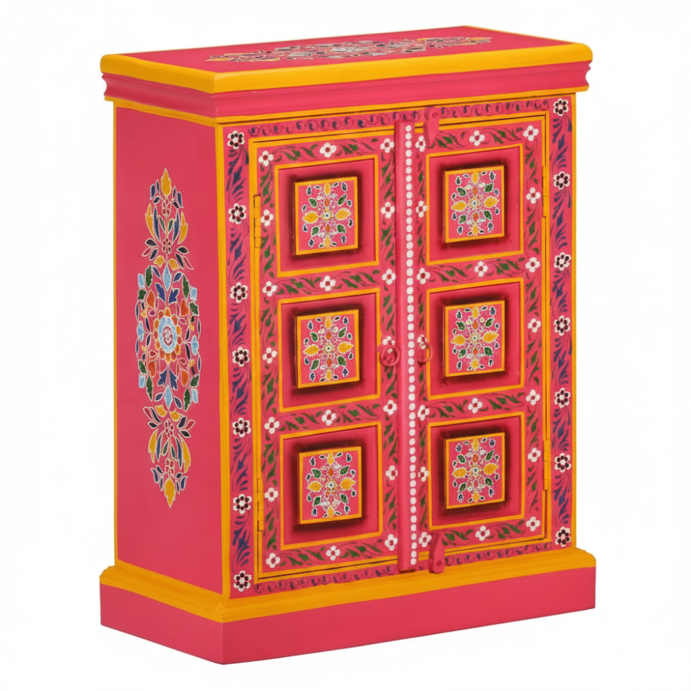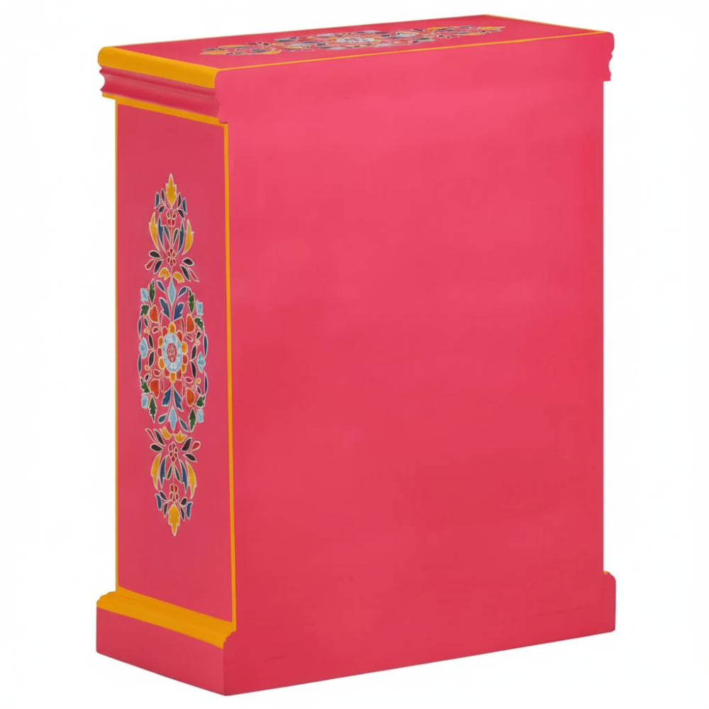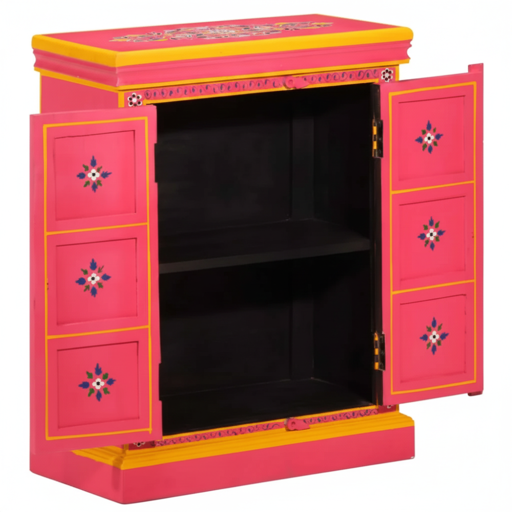 Bring vibrant artistry and cultural charm into your home with this beautifully hand-painted wooden sideboard cabinet. Featuring bold pink tones, intricate floral motifs, and traditional Indian craftsmanship, this cabinet stands out as a striking décor piece while offering practical storage space. Its double-door design with internal shelving makes it perfect for organizing essentials, storing accessories, or enhancing your living room, bedroom, hallway, or entryway. A true artisan-made accent that adds color, warmth, and a handcrafted touch to any modern or traditional interior.