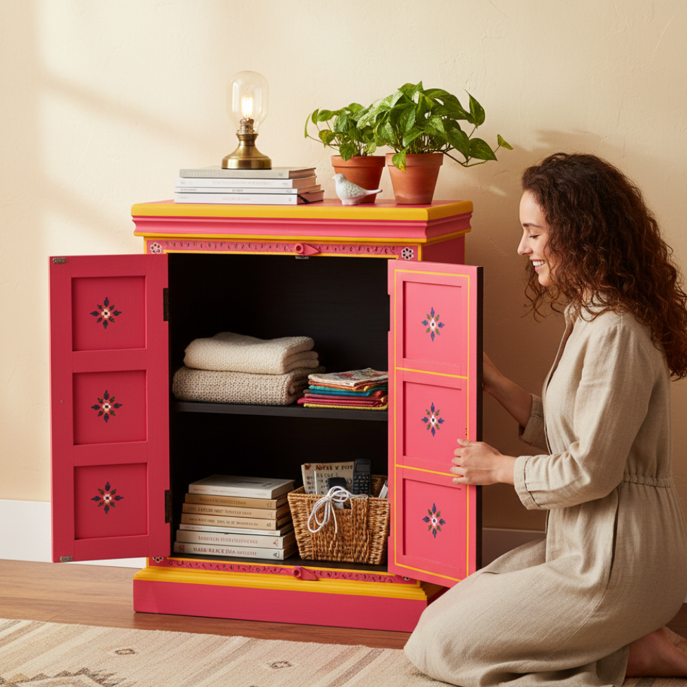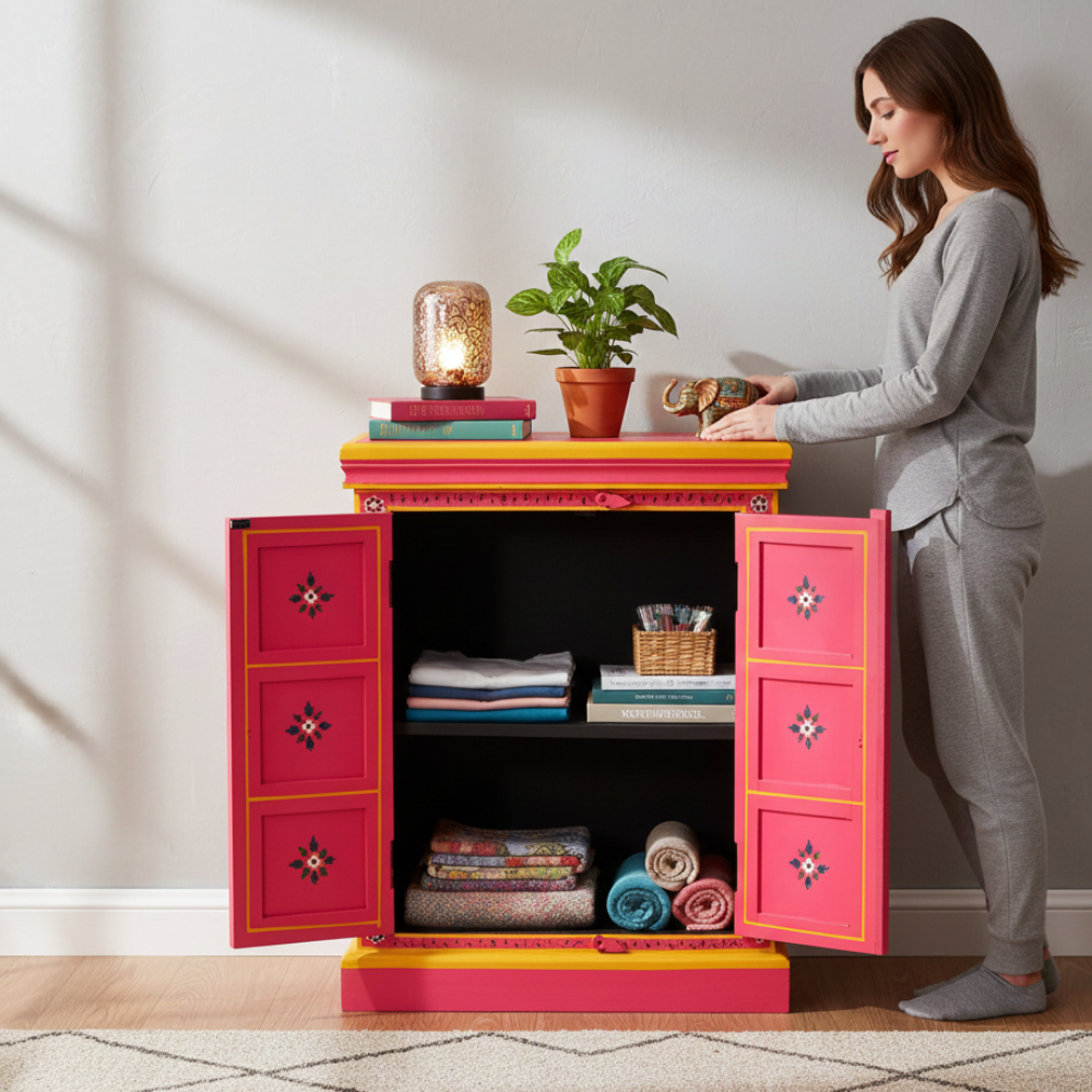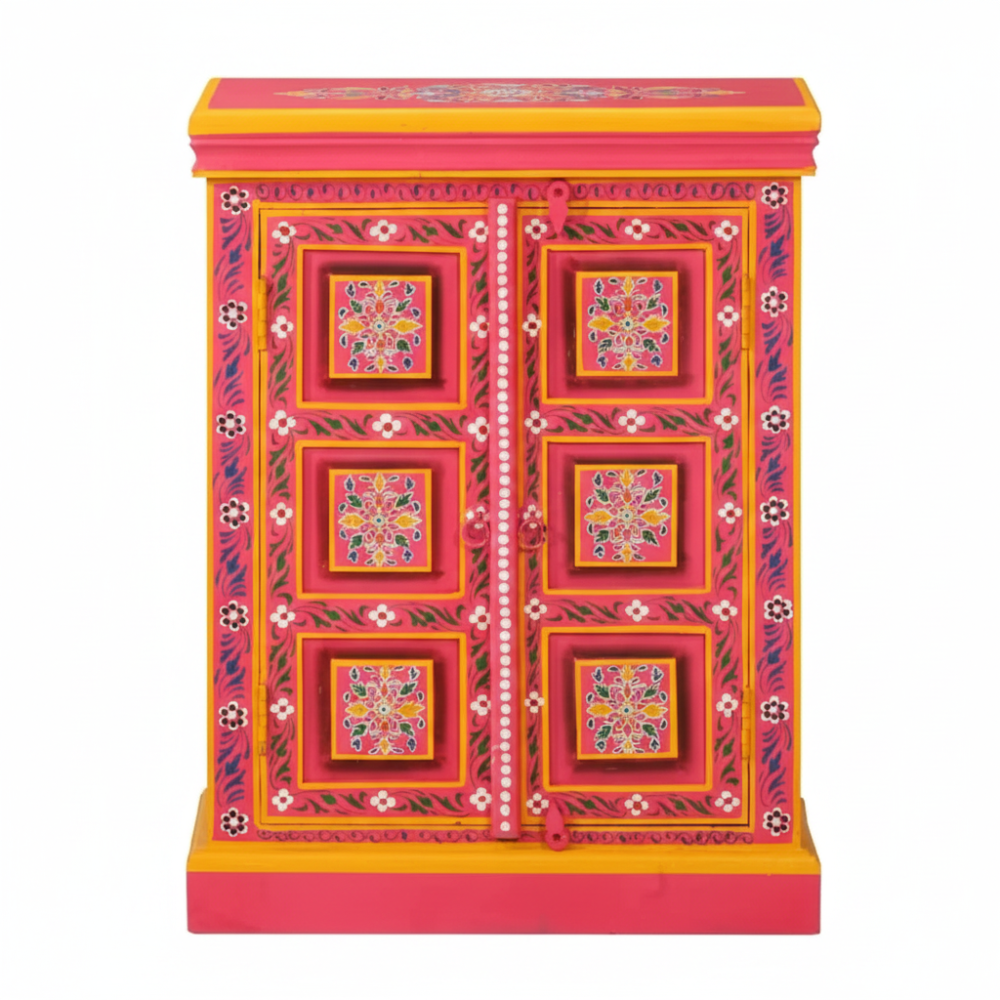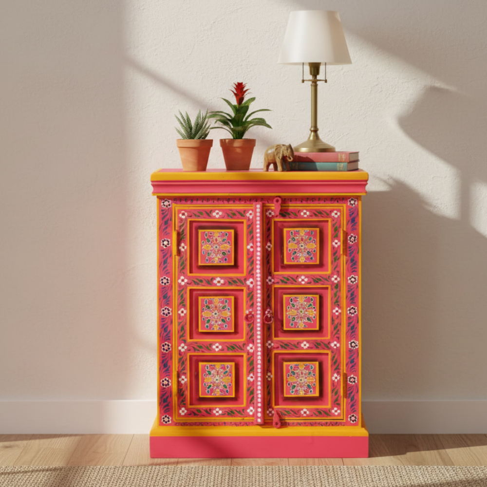Bring vibrant artistry and cultural charm into your home with this beautifully hand-painted wooden sideboard cabinet. Featuring bold pink tones, intricate floral motifs, and traditional Indian craftsmanship, this cabinet stands out as a striking décor piece while offering practical storage space. Its double-door design with internal shelving makes it perfect for organizing essentials, storing accessories, or enhancing your living room, bedroom, hallway, or entryway. A true artisan-made accent that adds color, warmth, and a handcrafted touch to any modern or traditional interior.