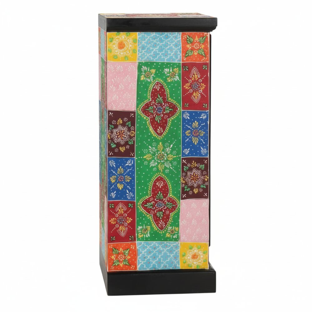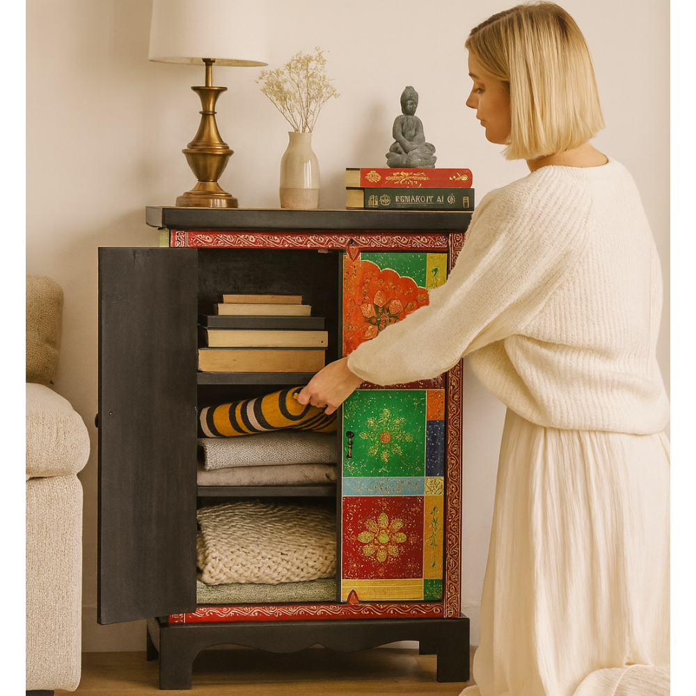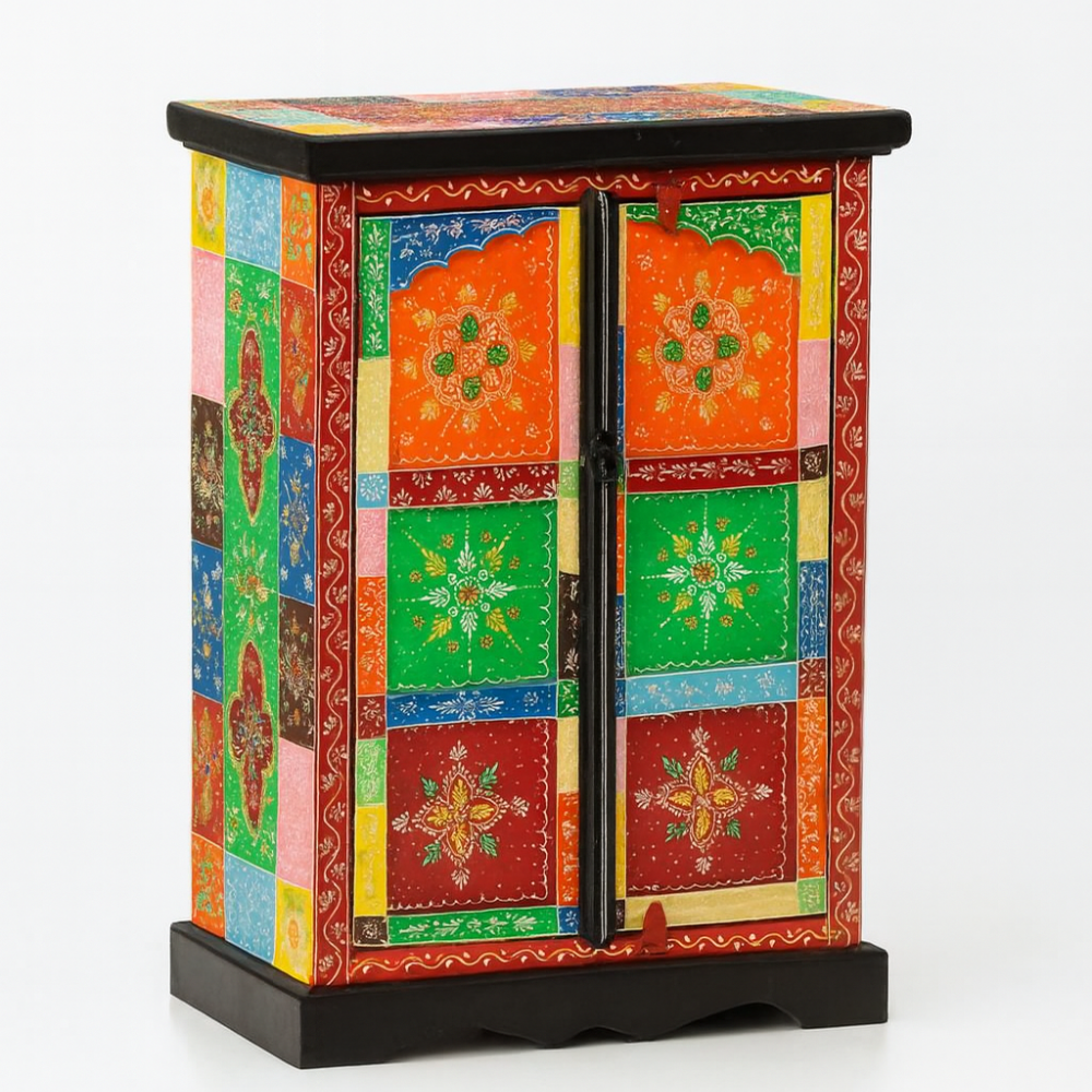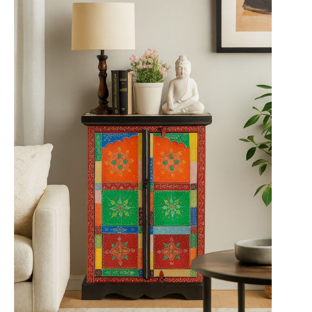 Bring a burst of color and cultural charm into your living space with this beautifully hand-painted sideboard cabinet. Featuring intricate traditional patterns in bold, vibrant hues, this compact storage unit doubles as an artistic accent piece. Perfect for modern, boho, eclectic, and ethnic-inspired interiors, it adds personality while keeping essentials neatly stored. Whether placed in the living room, hallway, or bedroom, it enhances your home with handcrafted elegance and practical utility.