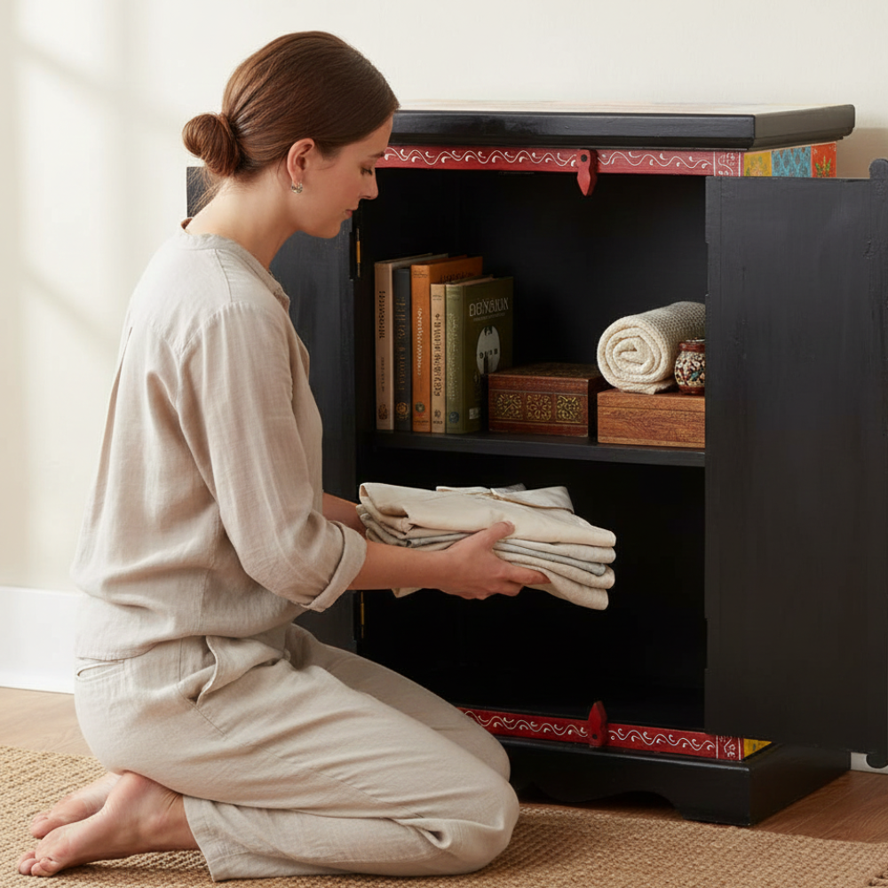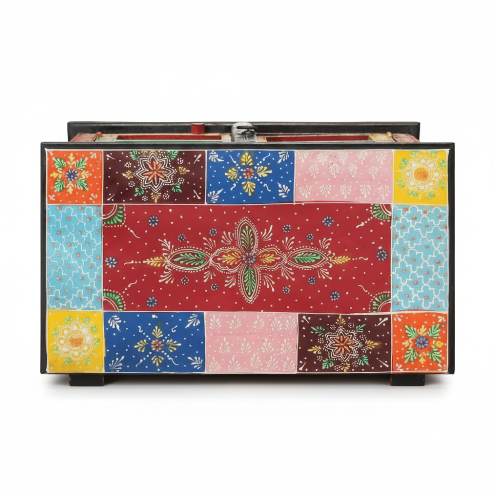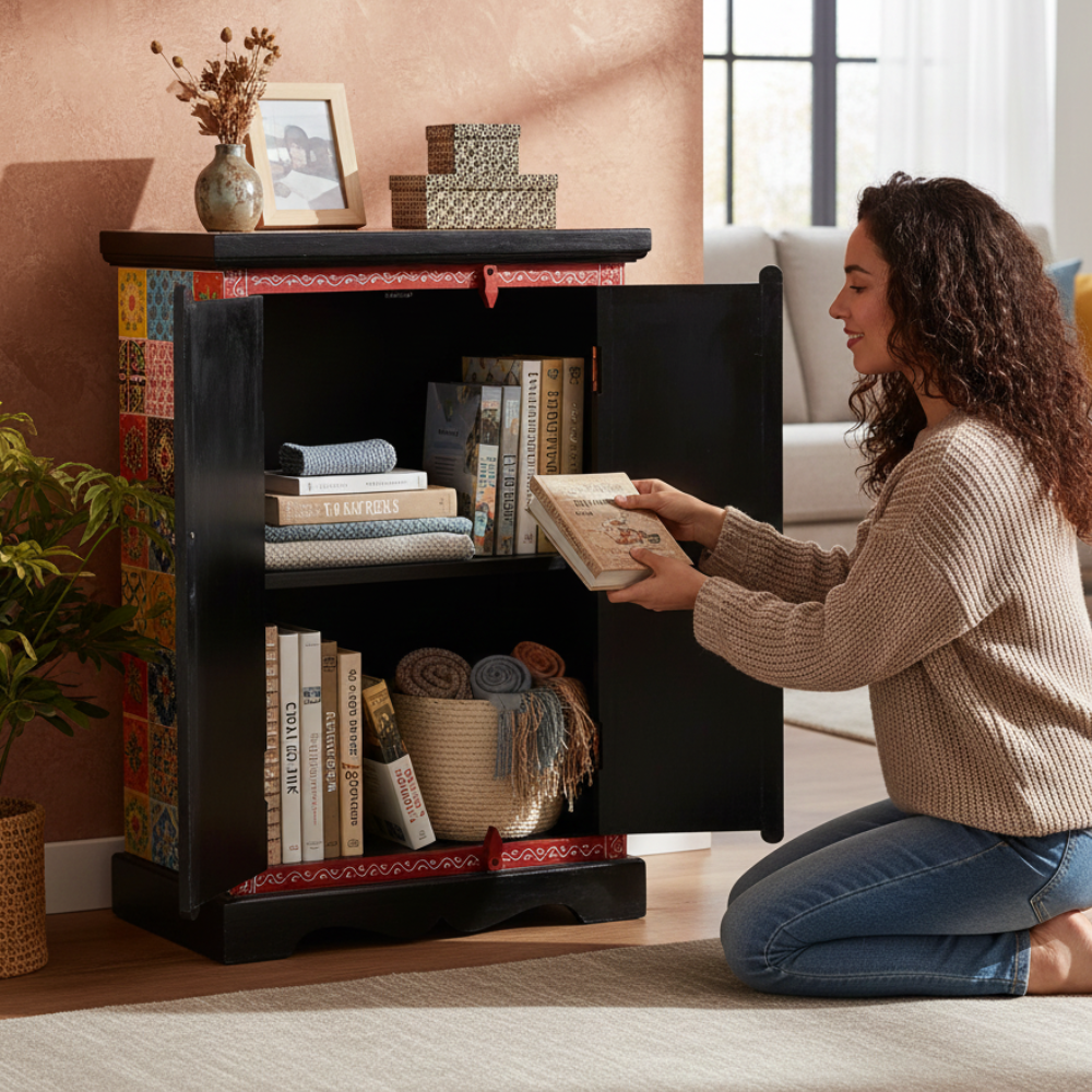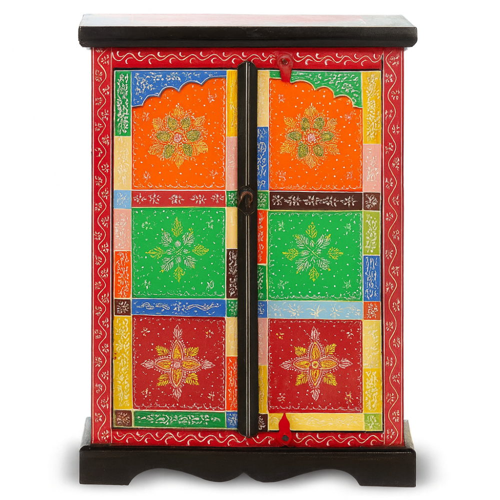 Bring a burst of color and cultural charm into your living space with this beautifully hand-painted sideboard cabinet. Featuring intricate traditional patterns in bold, vibrant hues, this compact storage unit doubles as an artistic accent piece. Perfect for modern, boho, eclectic, and ethnic-inspired interiors, it adds personality while keeping essentials neatly stored. Whether placed in the living room, hallway, or bedroom, it enhances your home with handcrafted elegance and practical utility.