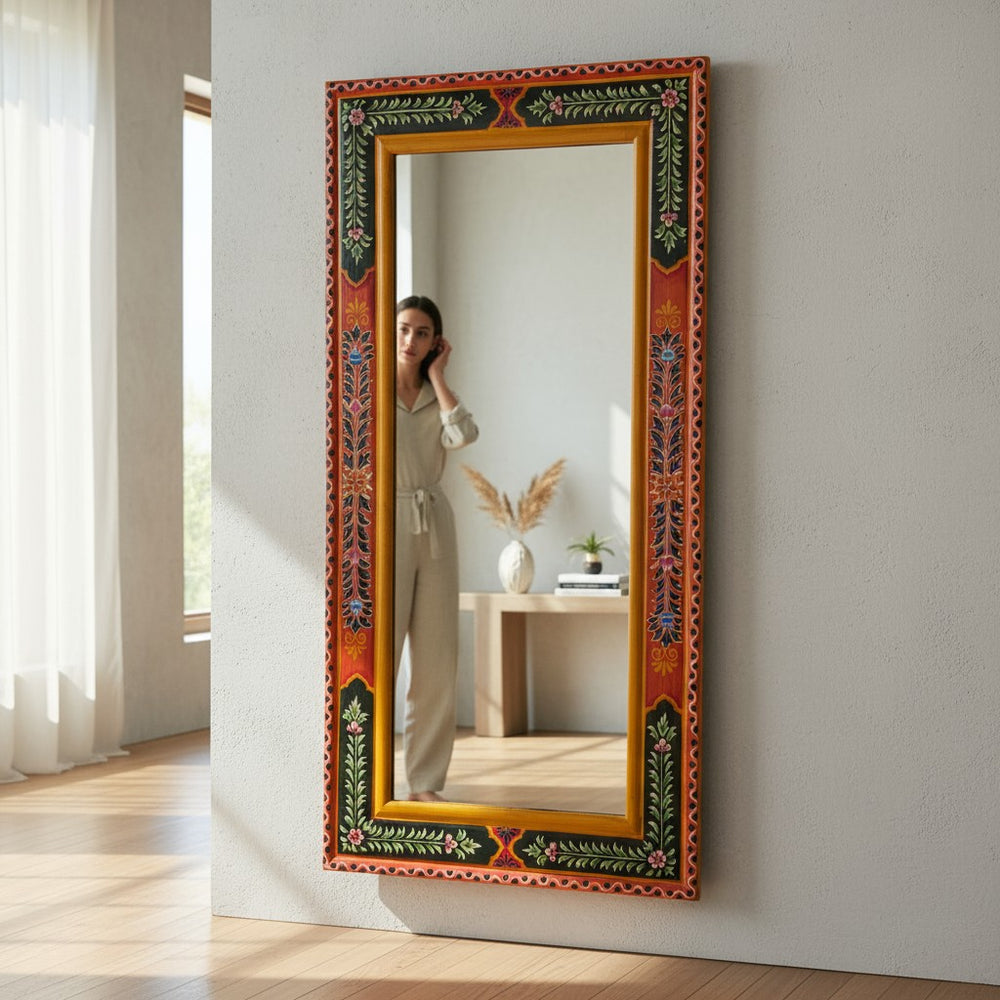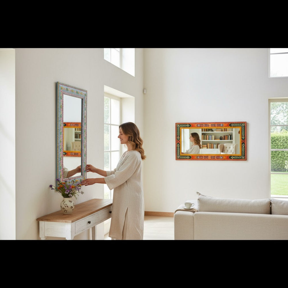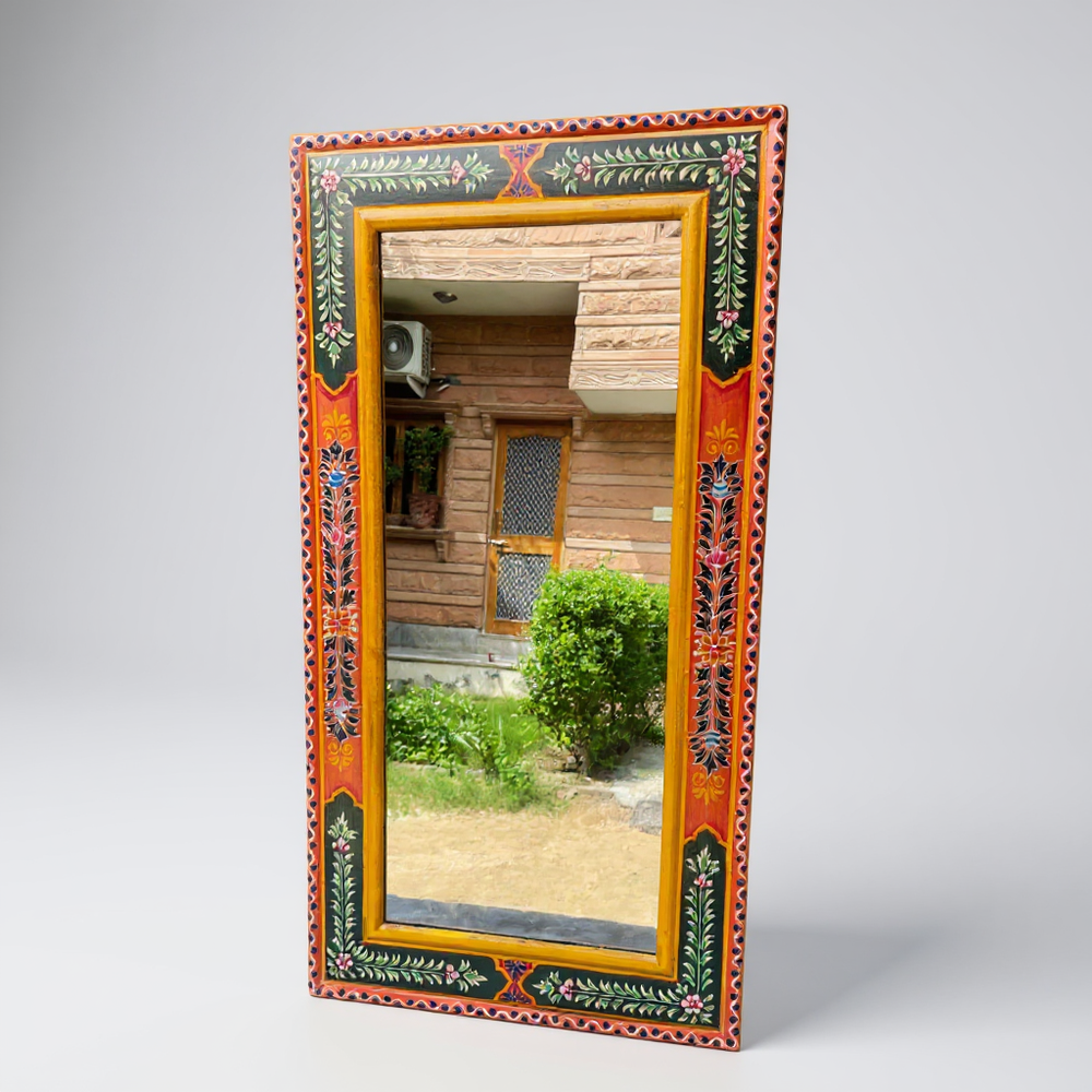 Add a touch of artistic charm to your home with this beautifully hand-painted wooden frame mirror. Designed to elevate any interior, it blends traditional craftsmanship with modern aesthetics—making it ideal for bedrooms, entryways, living rooms, or dressing corners. Its vibrant colors and floral motifs create a warm, inviting atmosphere while enhancing the overall visual appeal of your space.