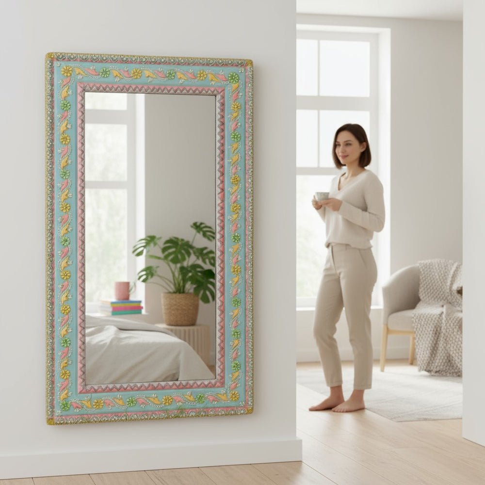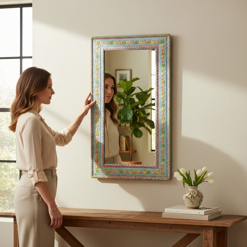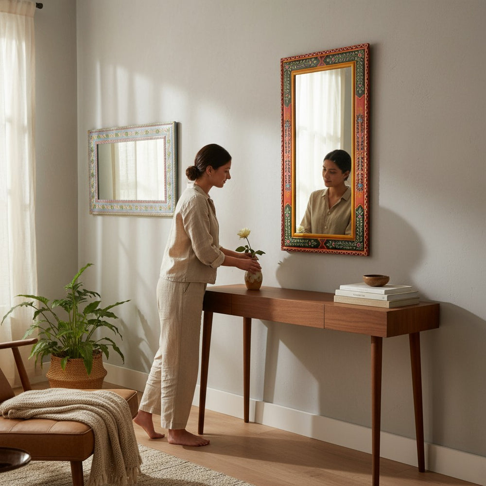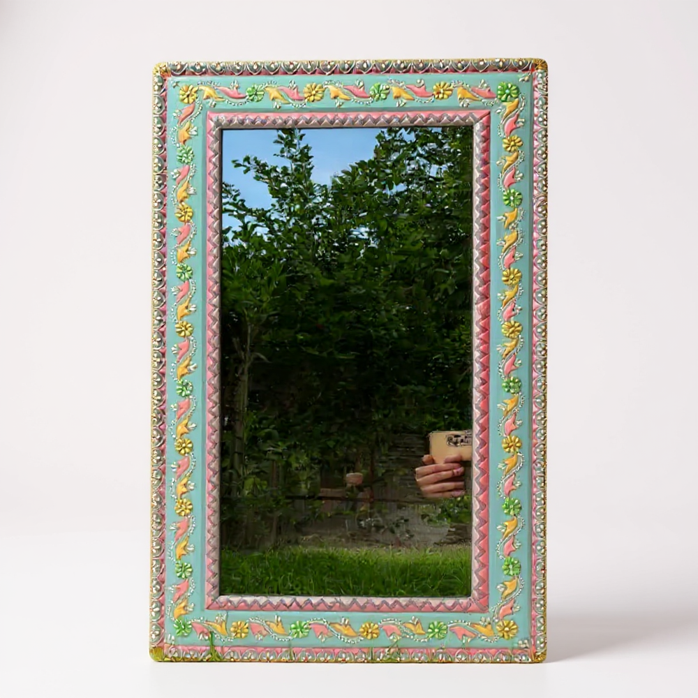 Add a touch of artistic charm to your home with this beautifully hand-painted wooden frame mirror. Designed to elevate any interior, it blends traditional craftsmanship with modern aesthetics—making it ideal for bedrooms, entryways, living rooms, or dressing corners. Its vibrant colors and floral motifs create a warm, inviting atmosphere while enhancing the overall visual appeal of your space.