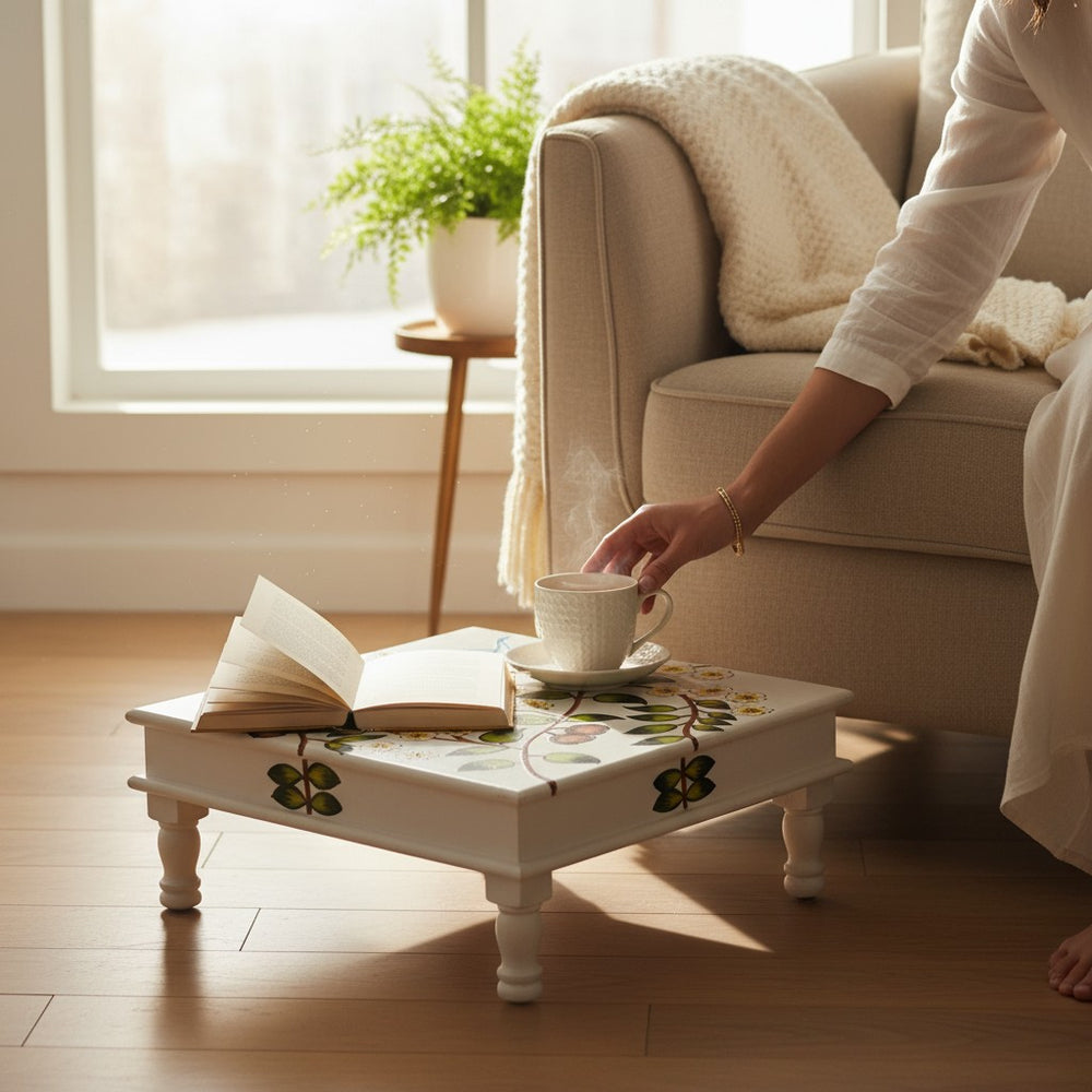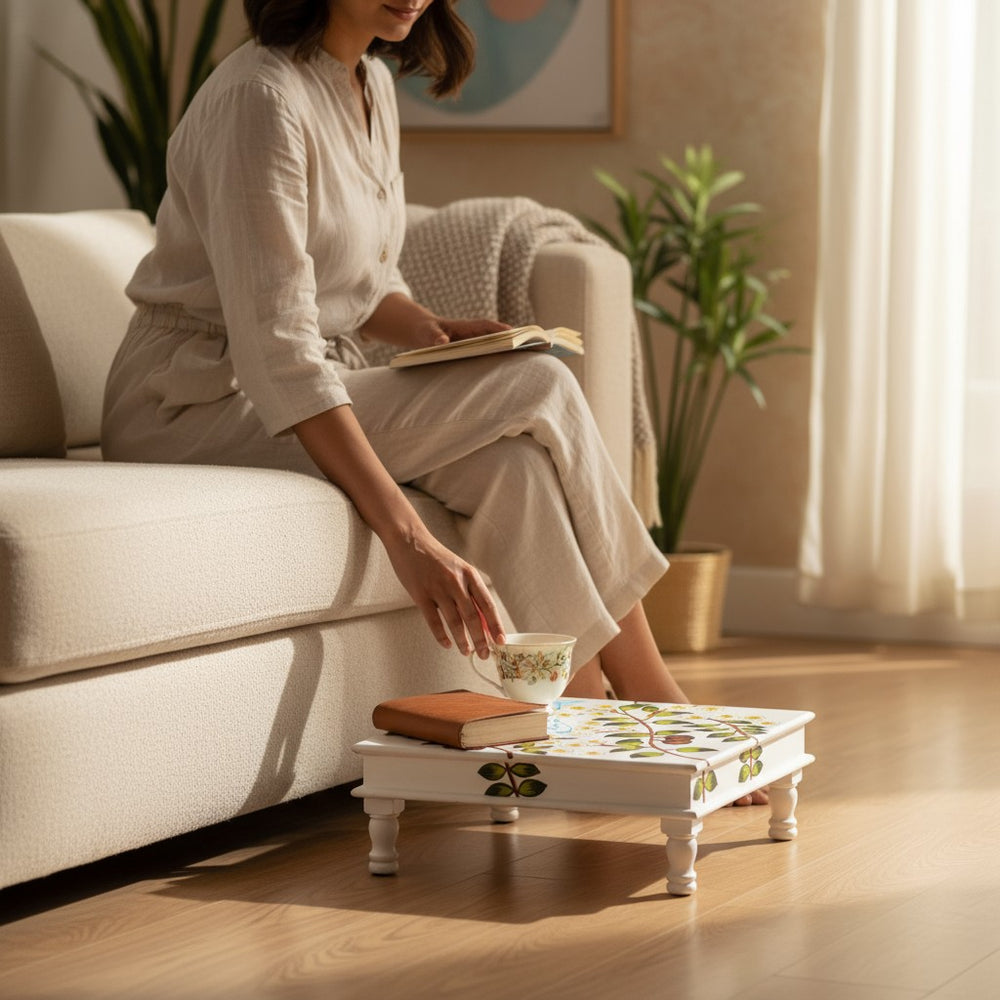 Enhance your sacred space with this Hand-Painted Indian Pooja Bajot, beautifully crafted in soothing white with delicate floral artwork. Perfect for placing idols, diya lamps, incense, and holy offerings, this elegant bajot adds a serene and pure ambience to your daily worship rituals. Its compact, low-height design blends effortlessly into modern homes while retaining the charm of traditional Indian craftsmanship—ideal for meditation corners, home temples, and spiritual décor.