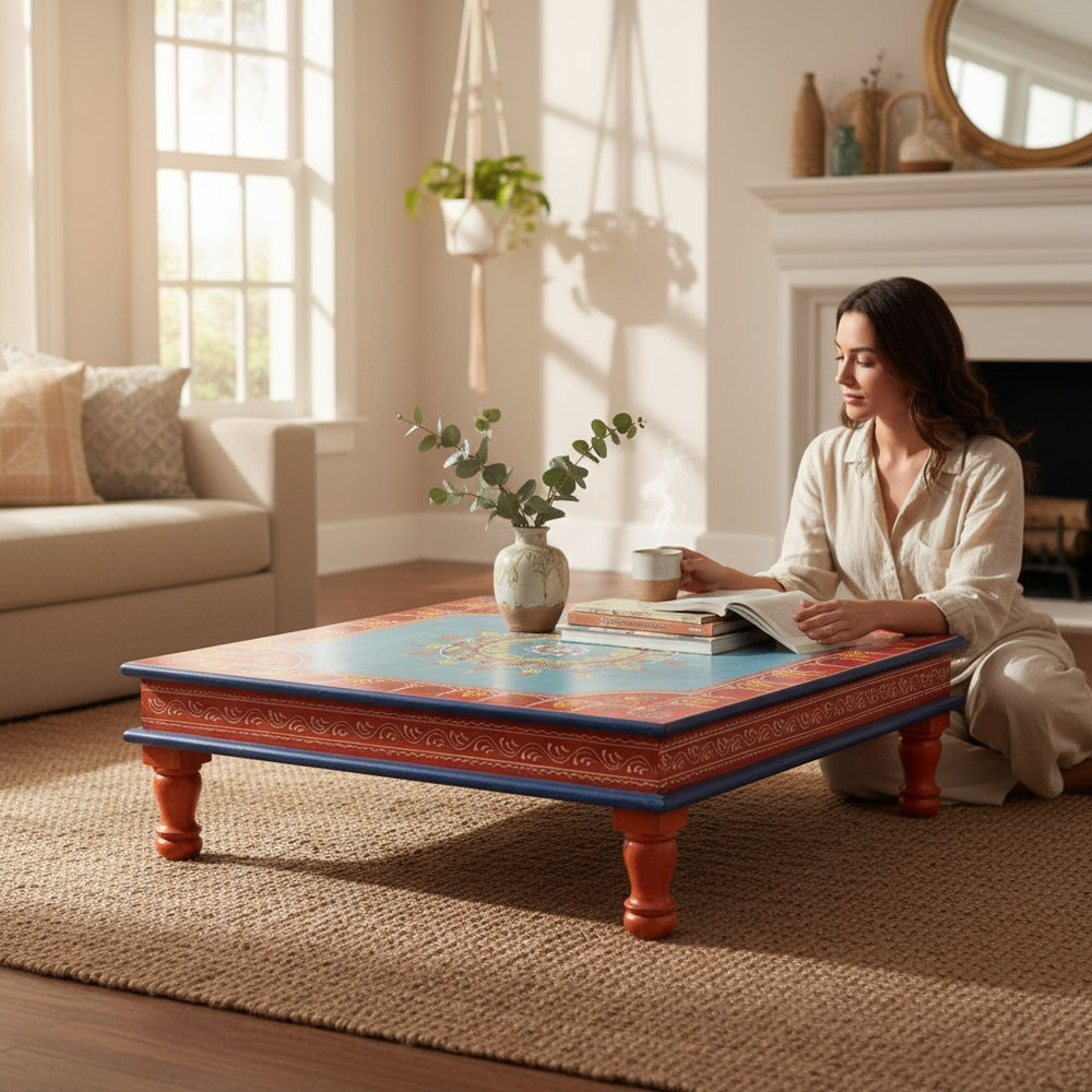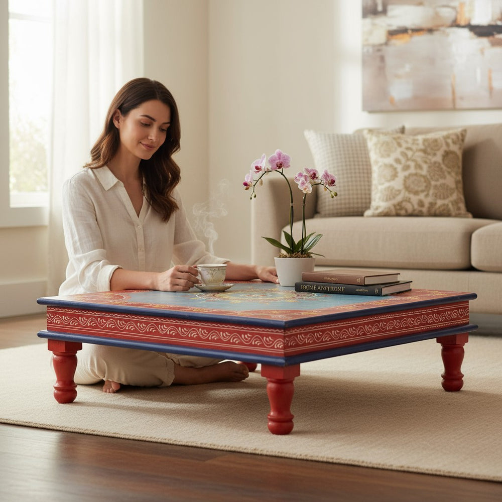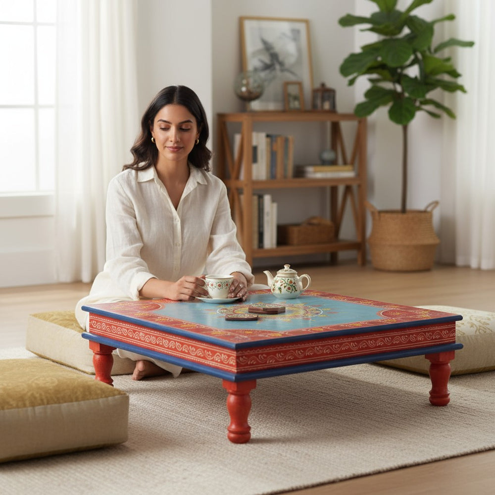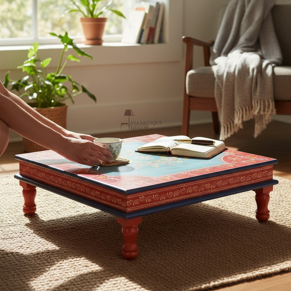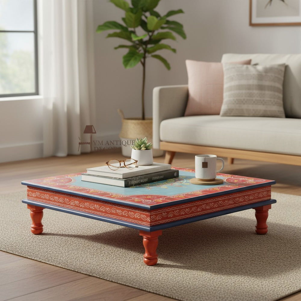 Add a touch of traditional Indian elegance to your sacred space with this Hand-Painted Wooden Pooja Bajot, beautifully adorned with vibrant rangoli-inspired artwork. Designed for daily rituals, diya lighting, idol placement, and festive ceremonies, this low-height platform brings a serene and grounded ambience to home temples, meditation corners, and spiritual décor settings. Its rich colors, artisanal detailing, and sturdy craftsmanship make it a meaningful and decorative addition to any home.