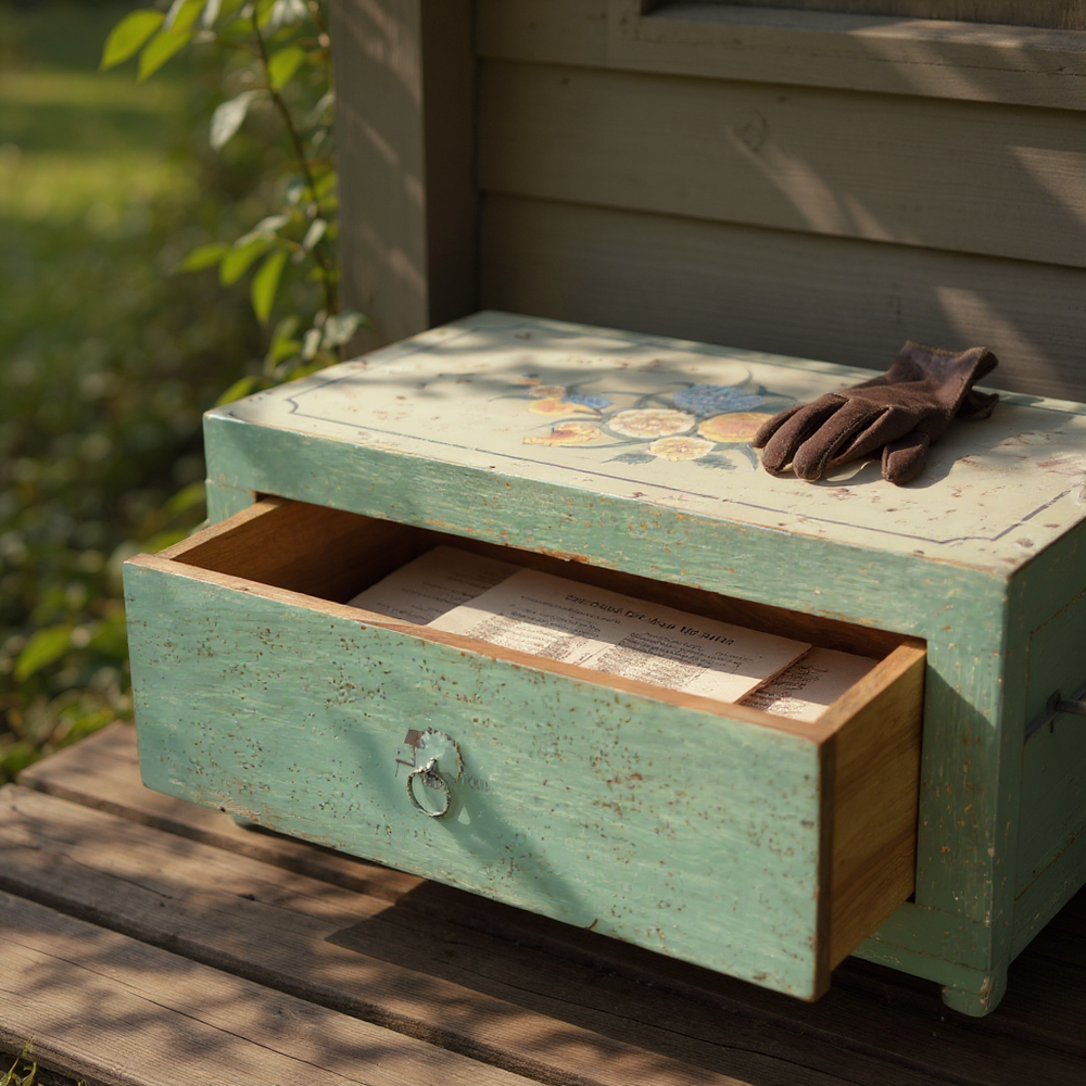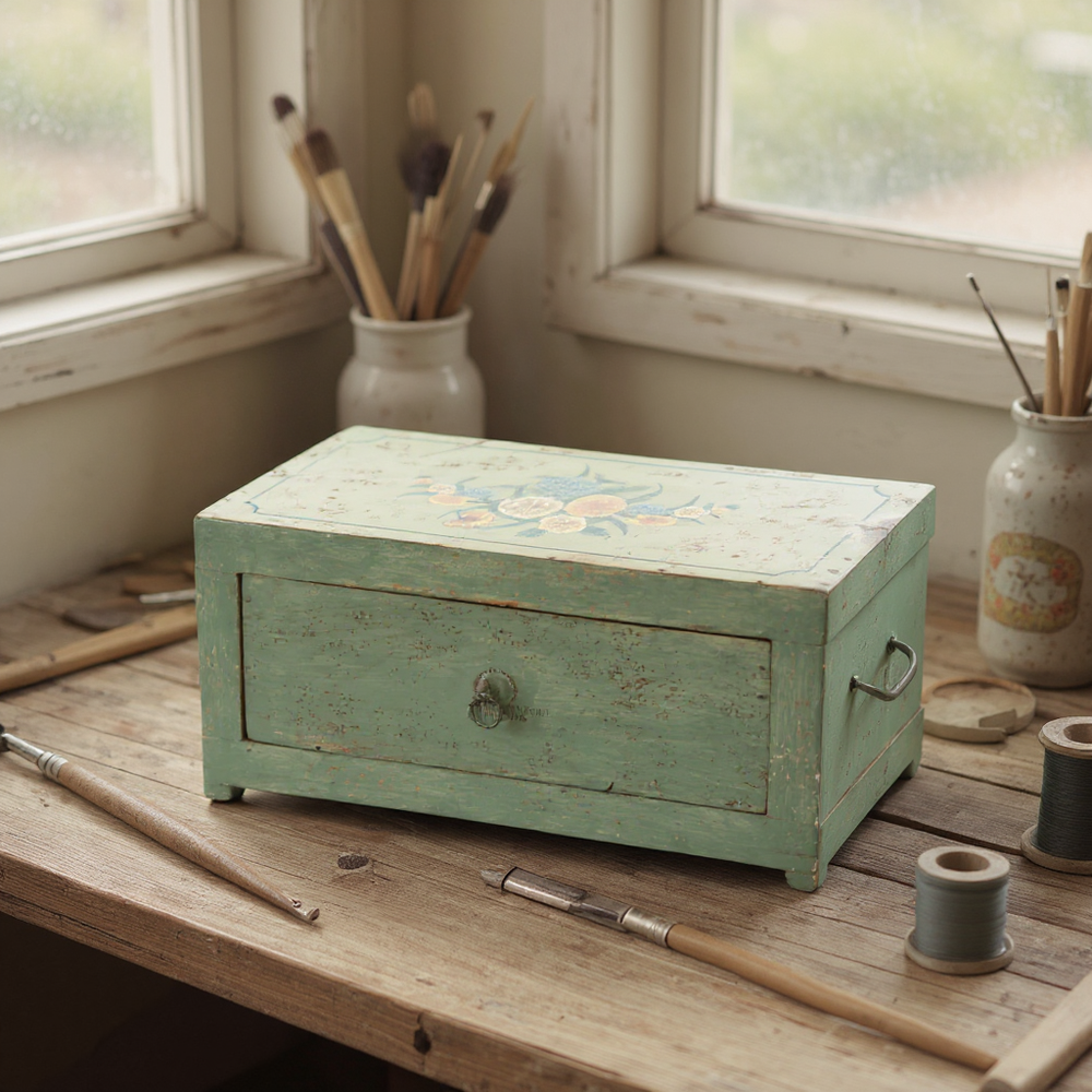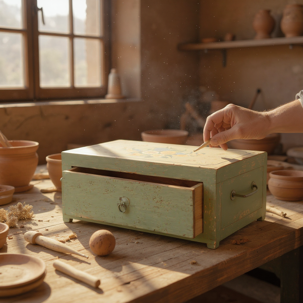 Bring a touch of rustic charm to your bedroom with this beautifully handcrafted wooden storage box. Featuring an antique distressed finish, floral hand-painting, and a spacious pull-out drawer, it adds both elegance and utility to your dressing table, bedside, or creative workspace. Perfect for storing jewelry, accessories, letters, keepsakes, and small essentials, this artisanal piece enhances the cozy, warm feel of any room while reflecting timeless craftsmanship.
