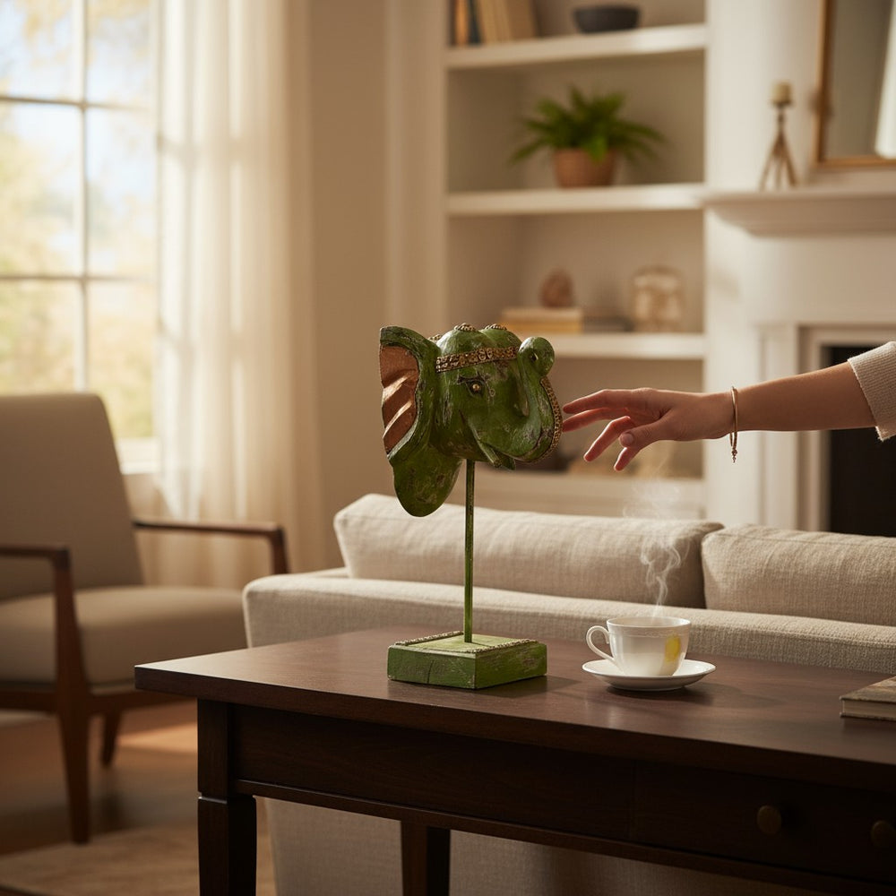 Enhance your living space with this Handcrafted Elephant Head Decorative Statue, beautifully designed to bring cultural charm and artistic elegance to your table décor. Mounted on a sturdy stand, this artisan-made piece serves as a stunning accent for console tables, coffee tables, office desks, and shelves. Its hand-painted detailing and rustic finish add warmth and personality to contemporary as well as traditional interiors.