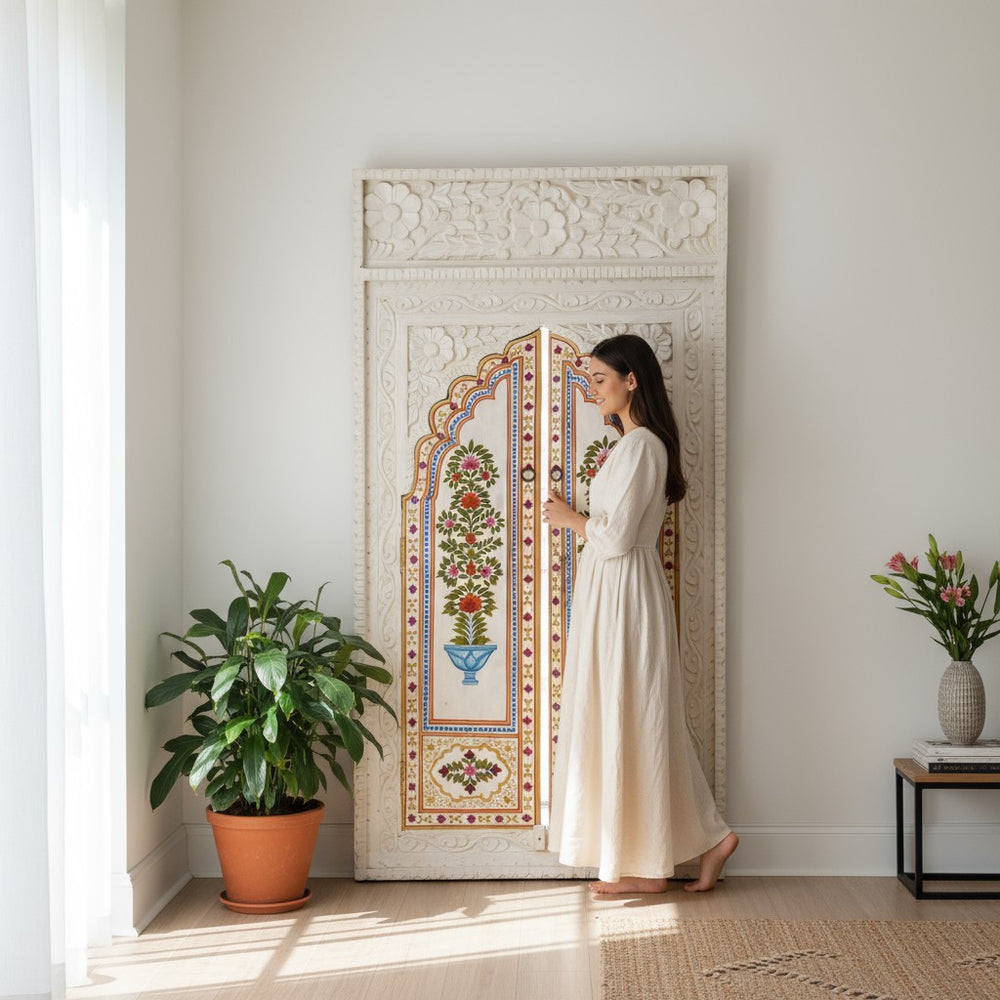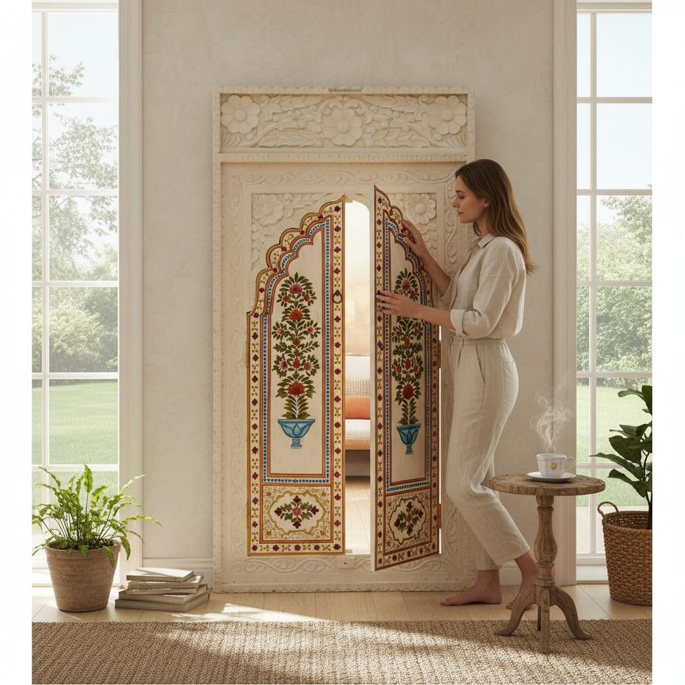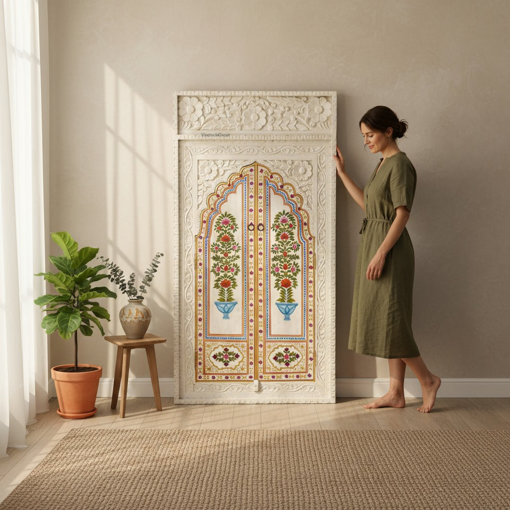 Transform your home into a serene, heritage-inspired haven with this handcrafted full-length Jharokha. Designed with intricate floral carving and beautifully hand-painted doors, it brings the elegance of traditional Indian architecture into modern living spaces. Whether used as a statement wall decor, a faux window element, or a photo backdrop, it instantly adds warmth, charm, and cultural richness to any room. Perfect for creating a peaceful aesthetic in living rooms, hallways, entryways, and meditation corners.