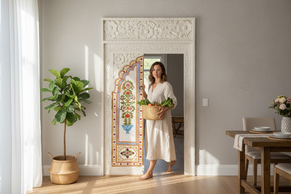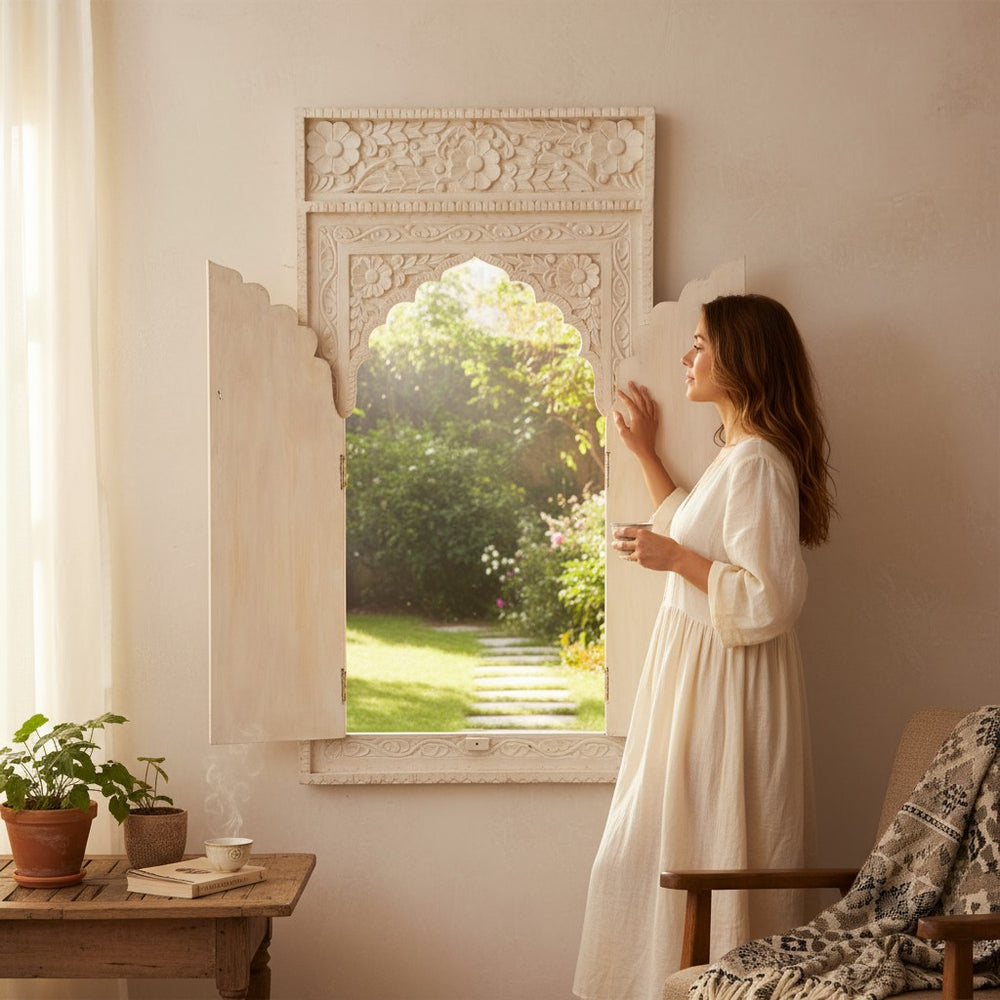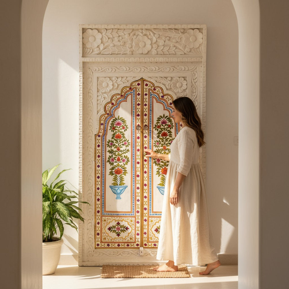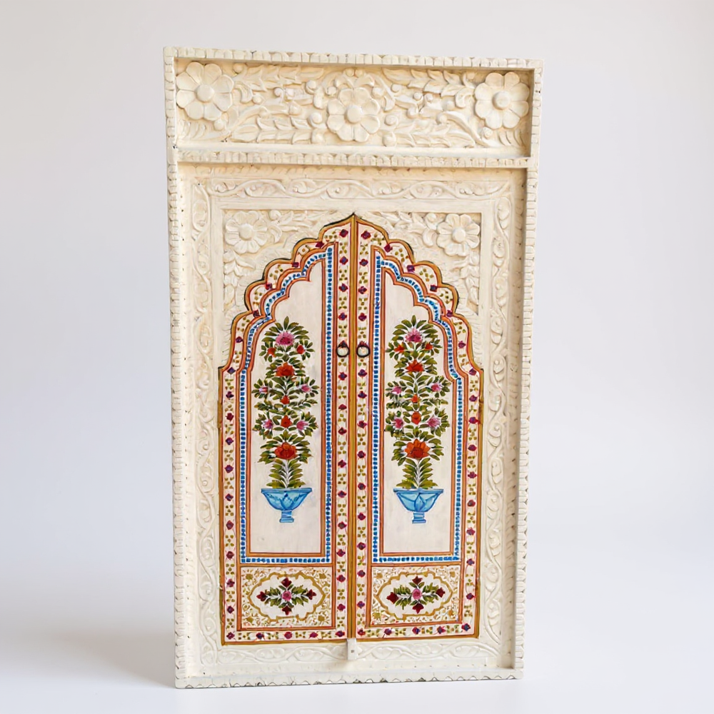 Transform your home into a serene, heritage-inspired haven with this handcrafted full-length Jharokha. Designed with intricate floral carving and beautifully hand-painted doors, it brings the elegance of traditional Indian architecture into modern living spaces. Whether used as a statement wall decor, a faux window element, or a photo backdrop, it instantly adds warmth, charm, and cultural richness to any room. Perfect for creating a peaceful aesthetic in living rooms, hallways, entryways, and meditation corners.