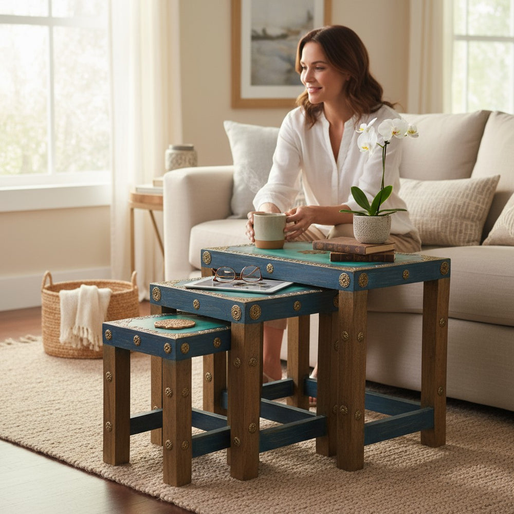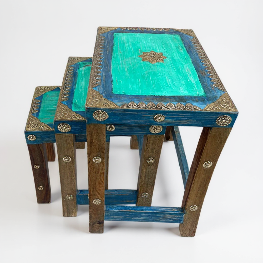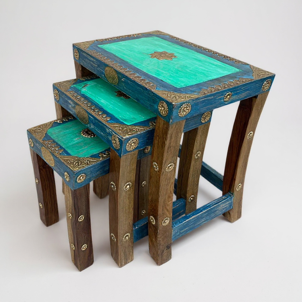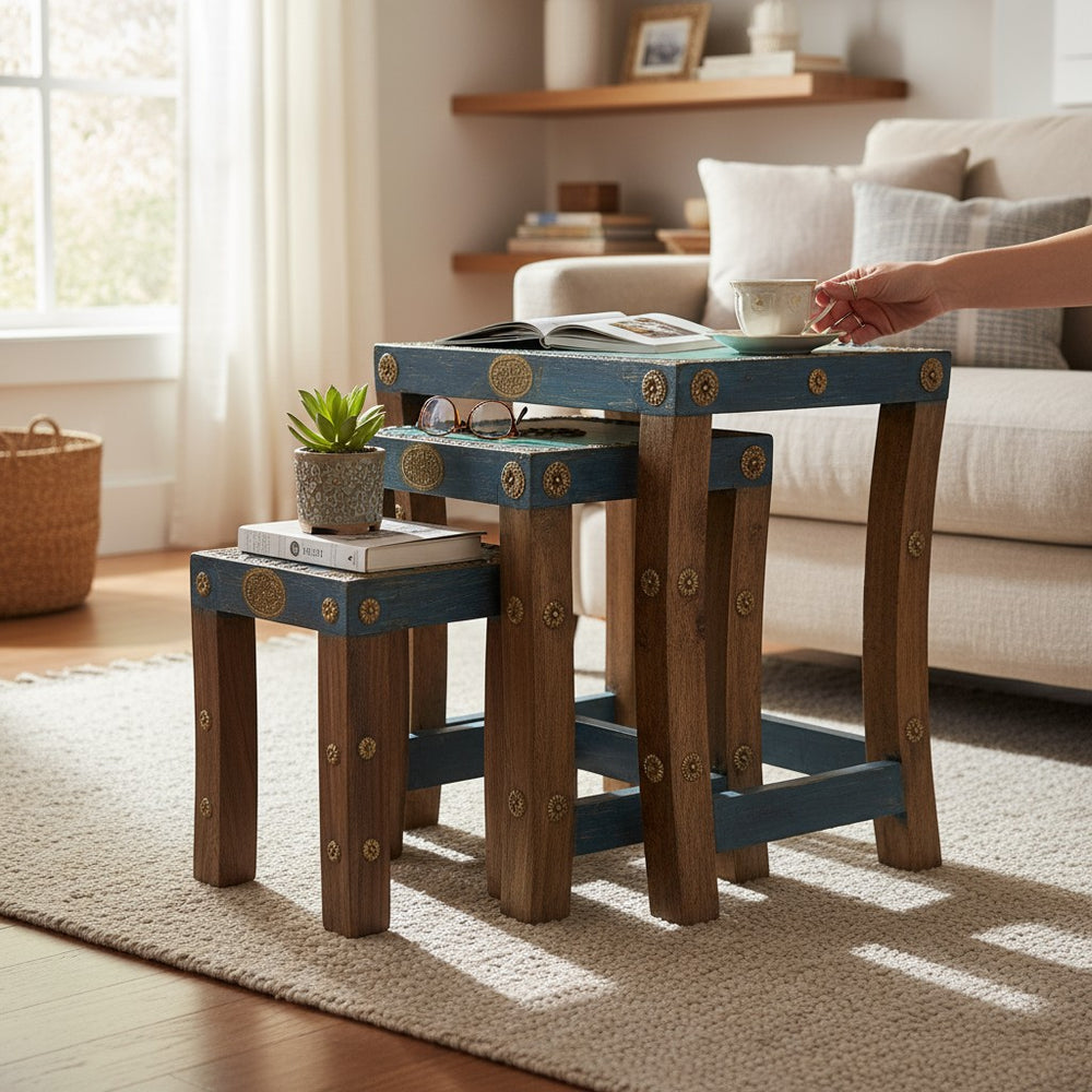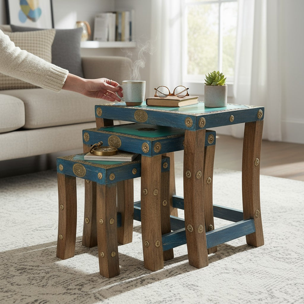 Bring warmth, color, and artisan charm into your living area with this beautifully handcrafted nesting table set. Designed with rustic wooden legs, turquoise-blue distressed tops, and decorative brass accents, these tables add a perfect blend of traditional craftsmanship and modern comfort. Ideal for tea time, reading corners, décor display, or compact living needs, they nest smoothly to save space while elevating your home’s aesthetic.