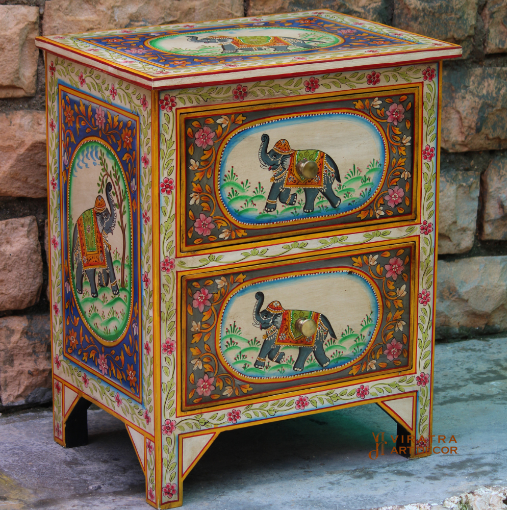 Elephant Paintings: The standout feature of this piece is the hand-painted elephant designs. These motifs often symbolize strength, wisdom, and good luck, and they add a vibrant, exotic touch to the furniture. The designs might include detailed patterns in colorful tones or more subtle, monochromatic illustrations.