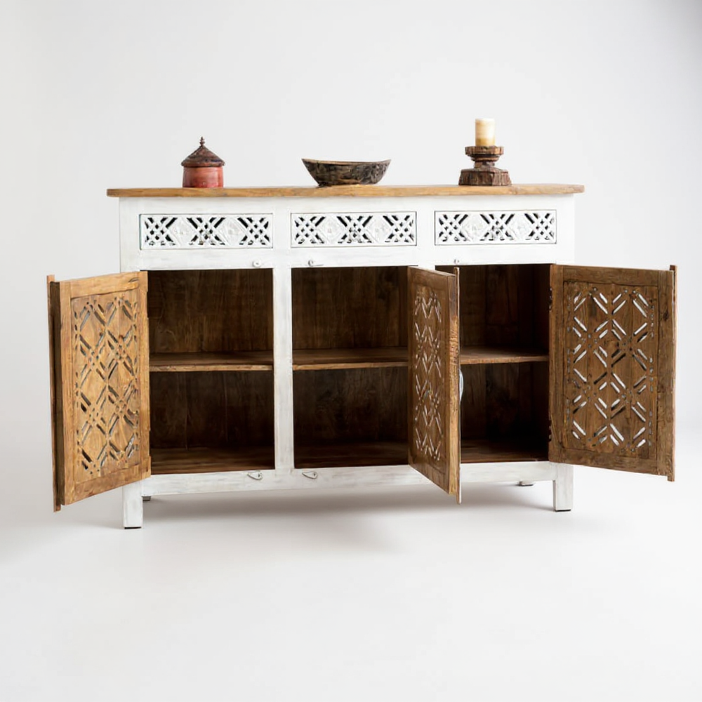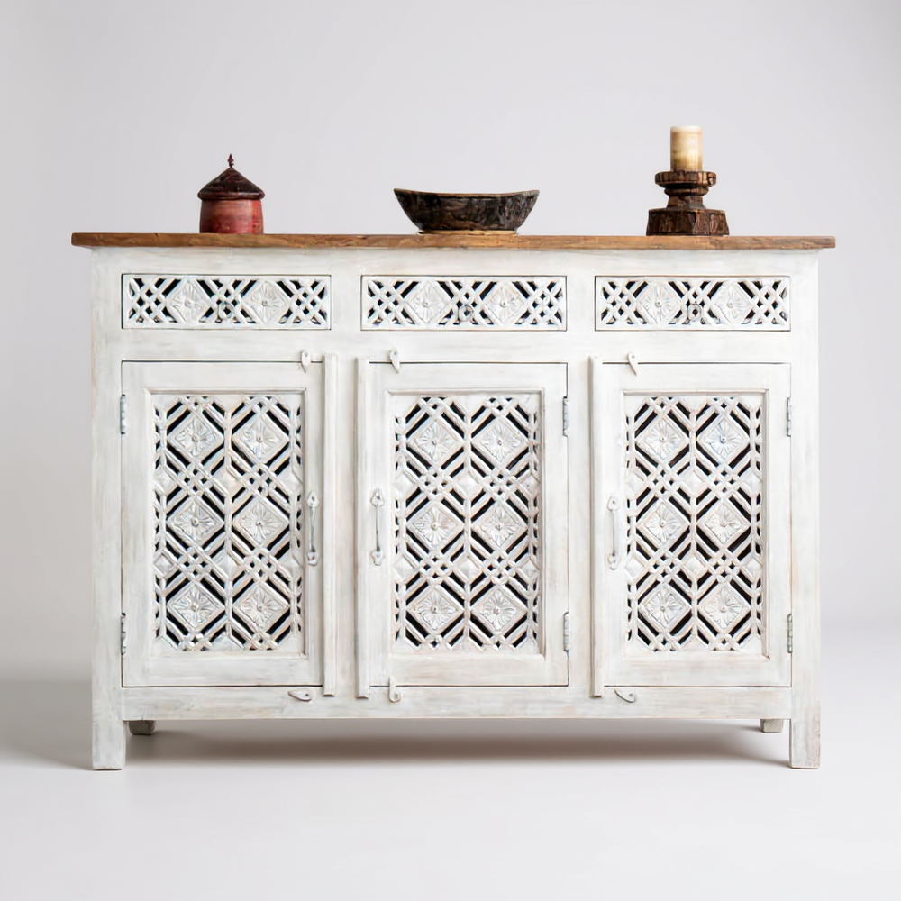Bring timeless elegance to your home with this Indian Hand Carved White Sideboard, handcrafted from solid mango wood by skilled artisans of Rajasthan, India. Each panel features intricate lattice carving, beautifully enhanced with a distressed white finish that highlights its artistic detailing and natural wood grains.
