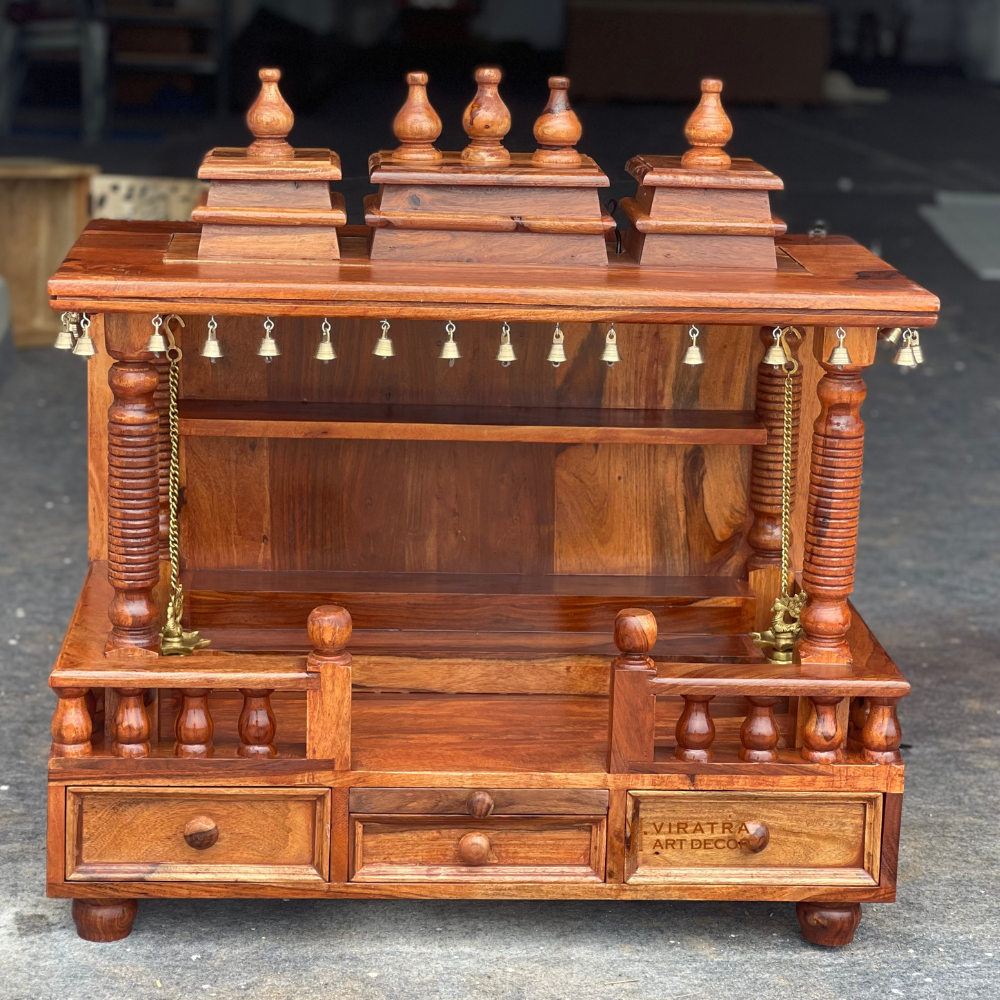 Sheesham Wood Mandir, designed for wall mounting. Handcrafted from premium Sheesham wood, this elegant pooja temple features detailed craftsmanship, brass bells, and an Annapakshi lamp—symbolizing prosperity and divine grace.