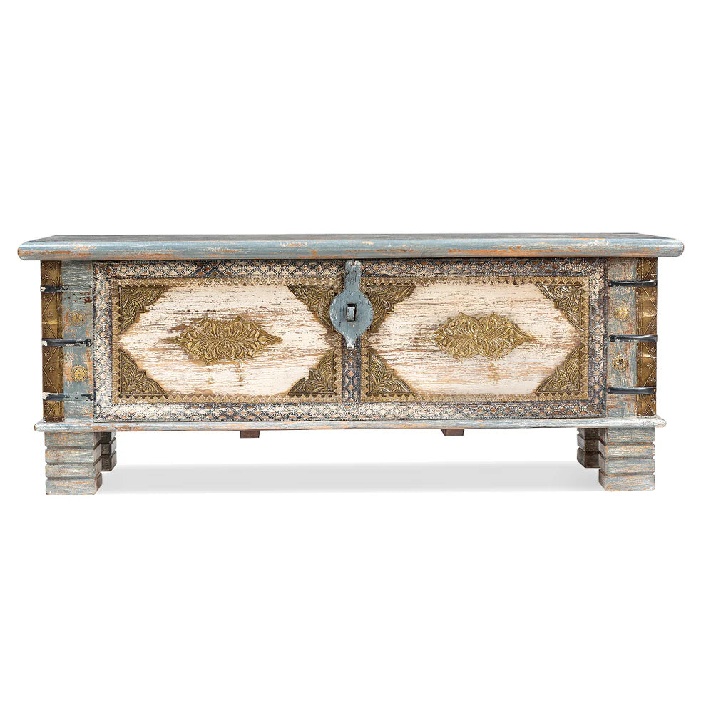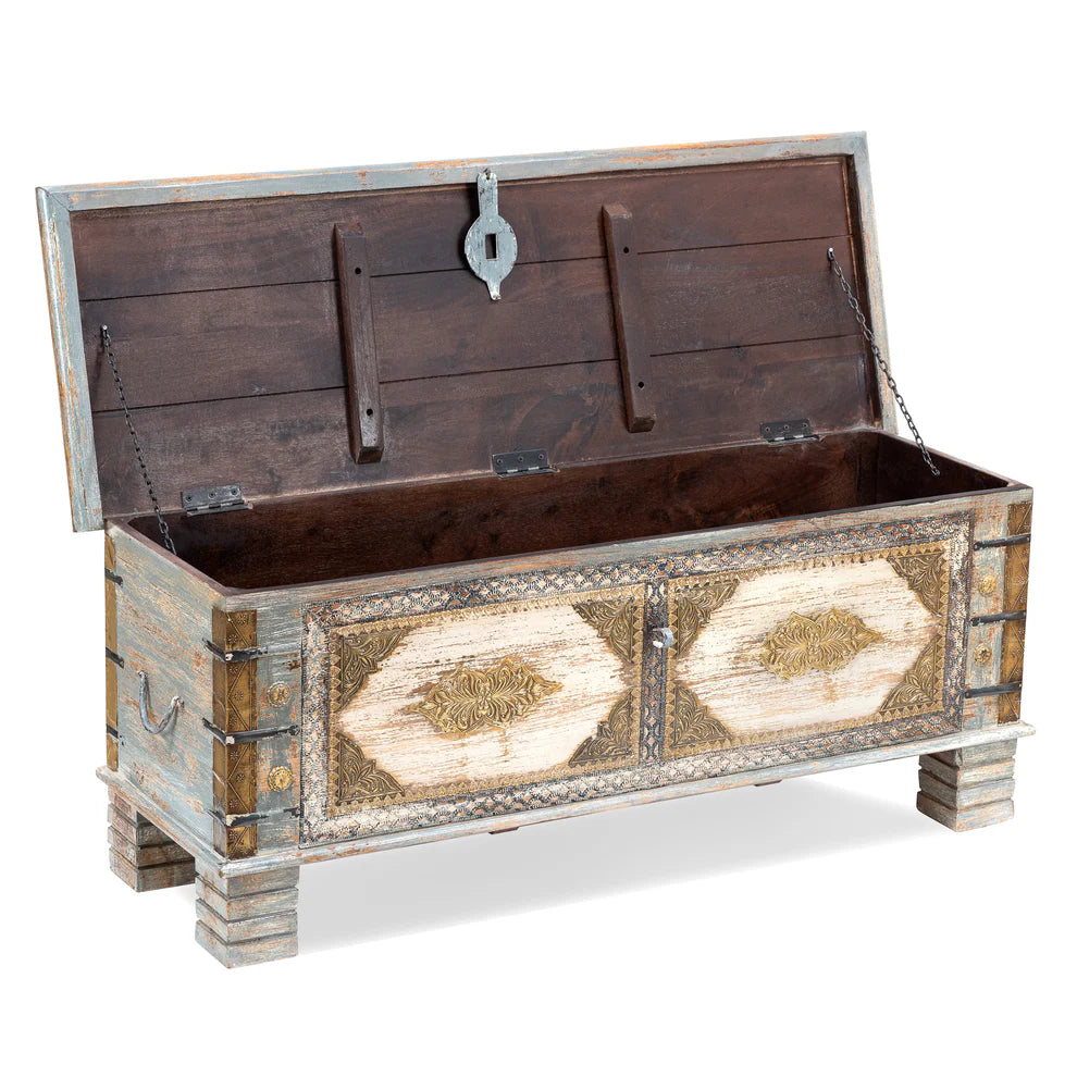 Our Jax Large Wooden Storage Trunk is made from mango wood and finished in a distressed grey color. It's perfect for adding a bold statement to your living room. The brass accent will complement aesthetics perfectly. This wooden storage trunk makes a great coffee table or an art piece in its own right. Use this storage trunk box as a way to save some space by storing miscellaneous items like magazines, books or toys.