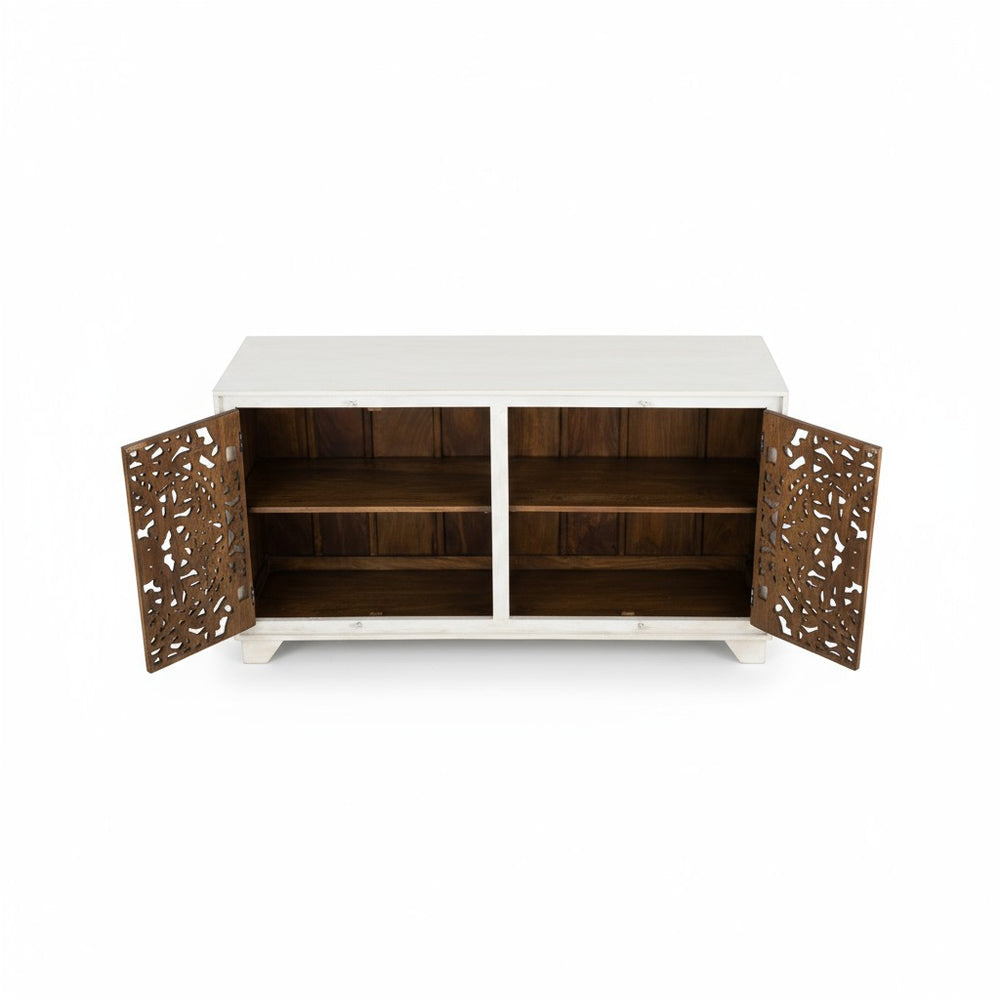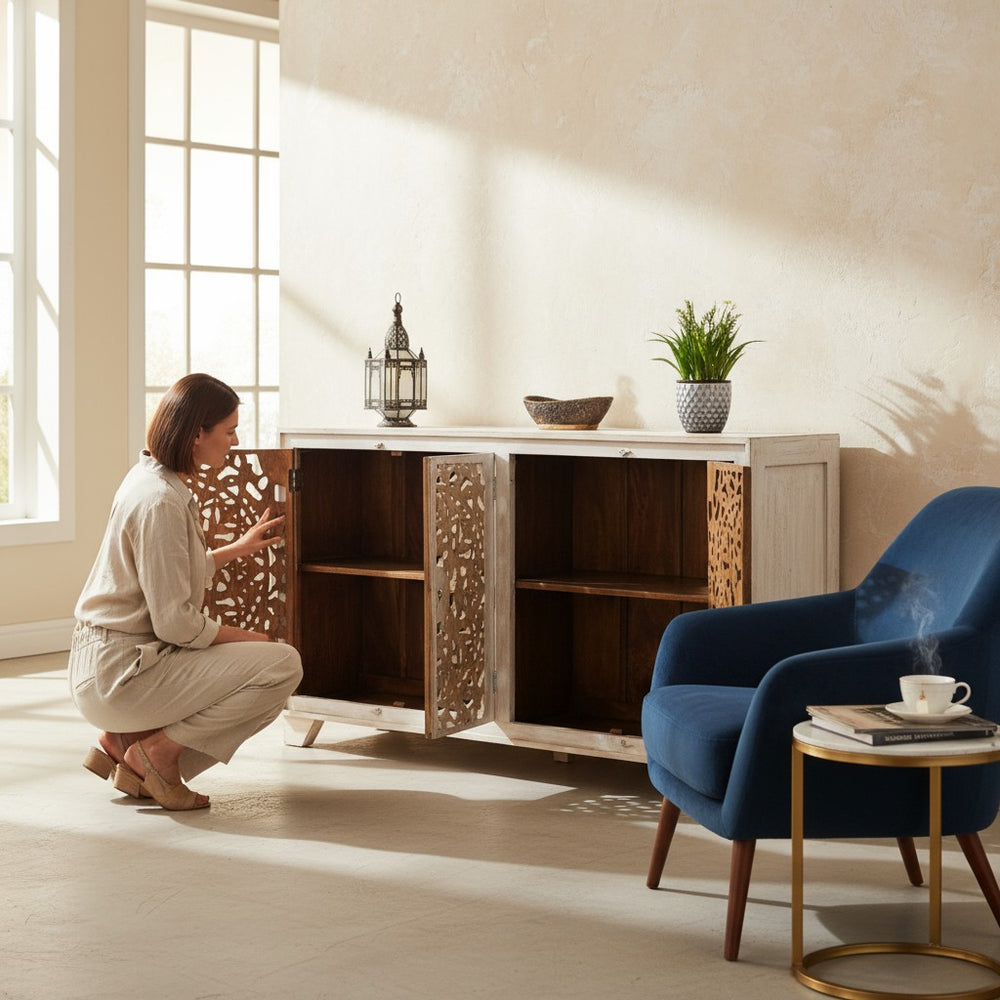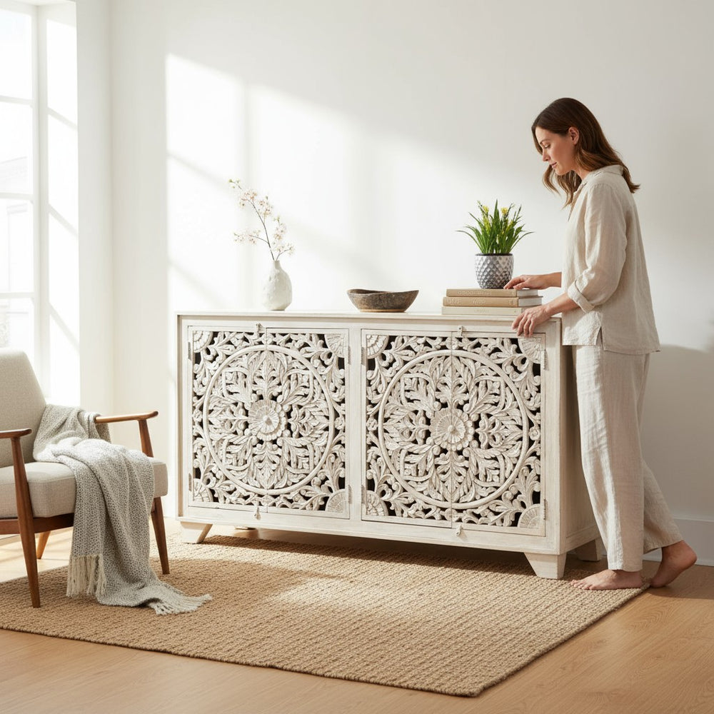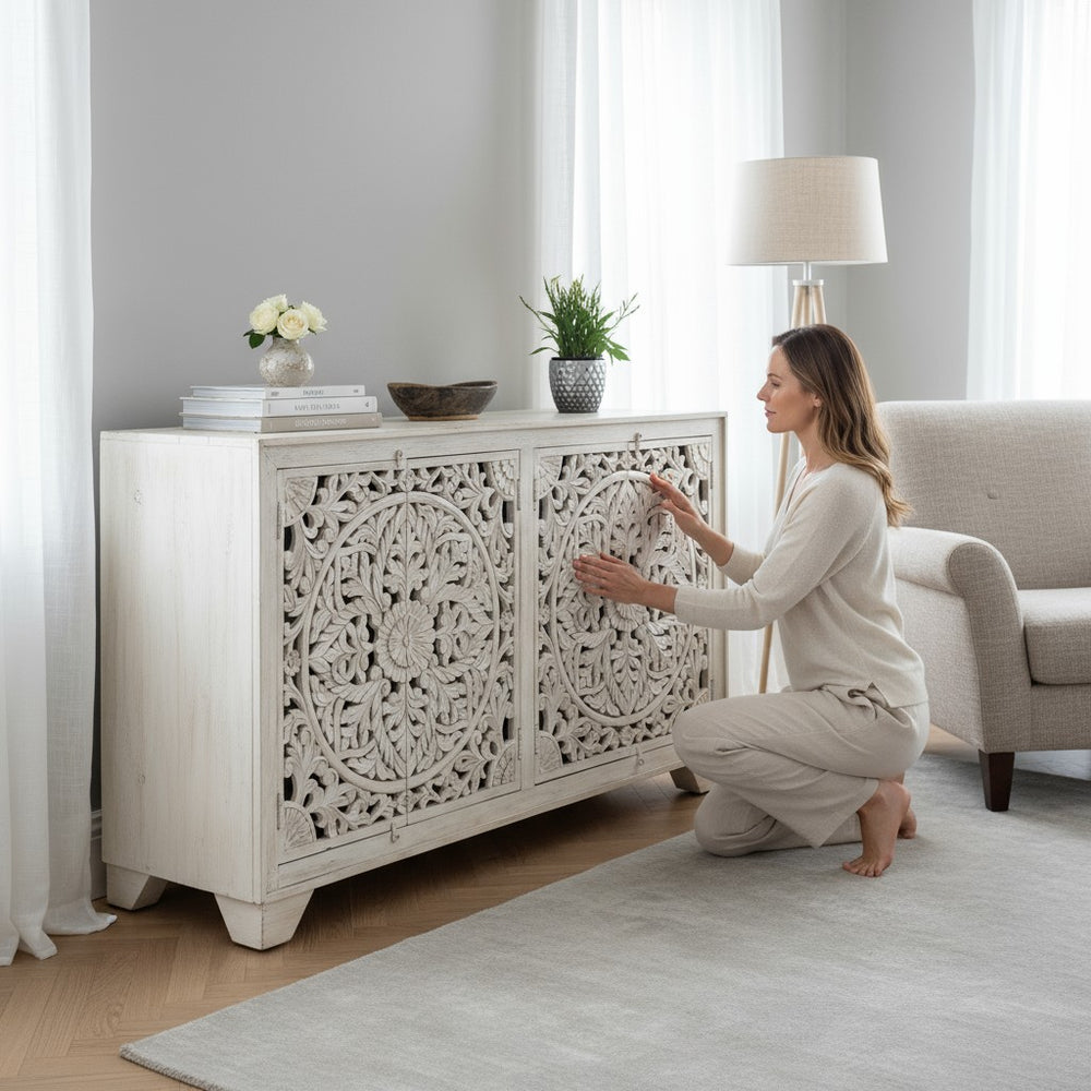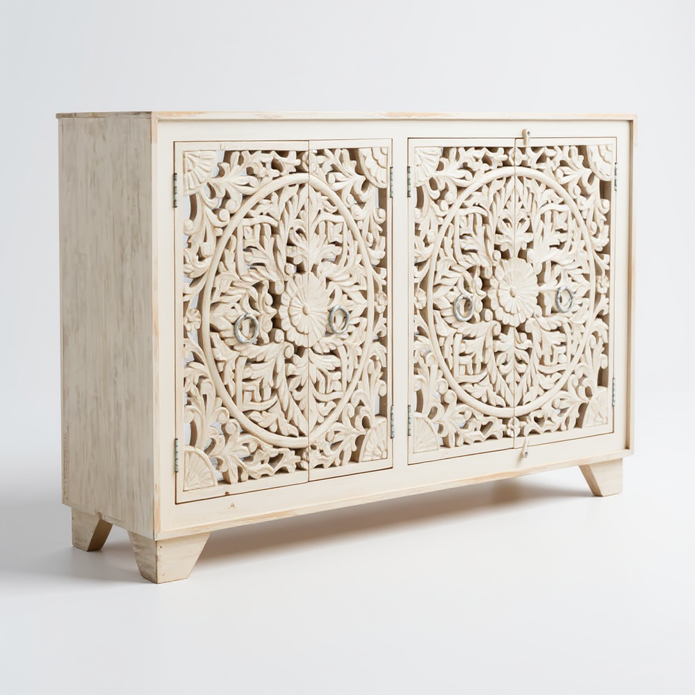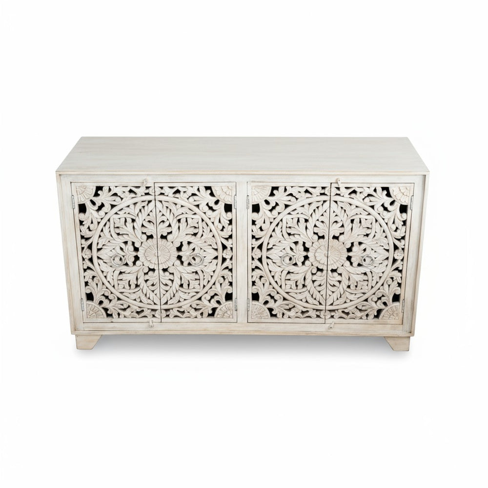 Bring timeless artistry and serene sophistication to your home with this Hand-Carved Whitewashed Wooden Sideboard, a masterpiece of traditional Indian craftsmanship. Each cabinet door showcases intricately carved floral and circular mandala motifs, hand-finished in a distressed whitewash that highlights the natural beauty and texture of solid mango wood.