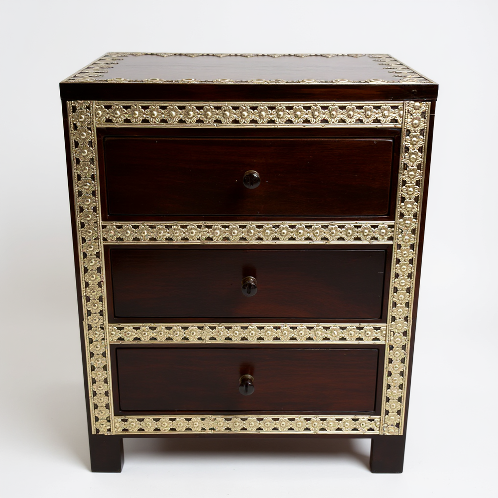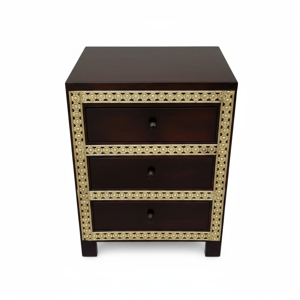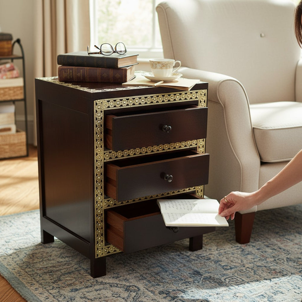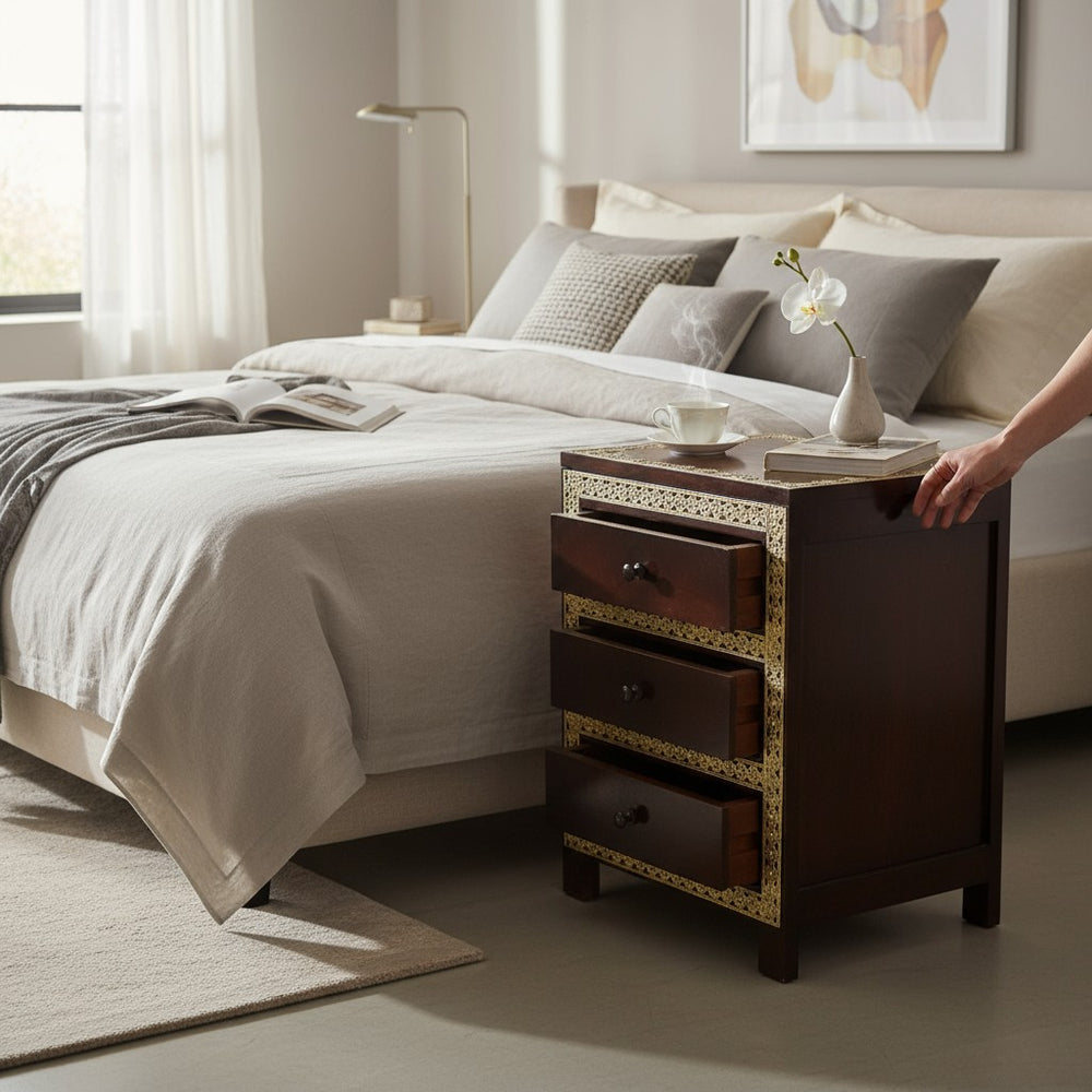 Elevate your bedroom décor with this elegant 3-drawer bedside table, blending luxury craftsmanship with everyday functionality. The rich dark wood finish paired with intricate brass-style floral inlay detailing adds a touch of timeless sophistication, making it a standout accent in both modern and traditional interiors. Perfect for keeping nighttime essentials close, this bedside table brings style, convenience, and premium craftsmanship to any living space.