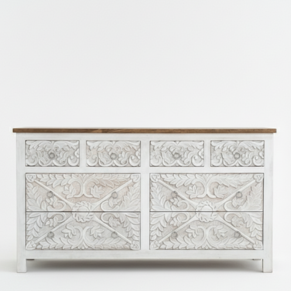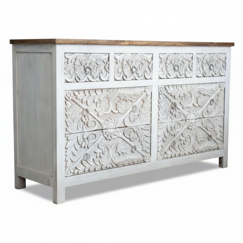 Bring refined artisan beauty into your home with this handcrafted 8-drawer sideboard, featuring exquisite floral carvings and a warm, rustic two-tone finish. Its spacious drawer layout makes it perfect for organizing everyday essentials while adding a soft boho-luxury charm to any living room, bedroom, hallway, or dining space. A true blend of function and craftsmanship, this sideboard elevates interiors with timeless elegance.
