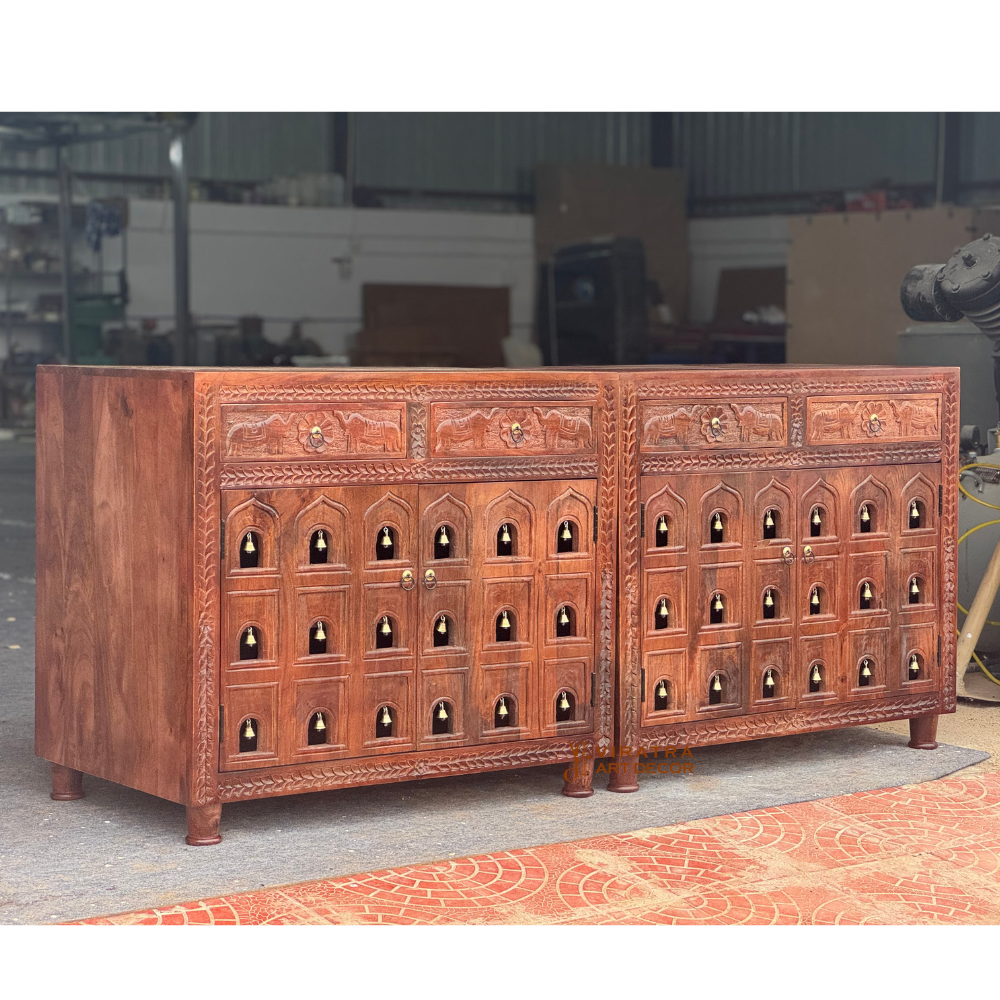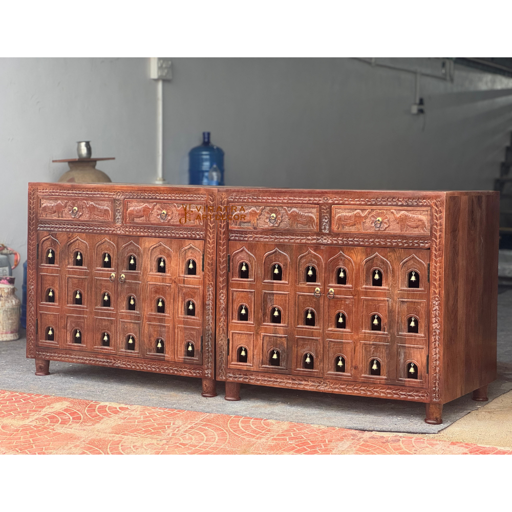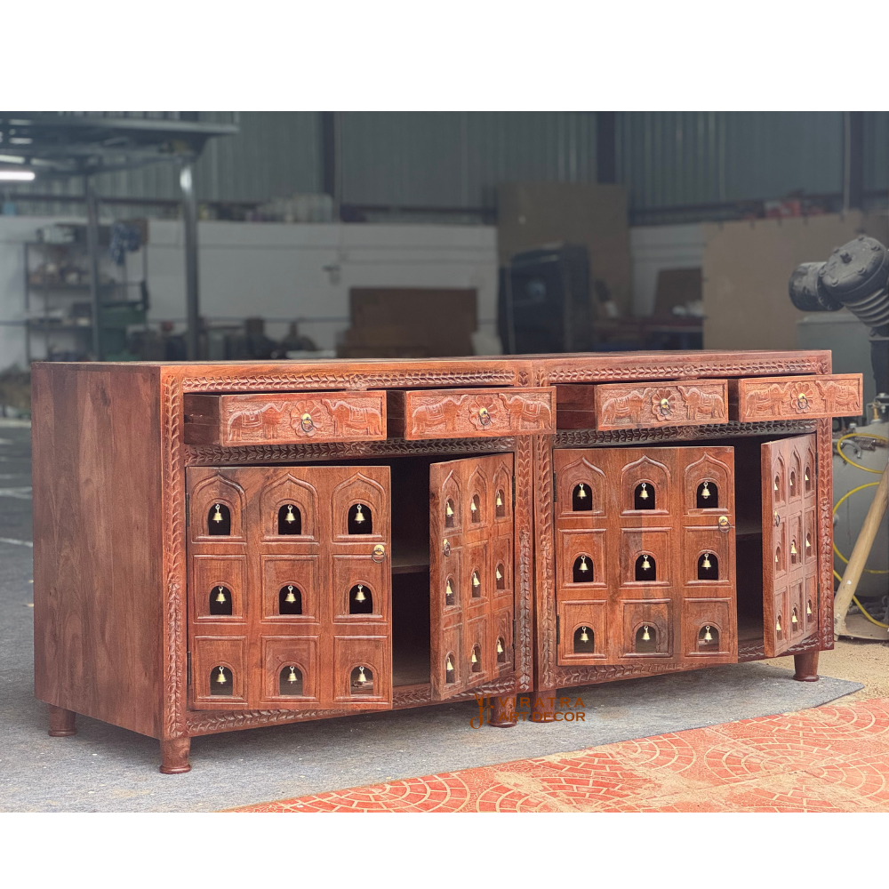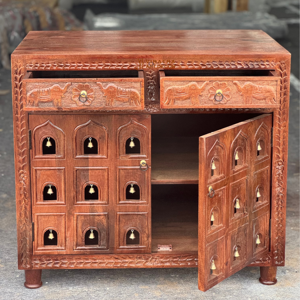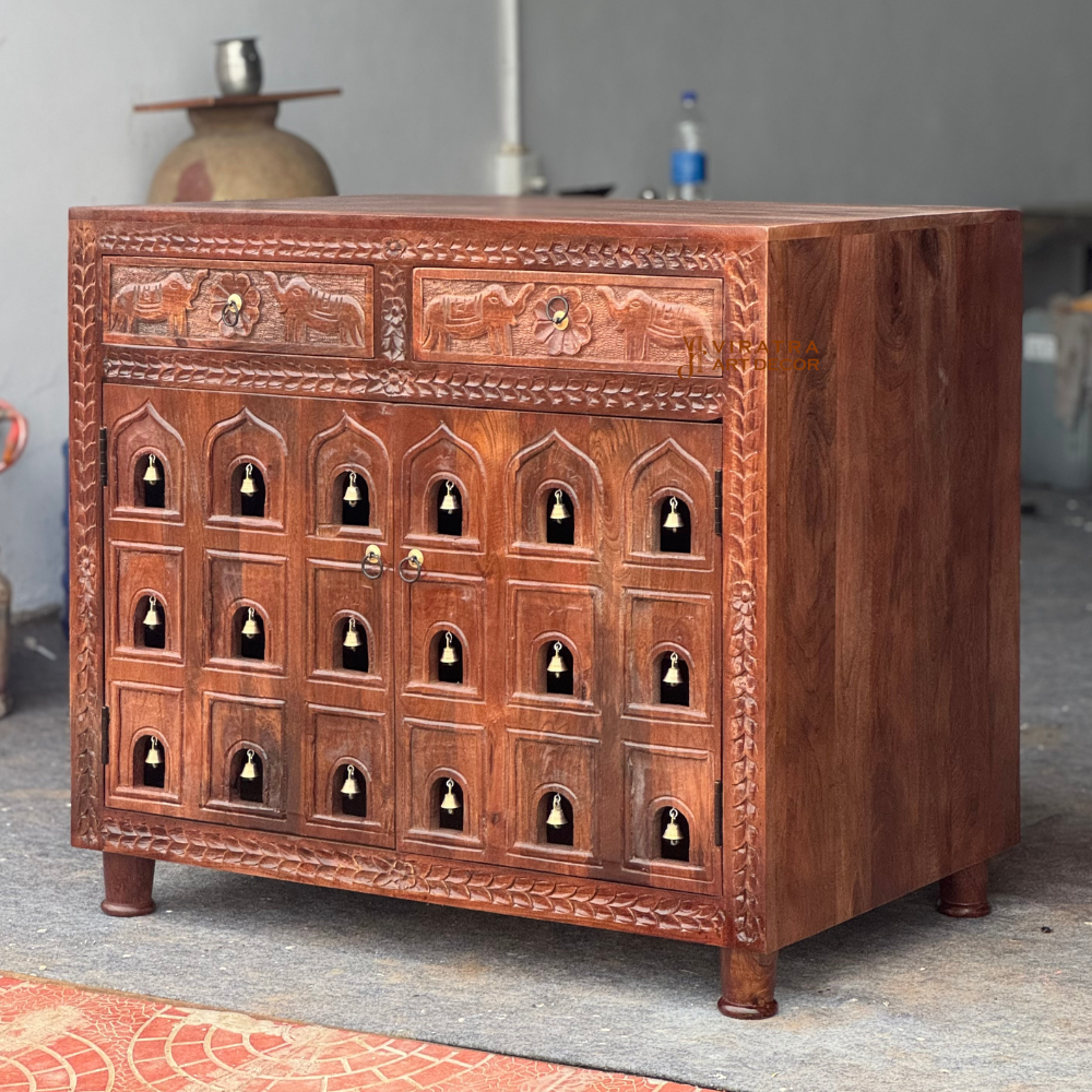 Featuring four spacious drawers, it offers ample space to store essentials, while the brass bells adorning the cabinet doors add a divine charm and a soothing spiritual element. The fine woodwork, combined with the elegant brass detailing, makes it a standout piece for any living room, hallway, or meditation space.