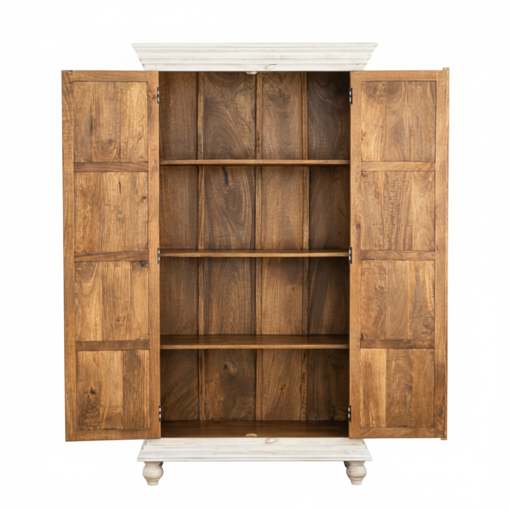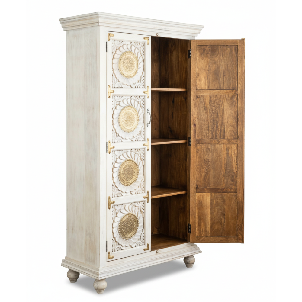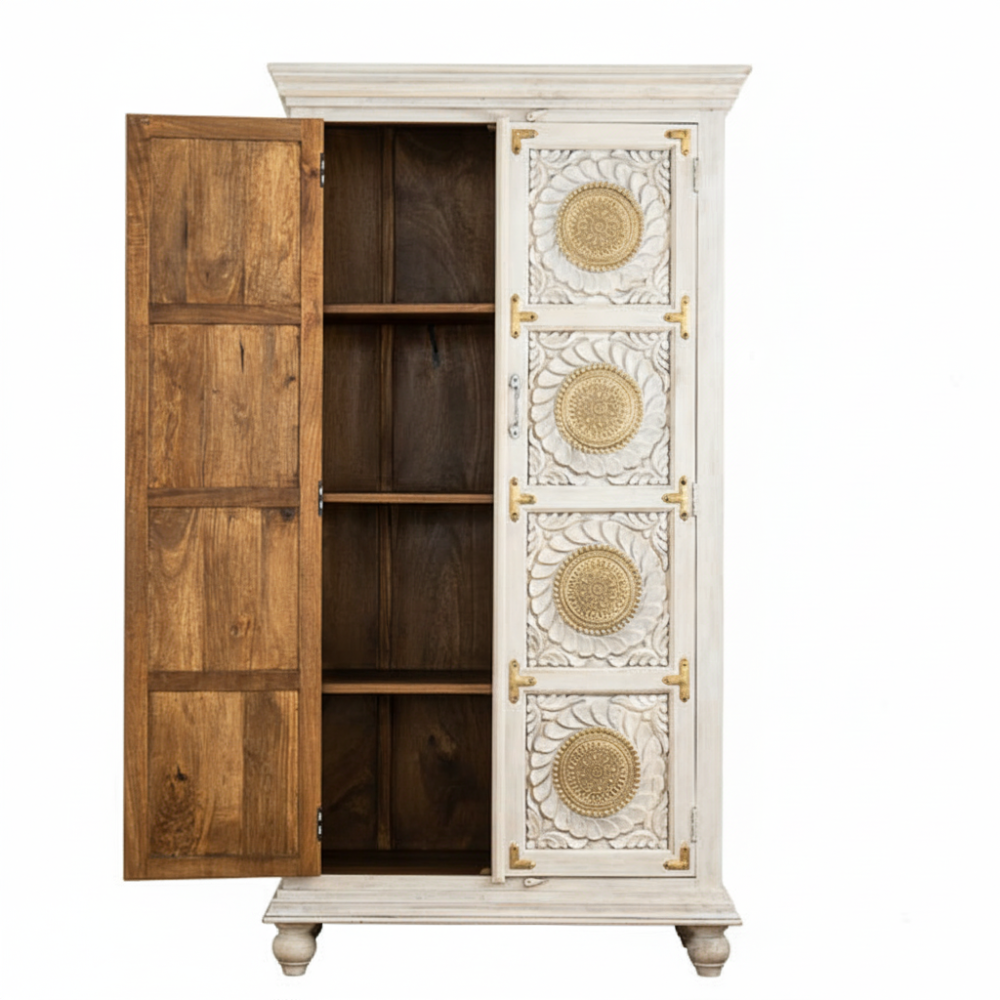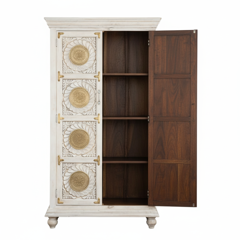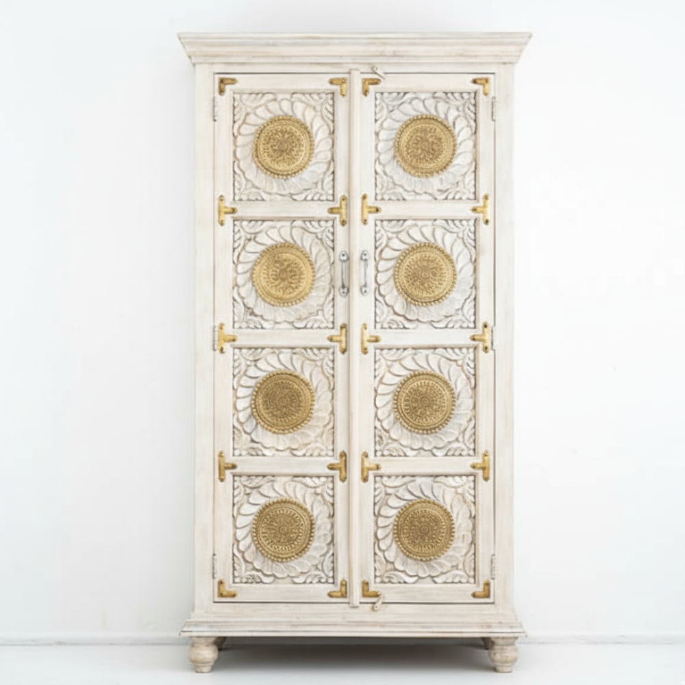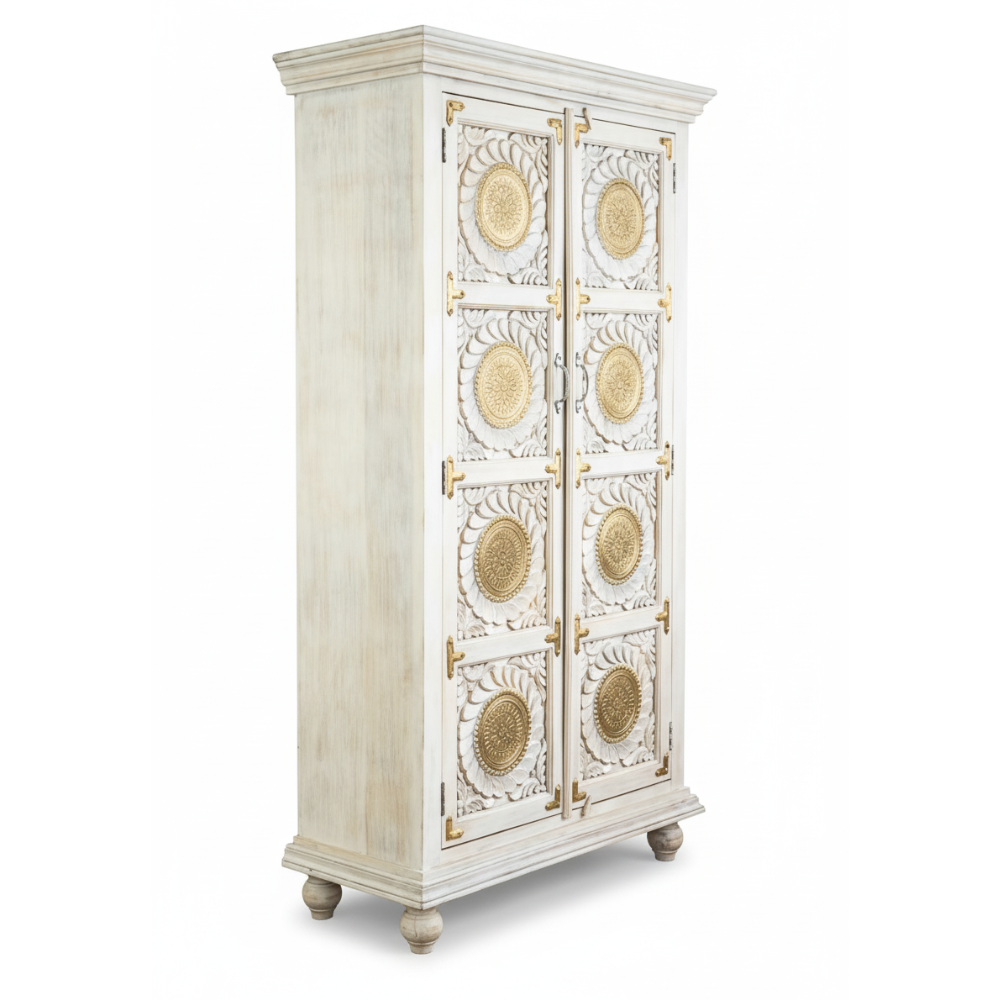 The tall double doors feature intricate floral hand-carvings accented by embossed brass discs that add a luxurious touch of gold contrast to the distressed whitewashed finish. Inside, the spacious shelving provides ample room for storing linens, dinnerware, books, or collectibles, making it as functional as it is beautiful.