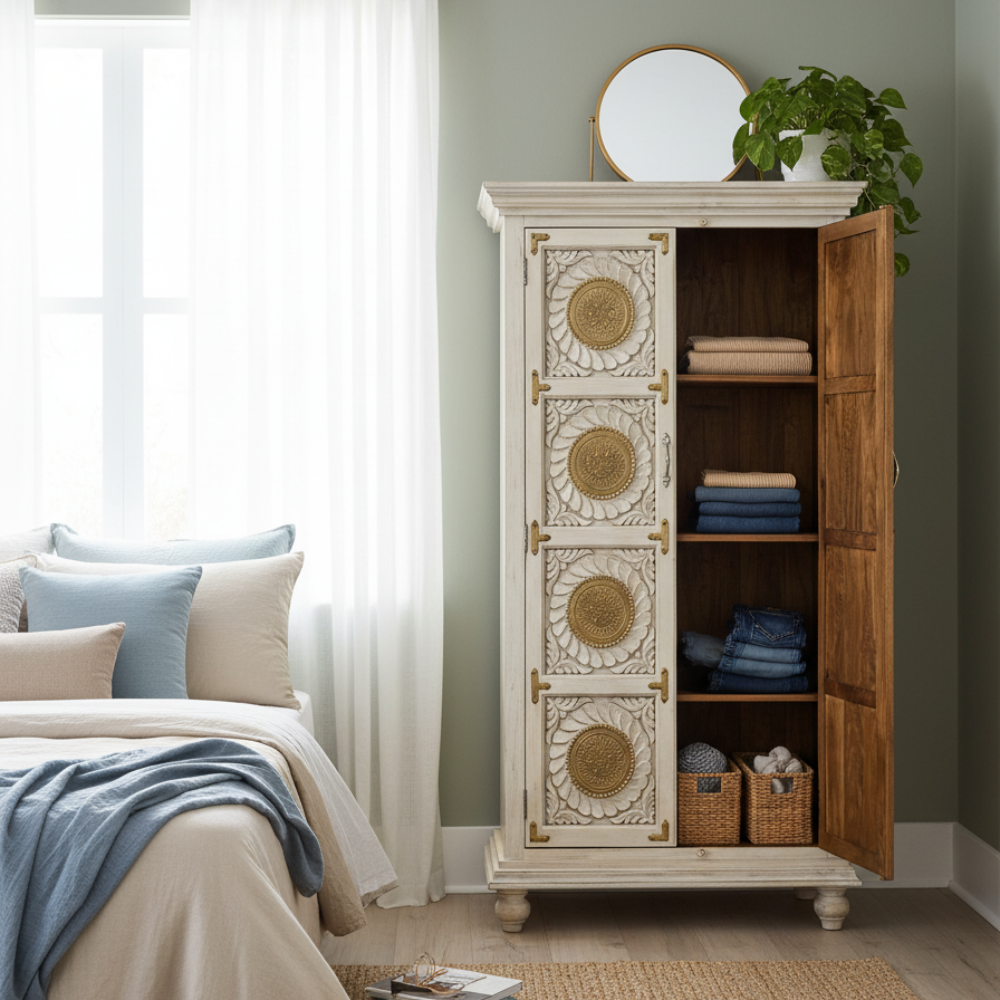 Bring regal charm and artistic craftsmanship into your home with this Indian handcrafted tallboy cabinet, beautifully made from solid mango wood and adorned with brass medallion detailing. Designed by Viratra Art Decor, this statement piece is a celebration of traditional Indian artistry blended with modern bohemian elegance.