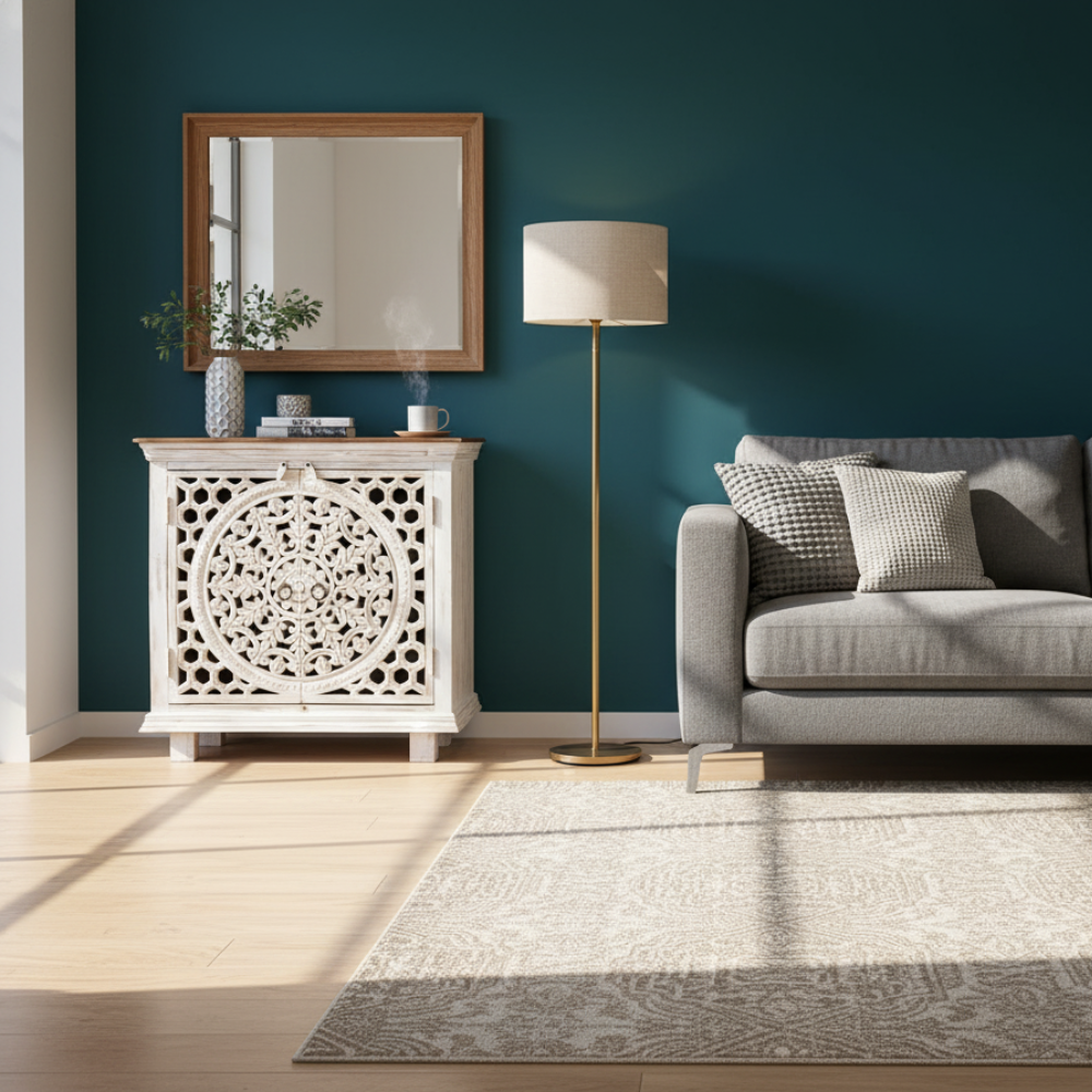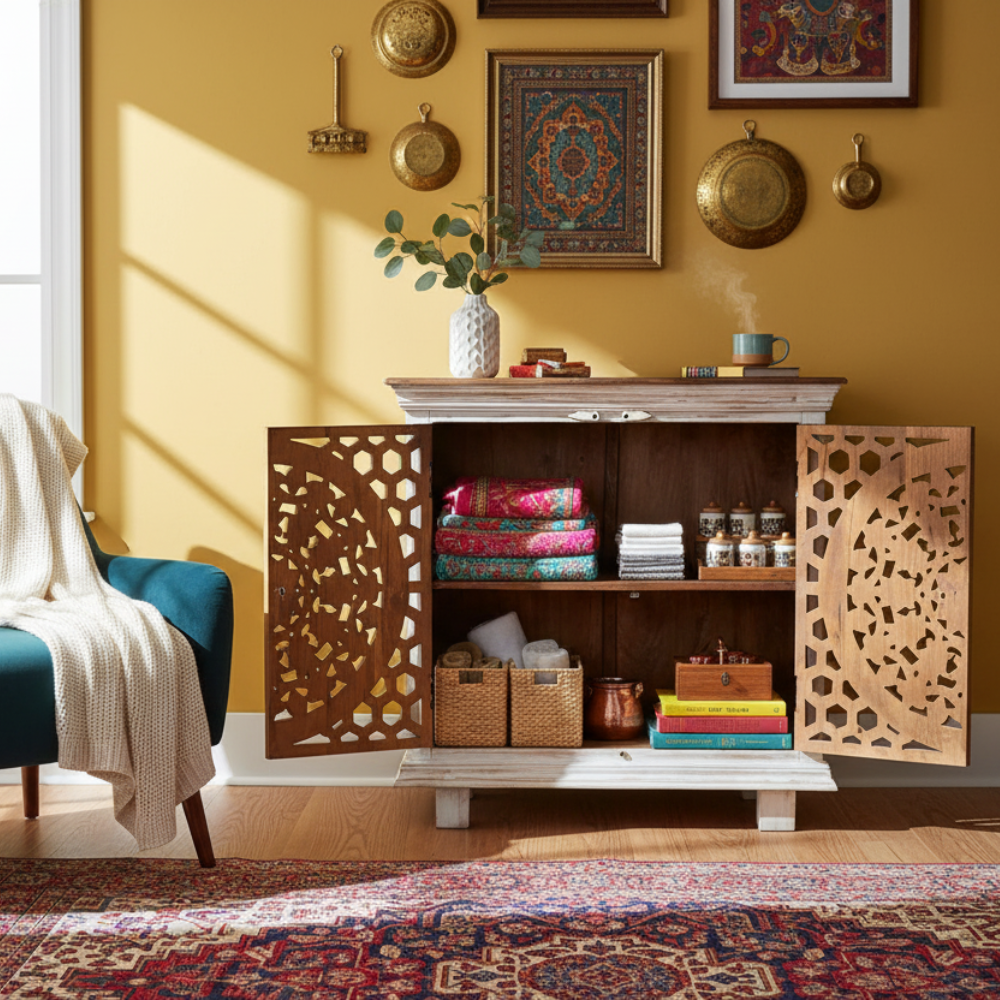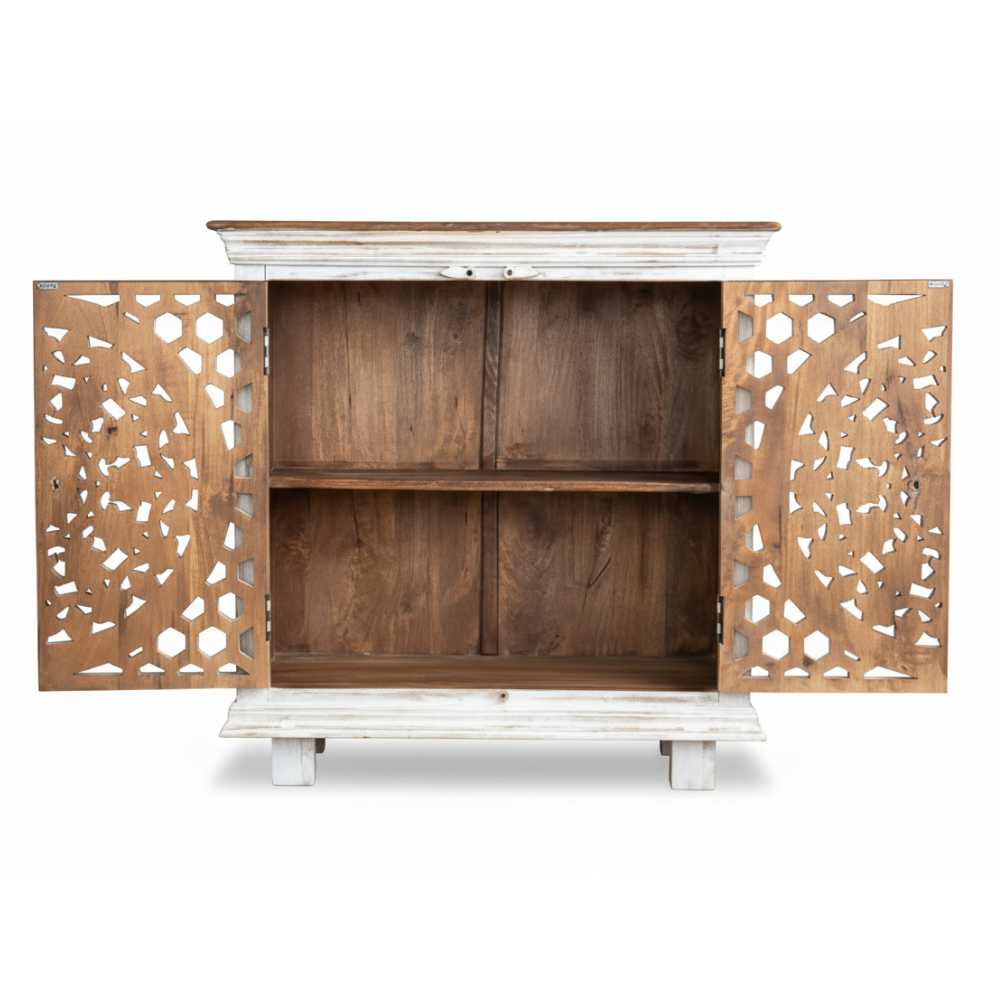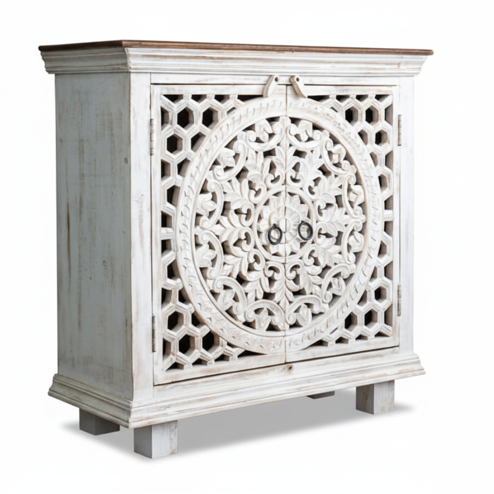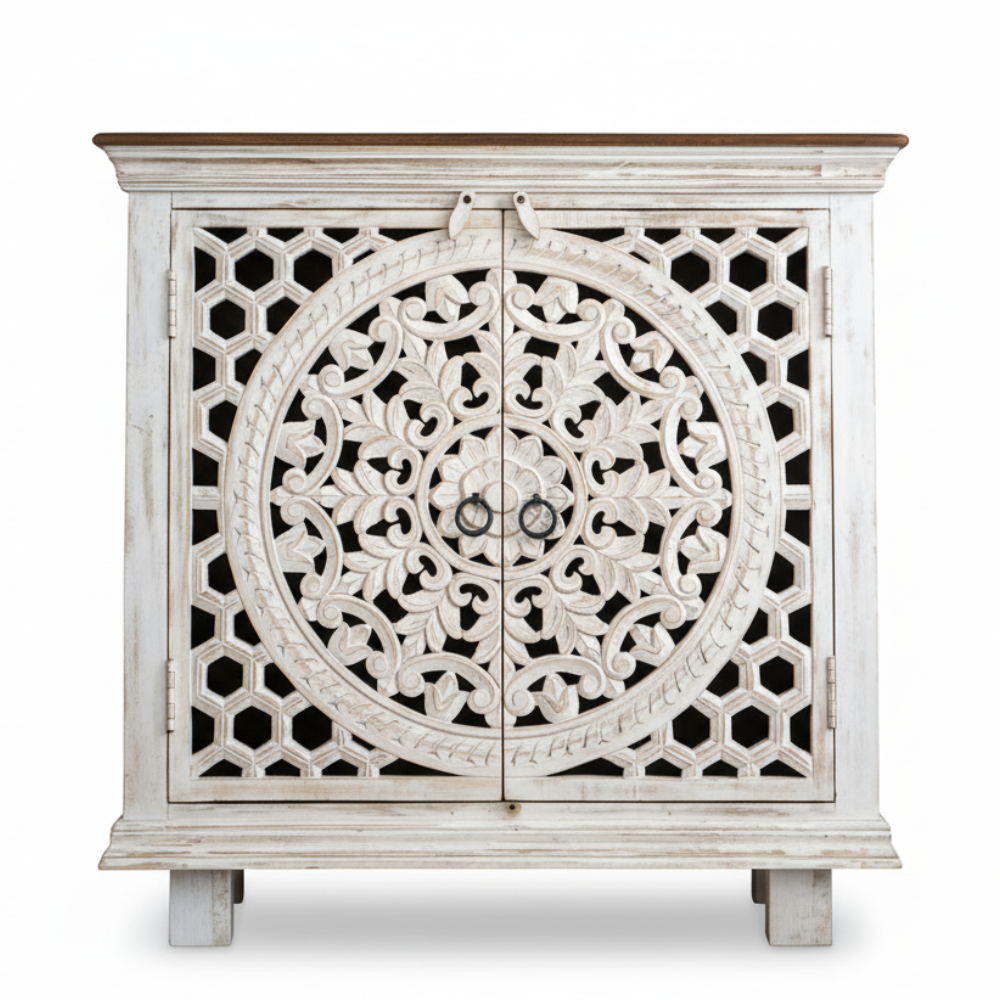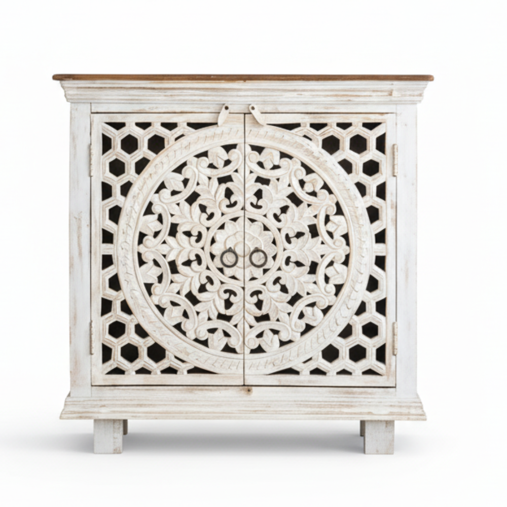 Bring artisan beauty and modern boho charm into your home with this stunning hand-carved bedside cabinet. Featuring an intricately carved mandala framed with geometric honeycomb patterns, this cabinet becomes an instant statement piece in any room. The distressed white finish adds a soft, vintage feel, while the natural wood interior offers warmth and authenticity. Perfect for bedrooms, hallways, or living spaces, it combines elegant craftsmanship with practical storage—making your home feel both stylish and serene.