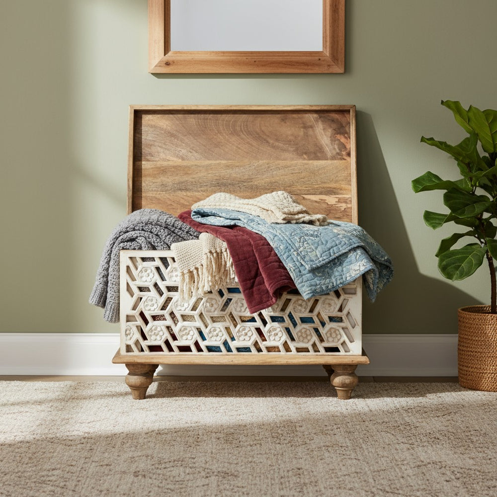 Add an element of Indian artistry and rustic charm to your home with this Handcarved Mango Wood Blanket Chest, beautifully created by the artisans of Viratra Art Decor.