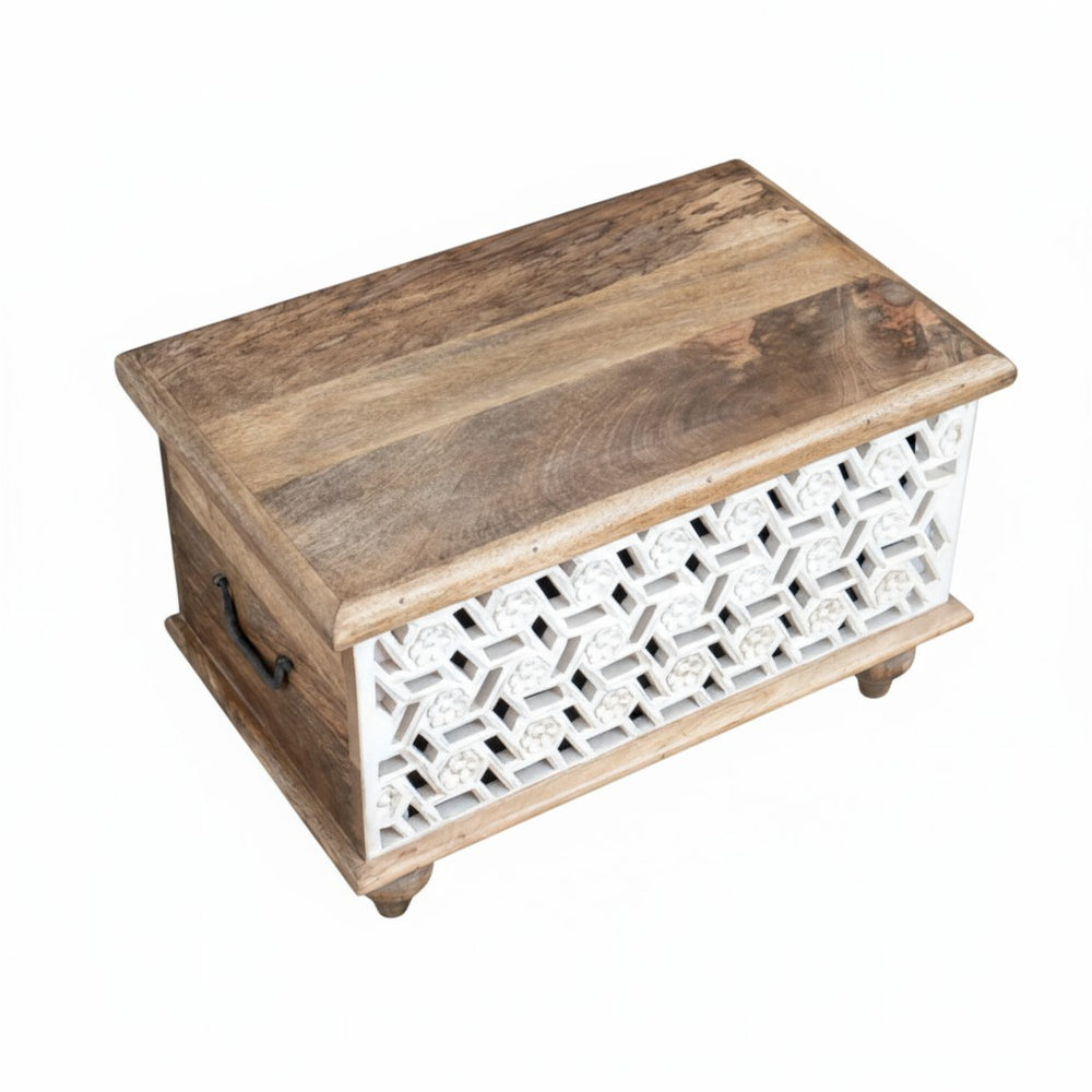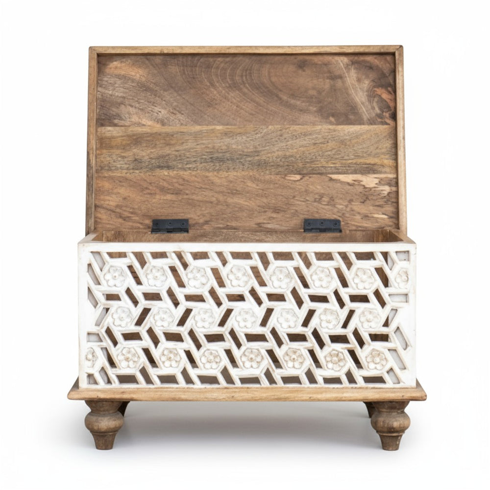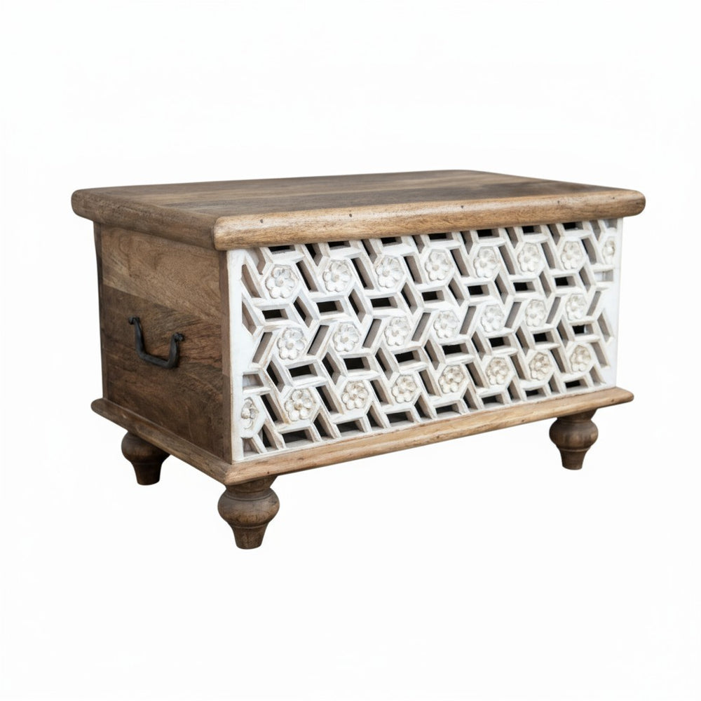 Crafted from solid mango wood, this chest features an intricately hand-carved geometric floral pattern on the front, highlighted with a delicate whitewashed finish that accentuates every detail of the design. The natural wood grain top contrasts beautifully with the white carved body, giving the piece a perfect blend of boho warmth and contemporary style.