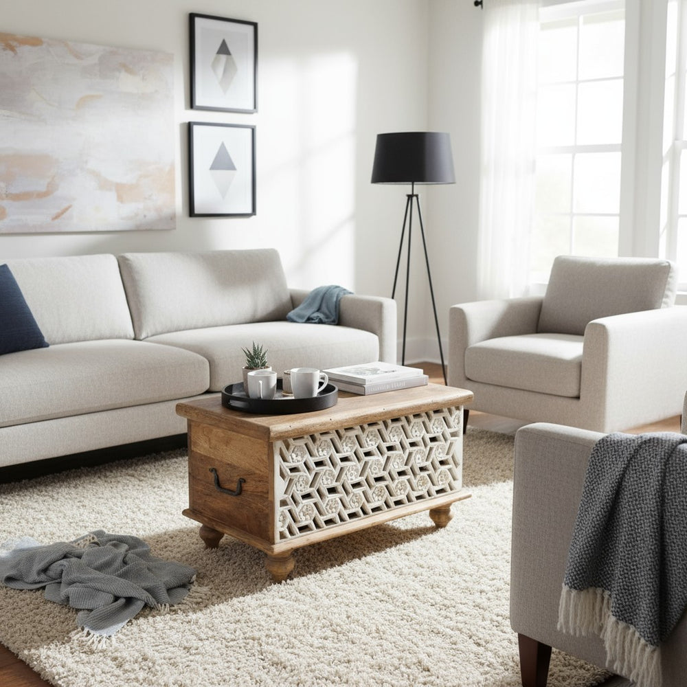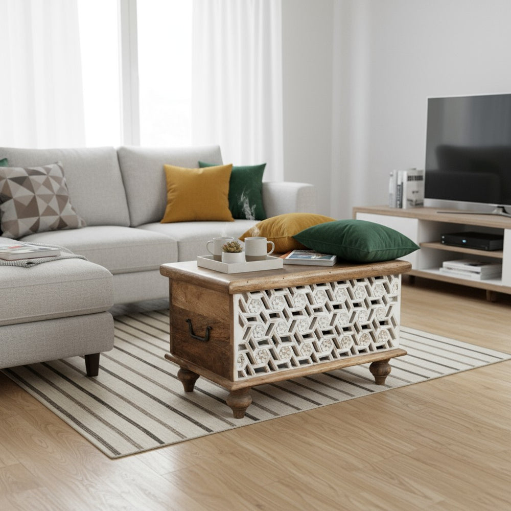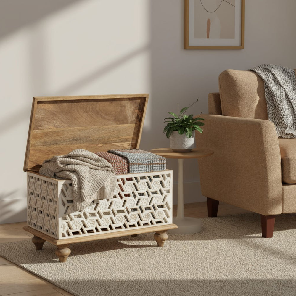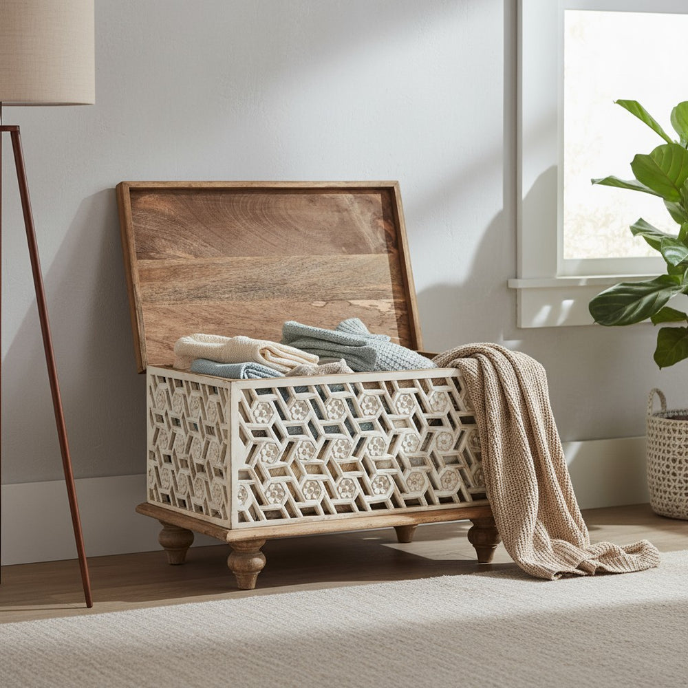 Crafted from solid mango wood, this chest features an intricately hand-carved geometric floral pattern on the front, highlighted with a delicate whitewashed finish that accentuates every detail of the design. The natural wood grain top contrasts beautifully with the white carved body, giving the piece a perfect blend of boho warmth and contemporary style.