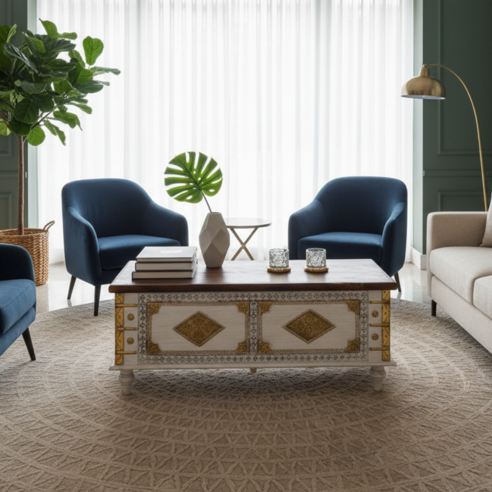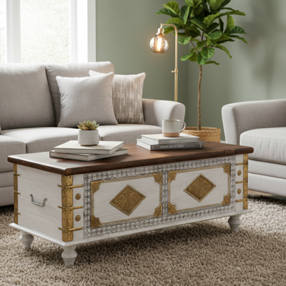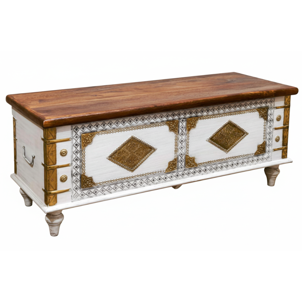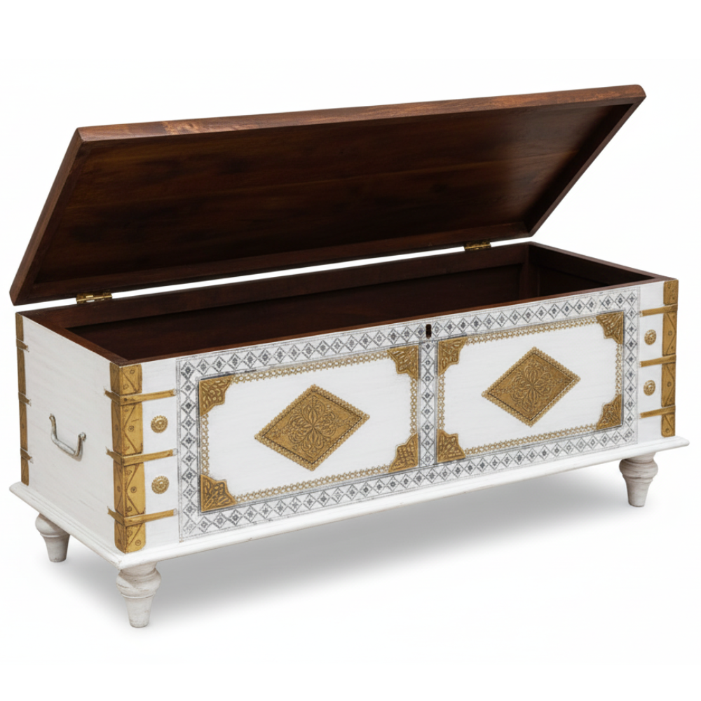 Infuse your home with timeless Indian artistry and functional elegance with this handcrafted wooden blanket chest by Viratra Art Decor. Made from solid mango wood, this exquisite piece features intricate brass inlay work and embossed geometric motifs that showcase India’s rich heritage of metal craftsmanship. The whitewashed finish enhances the fine detailing, giving the chest a regal yet serene aesthetic.