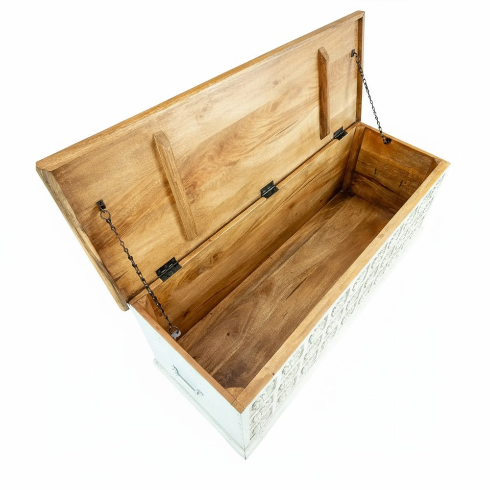 Add a touch of timeless Indian artistry to your home with this exquisite Handcarved Mango Wood Blanket Chest, crafted with care and precision by artisans at Viratra Art Decor.