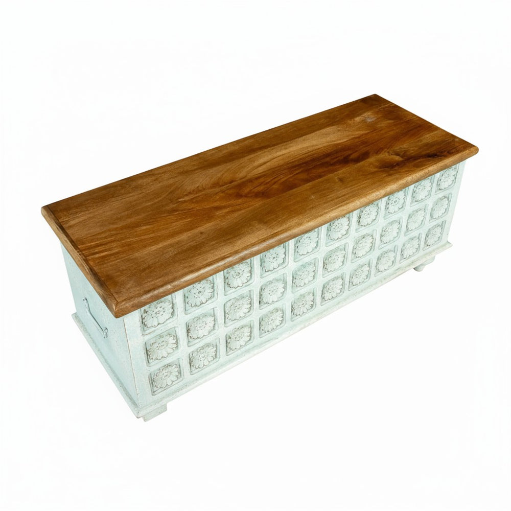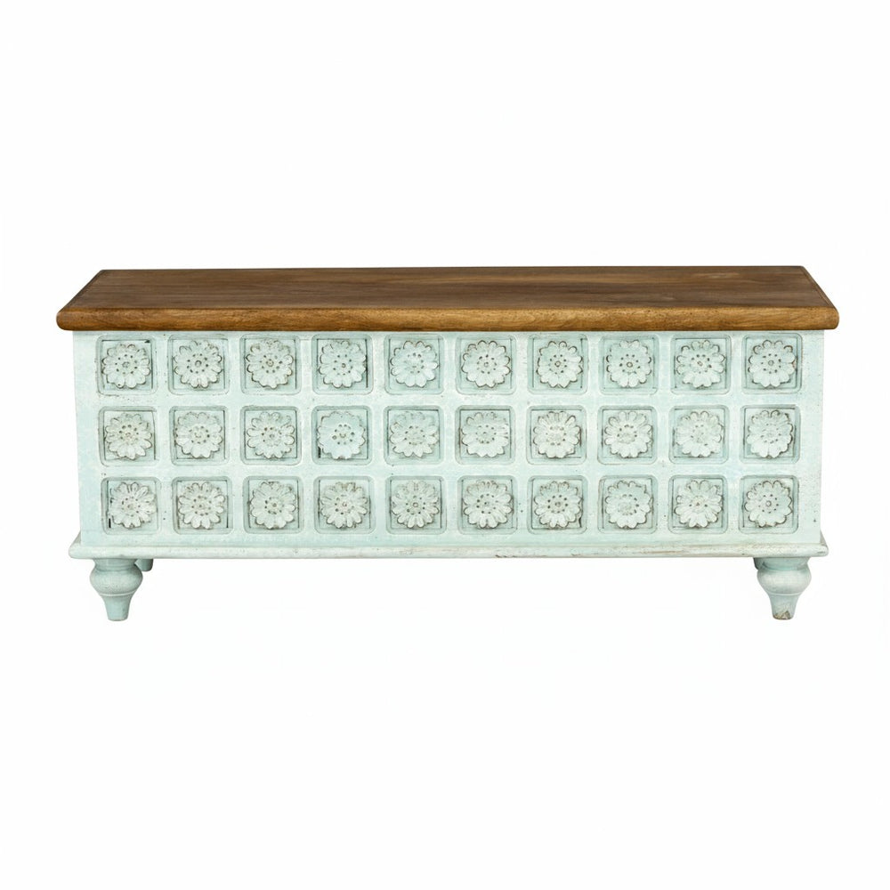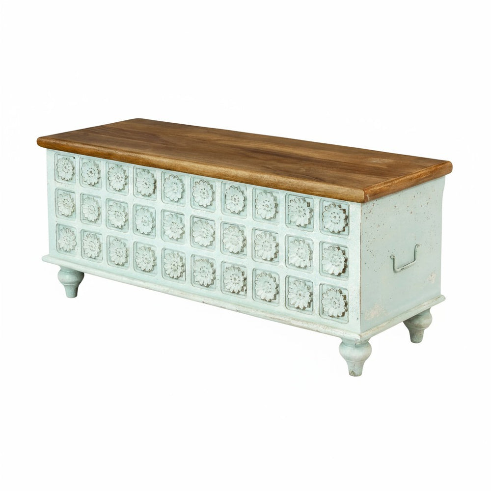 This chest is made from solid mango wood, renowned for its strength, durability, and natural beauty. The front panel showcases delicately handcarved floral motifs arranged in a geometric grid pattern — each block individually carved to create a stunning visual texture that reflects the charm of traditional Indian craftsmanship.