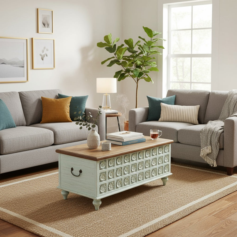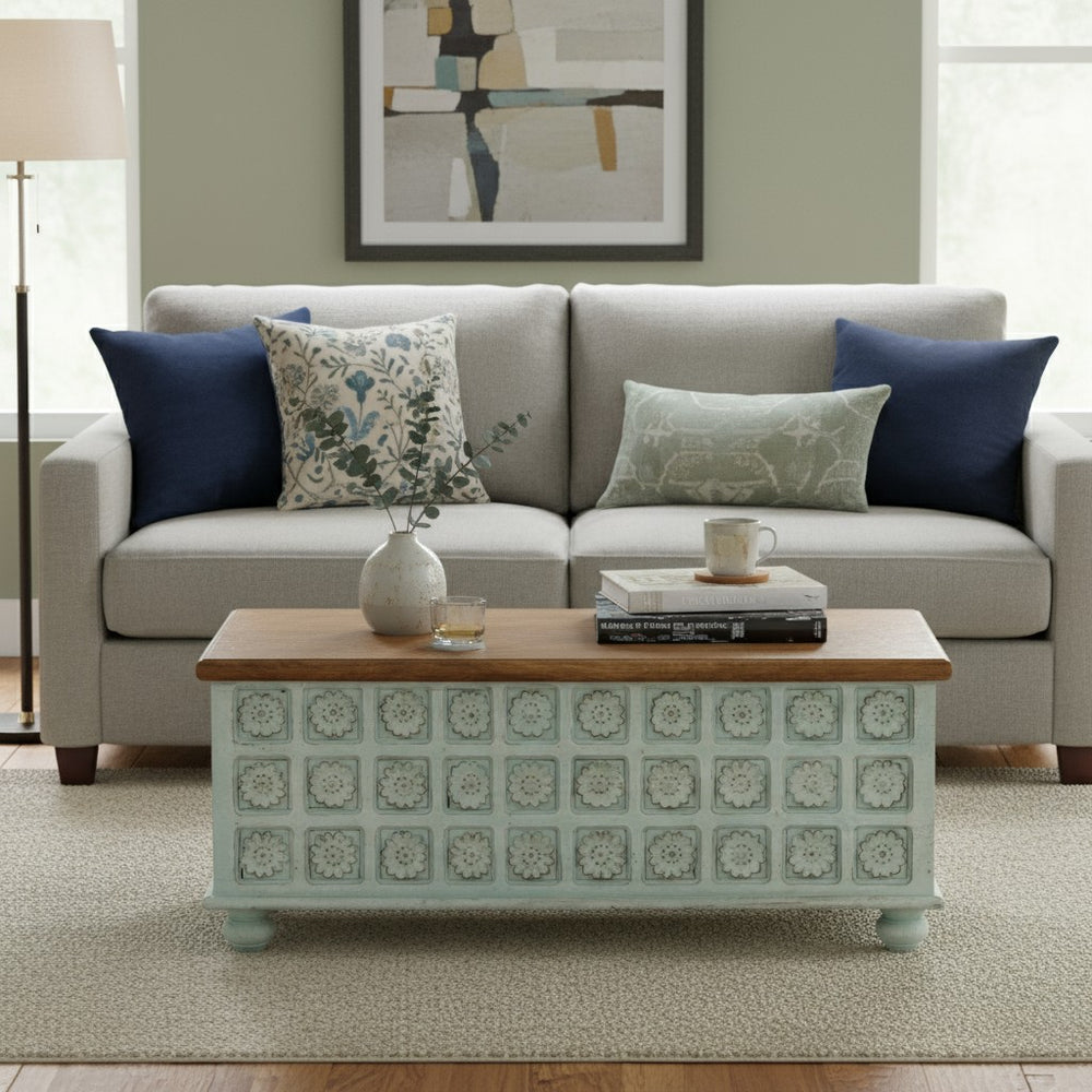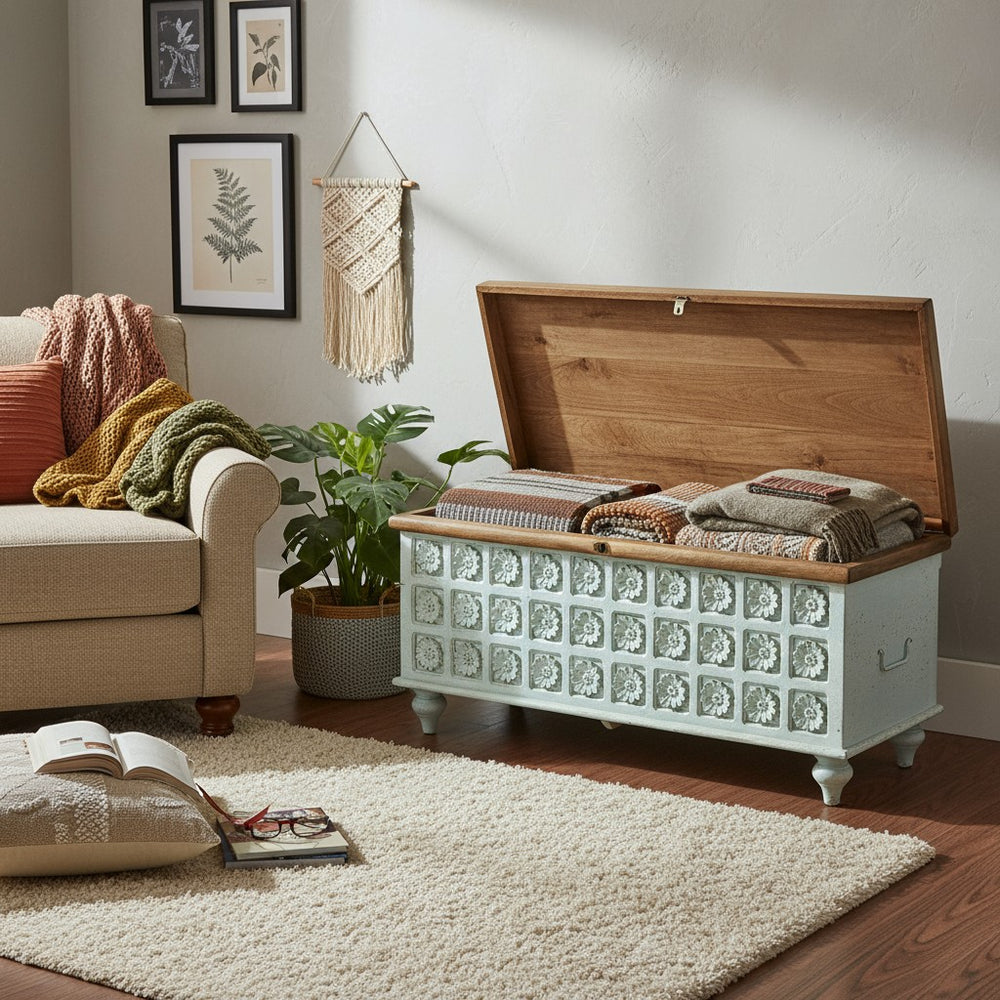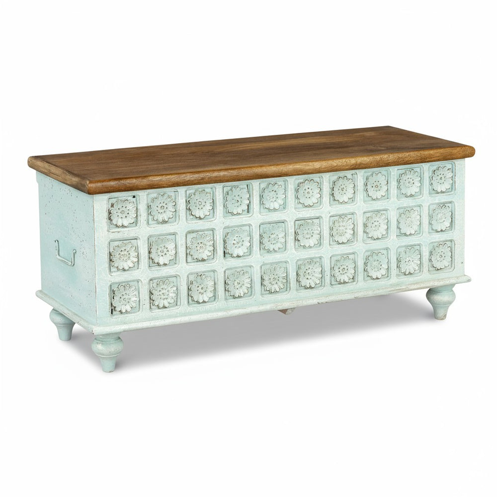 This chest is made from solid mango wood, renowned for its strength, durability, and natural beauty. The front panel showcases delicately handcarved floral motifs arranged in a geometric grid pattern — each block individually carved to create a stunning visual texture that reflects the charm of traditional Indian craftsmanship.