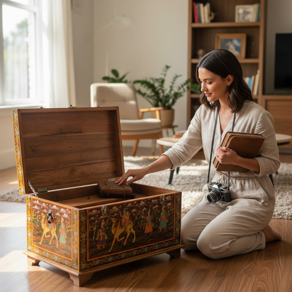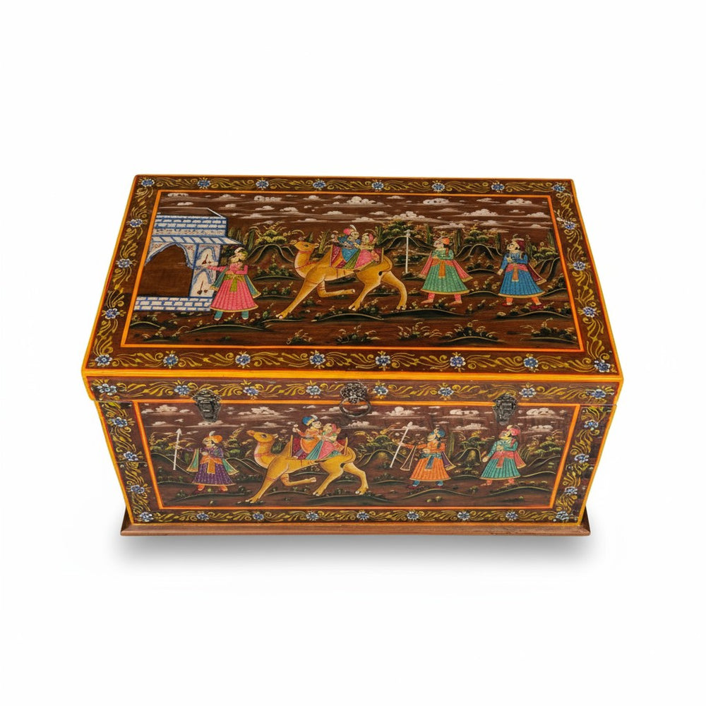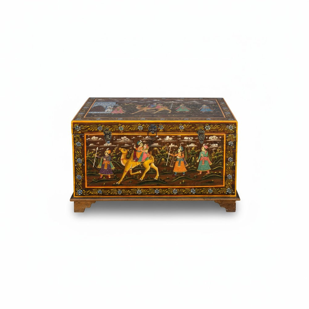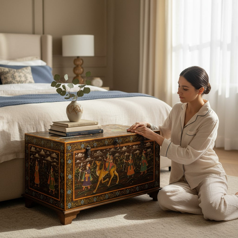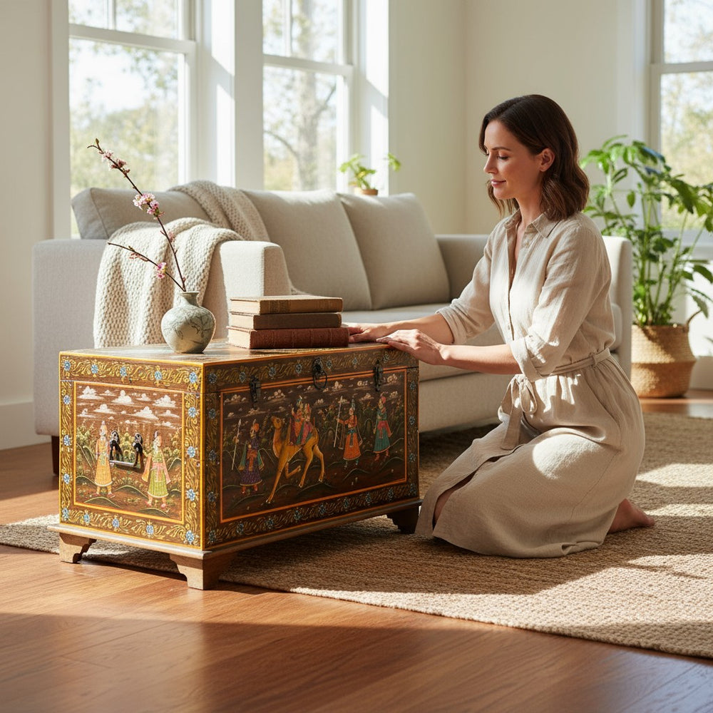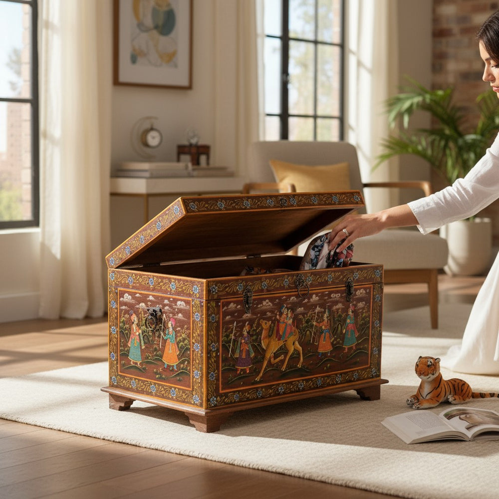 Celebrate the beauty of Indian heritage with this exquisitely hand-painted blanket storage chest, featuring vibrant folk art scenes inspired by royal processions and traditional village life. Each panel is carefully detailed by skilled artisans, making the chest not just a functional storage solution but a statement piece that transforms any room. Whether used as a coffee table, living-room centerpiece, or bedroom storage trunk, it brings warmth, culture, and artisanal charm to modern homes around the world. Perfect for decor lovers seeking unique, meaningful craftsmanship.