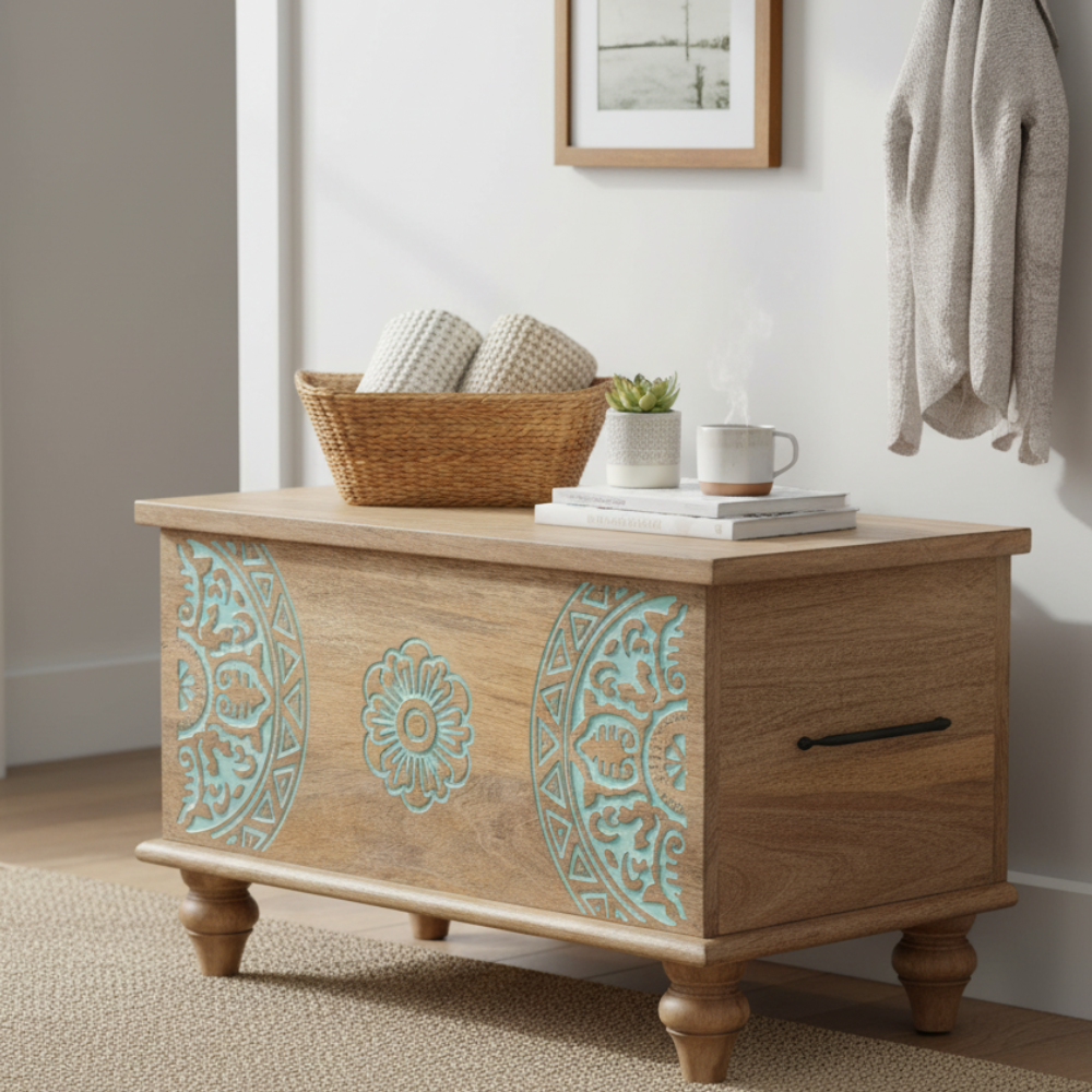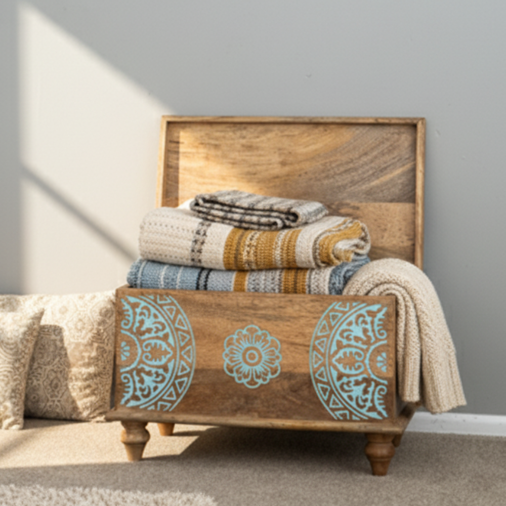 Bring warmth, beauty, and functionality to your home with this Mango Wood Blanket Chest, meticulously handcrafted by skilled artisans at Viratra Art Decor.