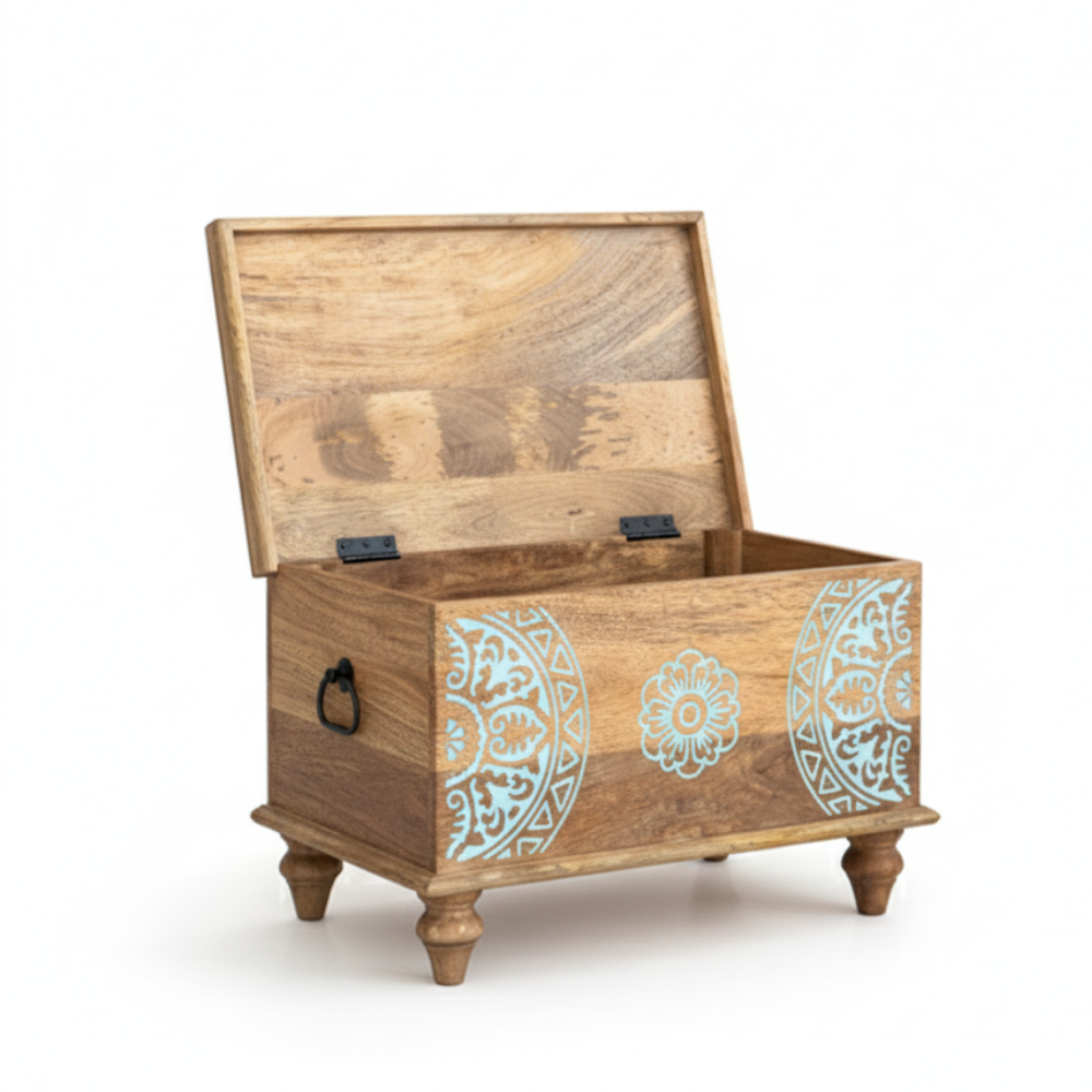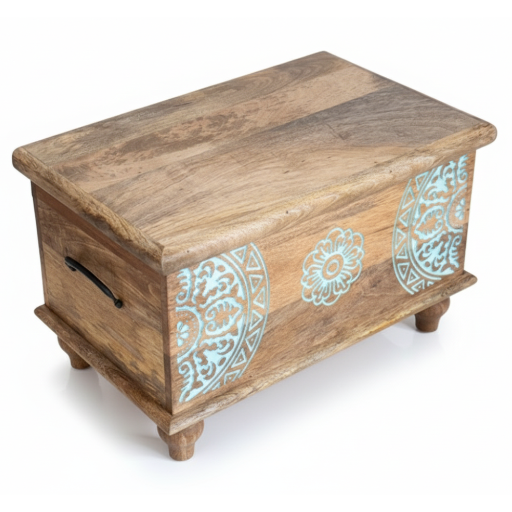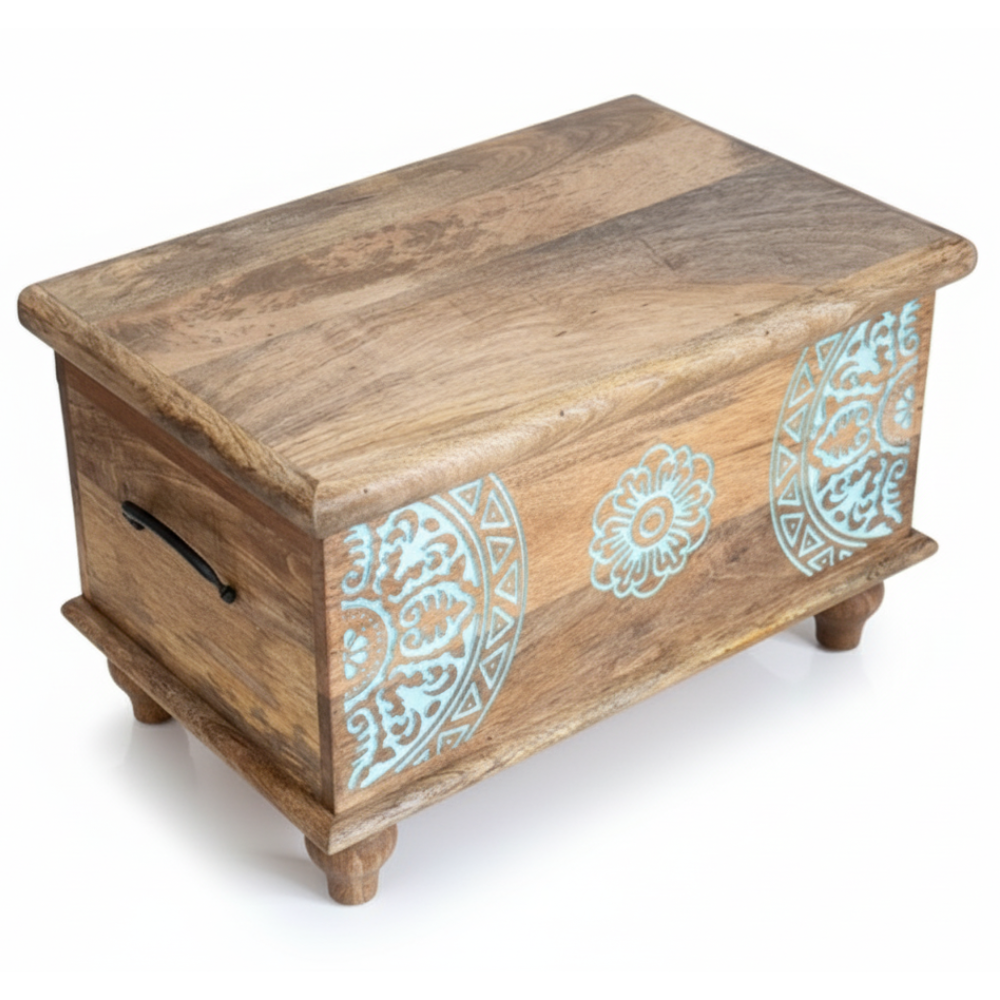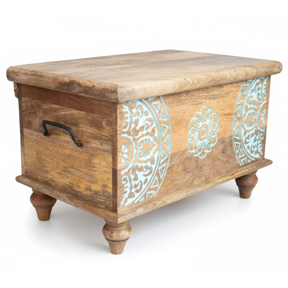 Made from premium solid mango wood, this chest showcases exquisite craftsmanship with hand-painted floral and geometric motifs in soothing turquoise and white tones. The rustic natural finish highlights the grain of the wood, creating a perfect blend of traditional Indian artistry and modern bohemian style.