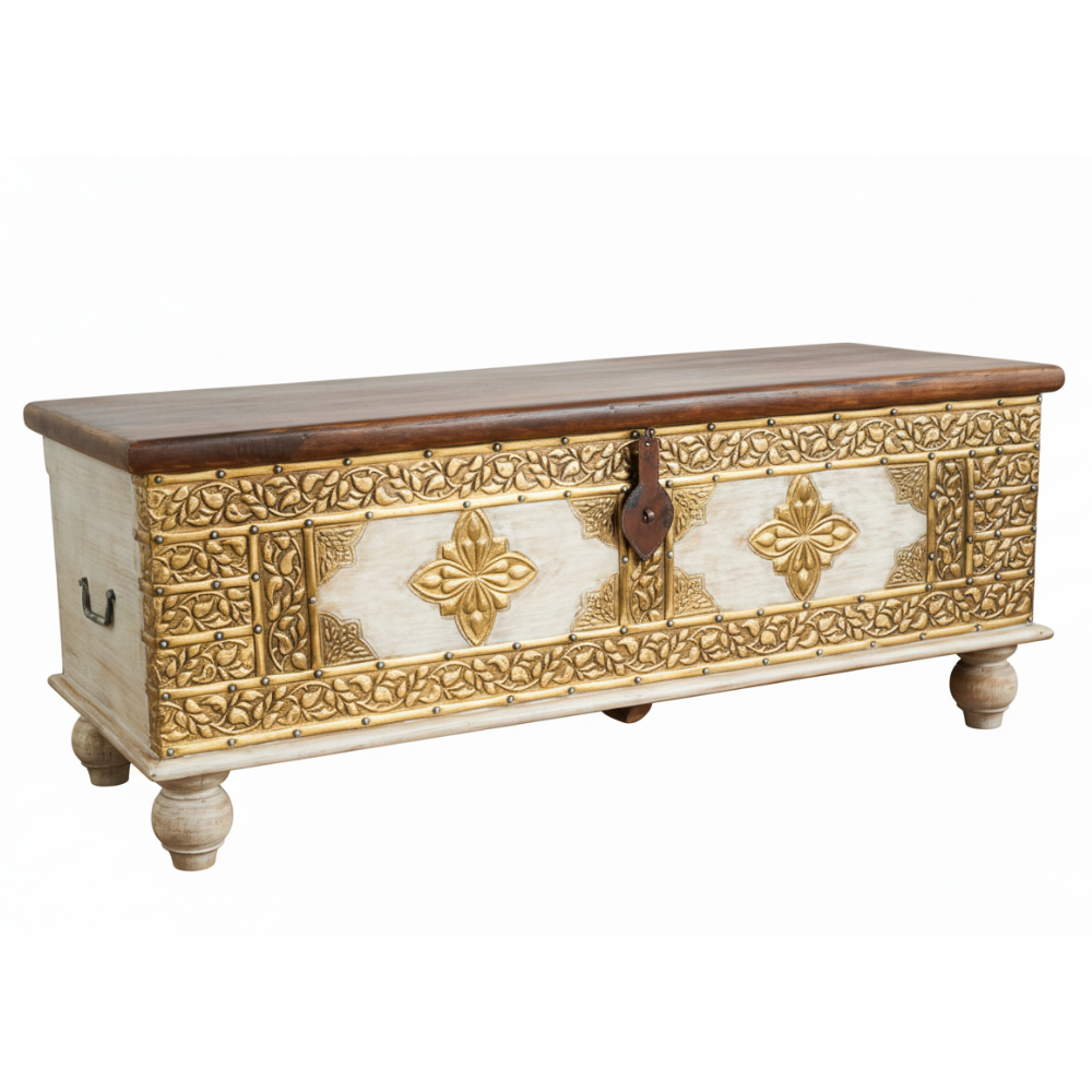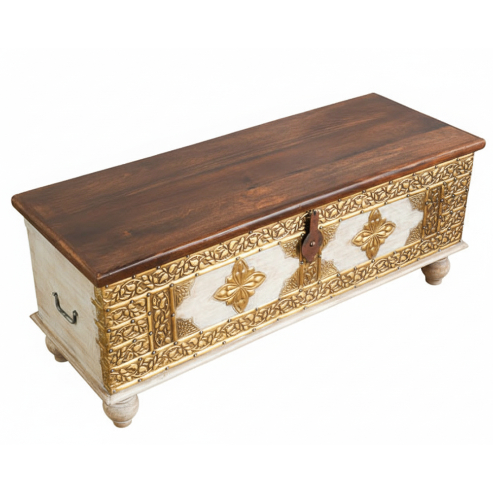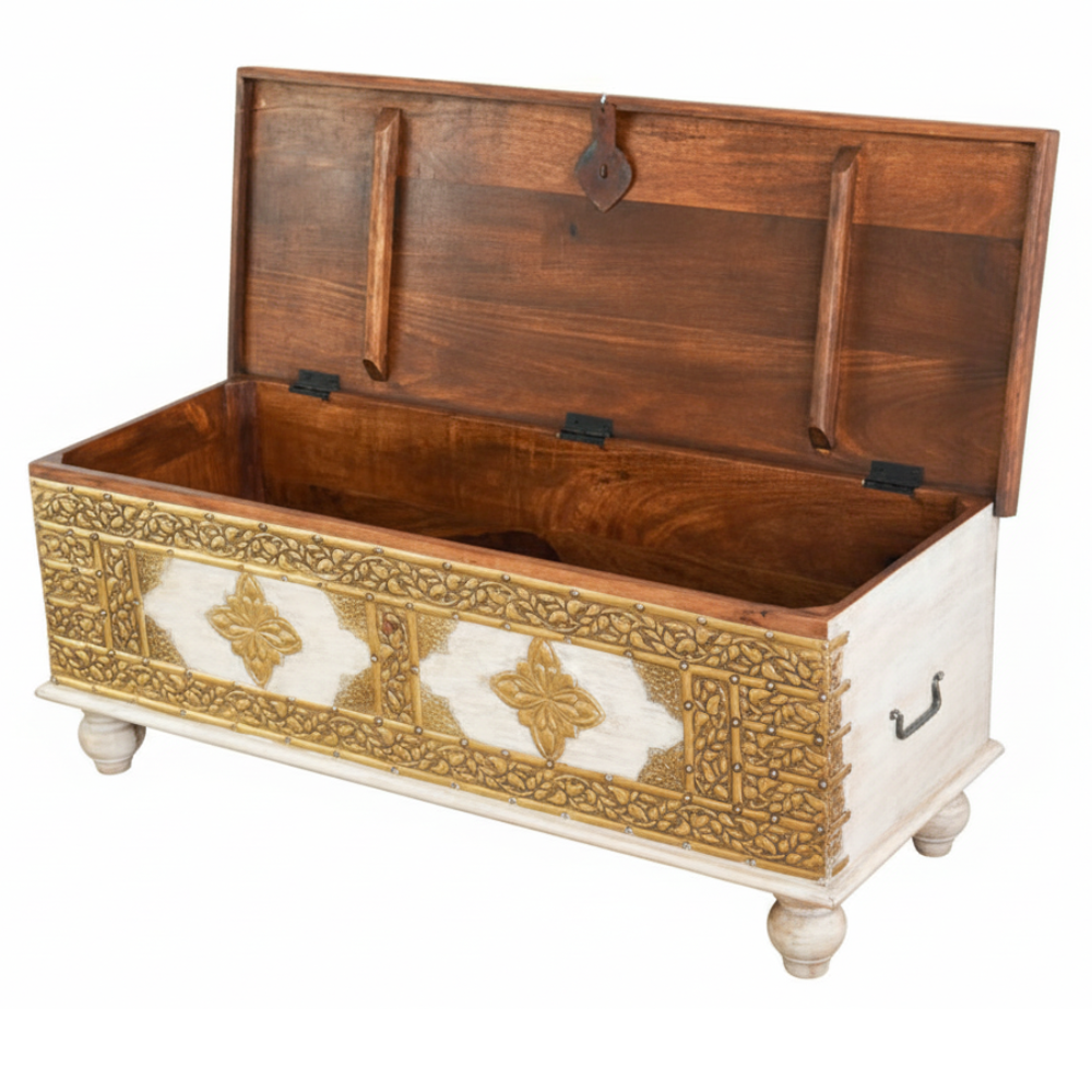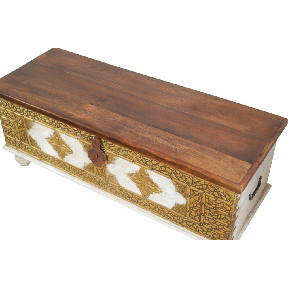 Enhance your home with the timeless elegance of this handcrafted wooden trunk box, featuring exquisite embossed brass detailing and a charming antique whitewashed finish. The rich natural wood top adds warmth and sophistication, while the front panel showcases stunning floral brass motifs surrounded by intricate vine patterns—each element meticulously crafted by skilled artisans.