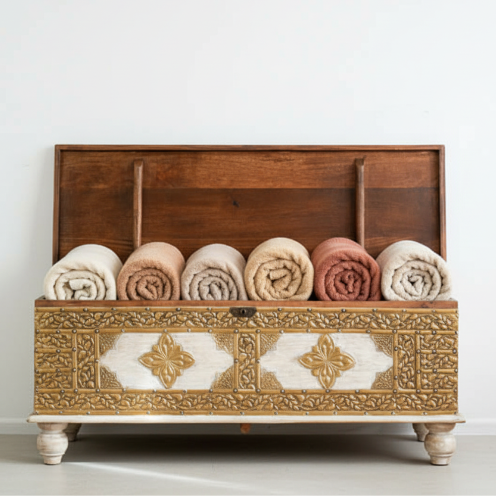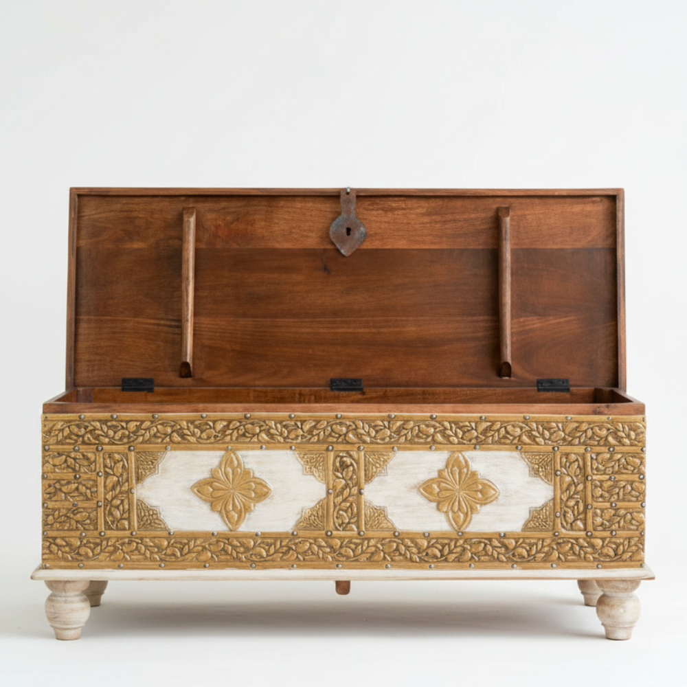 Supported by classic turned wooden legs, this trunk combines traditional Indian design with practical everyday functionality. The spacious interior offers ample room to store blankets, bedding, cushions, toys, or seasonal décor, keeping your home beautifully organized. Fitted with a strong hinged lid and vintage-style metal lock plate, this chest serves as both a functional storage solution and a striking decorative centerpiece for your bedroom, living room, or hallway.