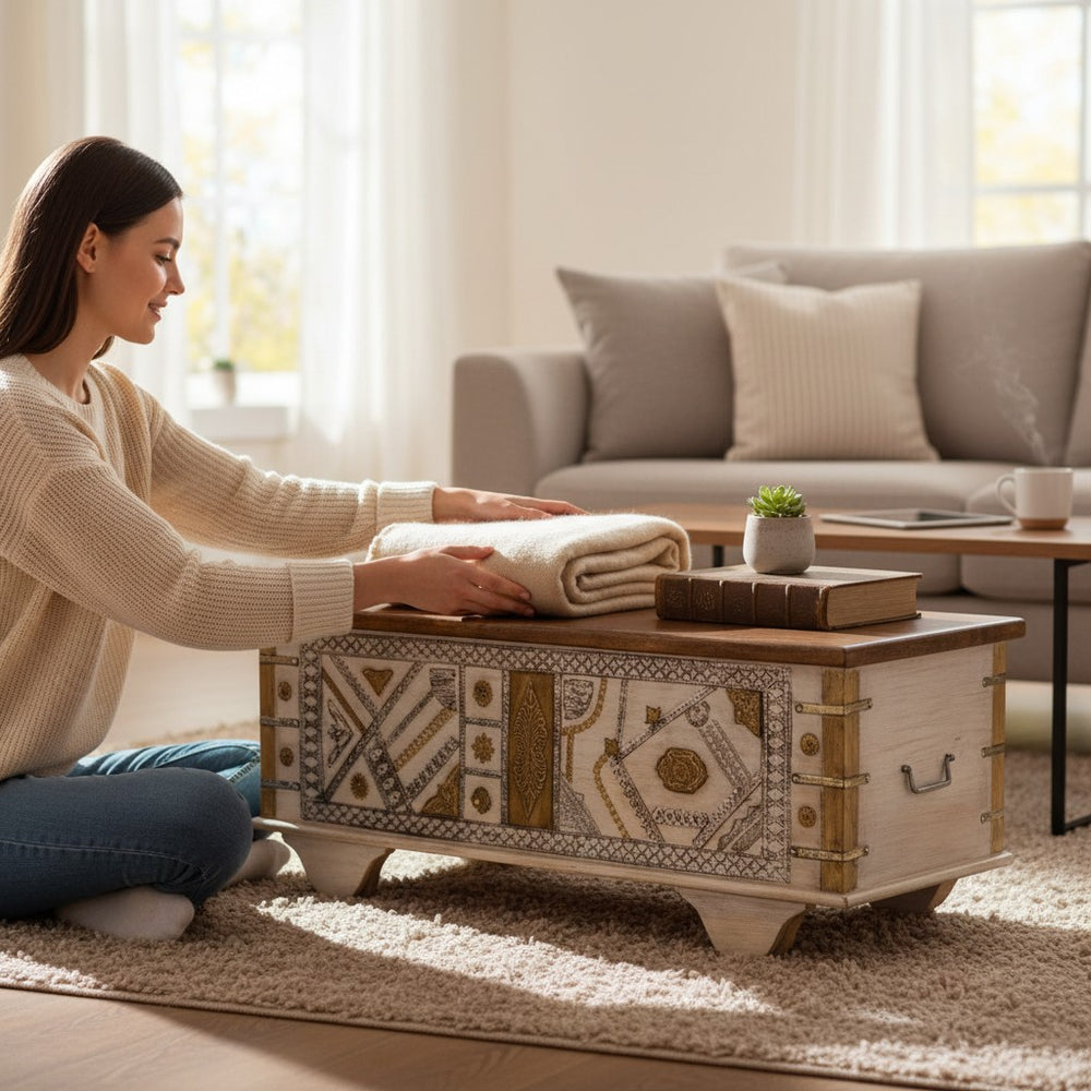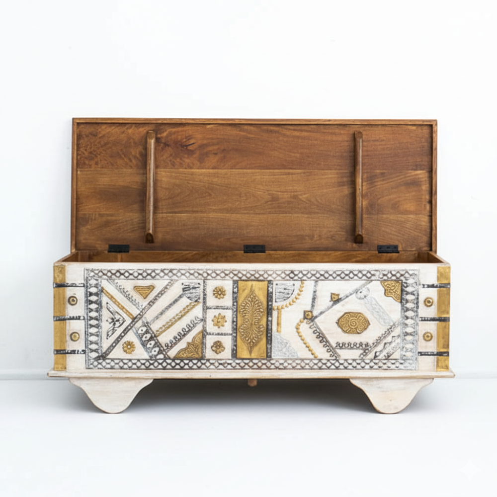 Designed with spacious interior storage, this trunk is ideal for storing blankets, bedding, cushions, toys, or seasonal essentials. Its strong hinged lid ensures easy opening, while the carved wooden legs add stability and a touch of classic Indian craftsmanship. Whether used as an entryway bench, bedroom blanket chest, hallway storage, or a decorative coffee table, this trunk enhances both style and practicality in your home.