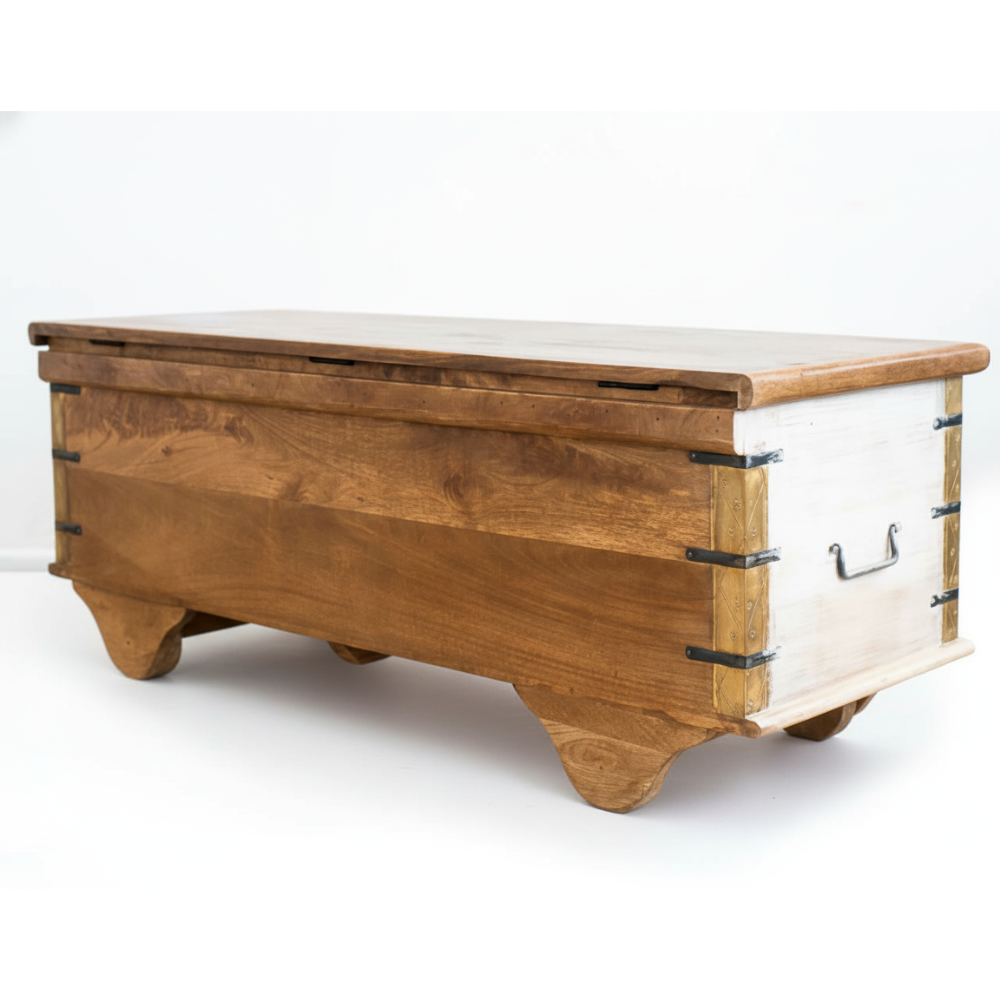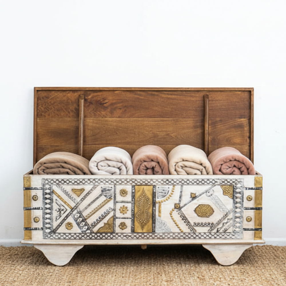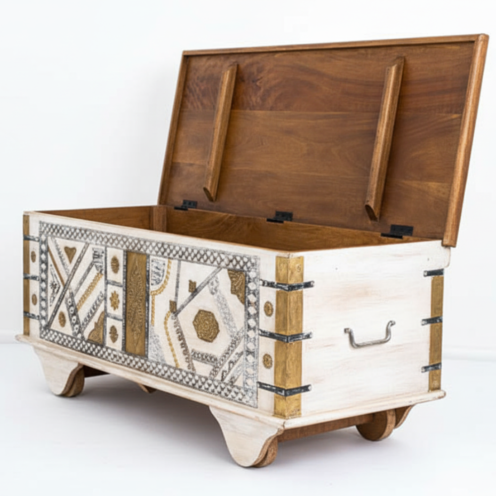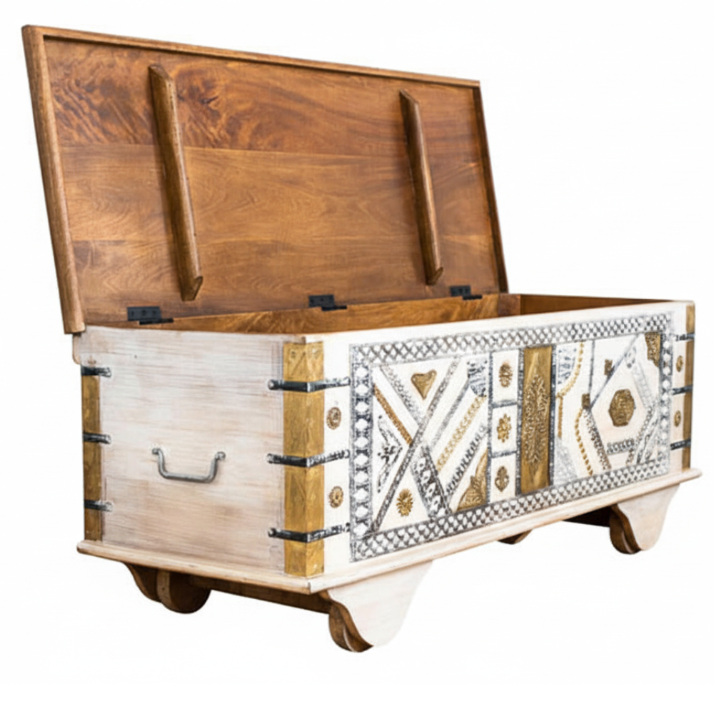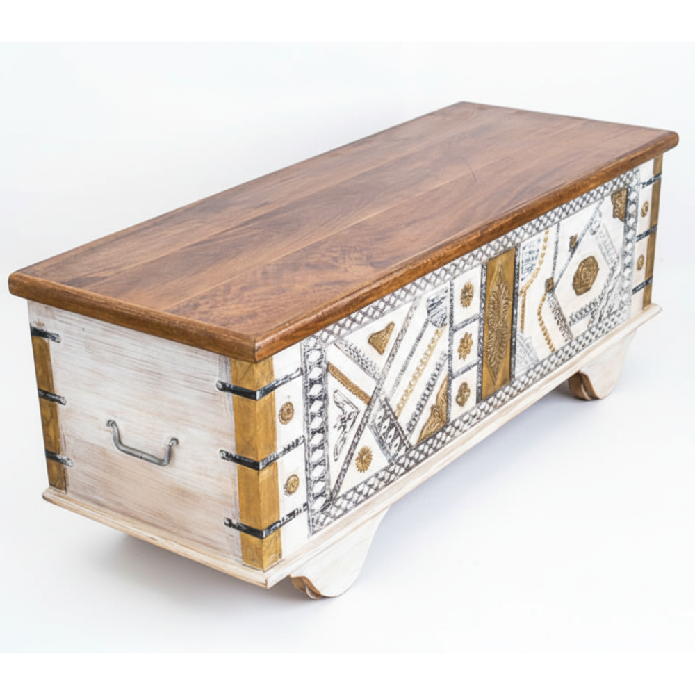 Bring home a perfect blend of traditional artistry and functional design with this beautifully handcrafted wooden trunk box. Made from sturdy solid wood, this chest features an elegant two-tone finish—natural warm wood atop and a distressed whitewashed body accented with intricate brass inlay work. The front showcases detailed ethnic patterns and embossed brass motifs, giving the trunk a unique, handcrafted charm that instantly elevates any room.