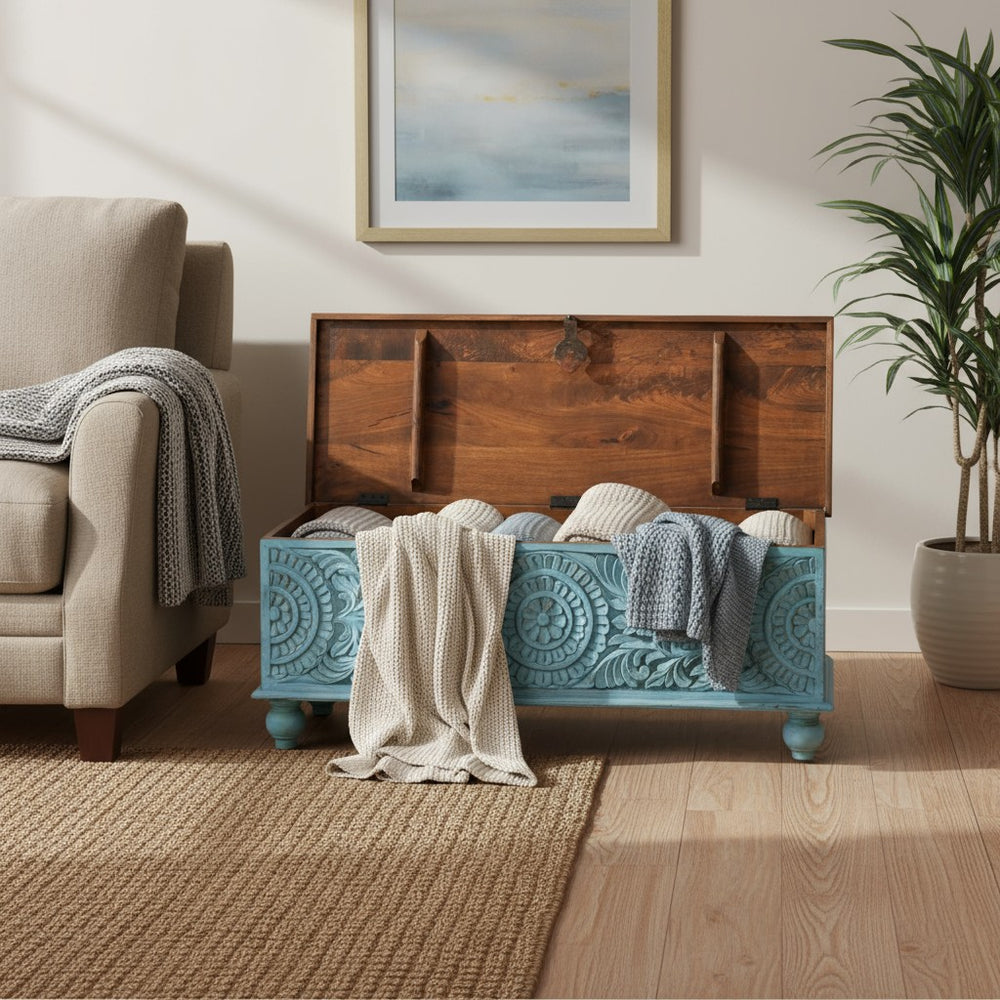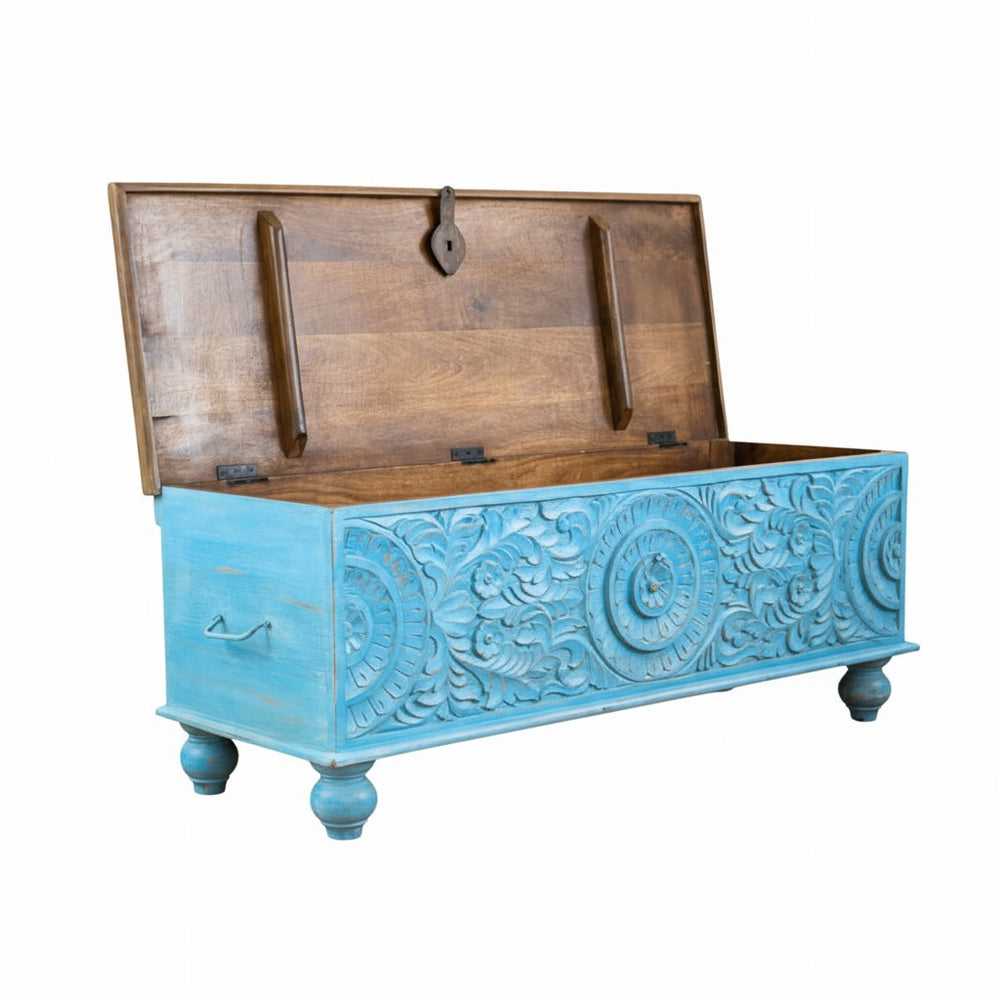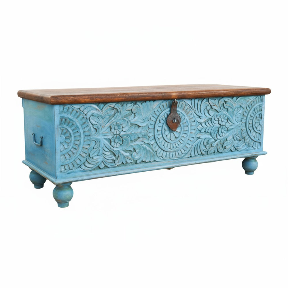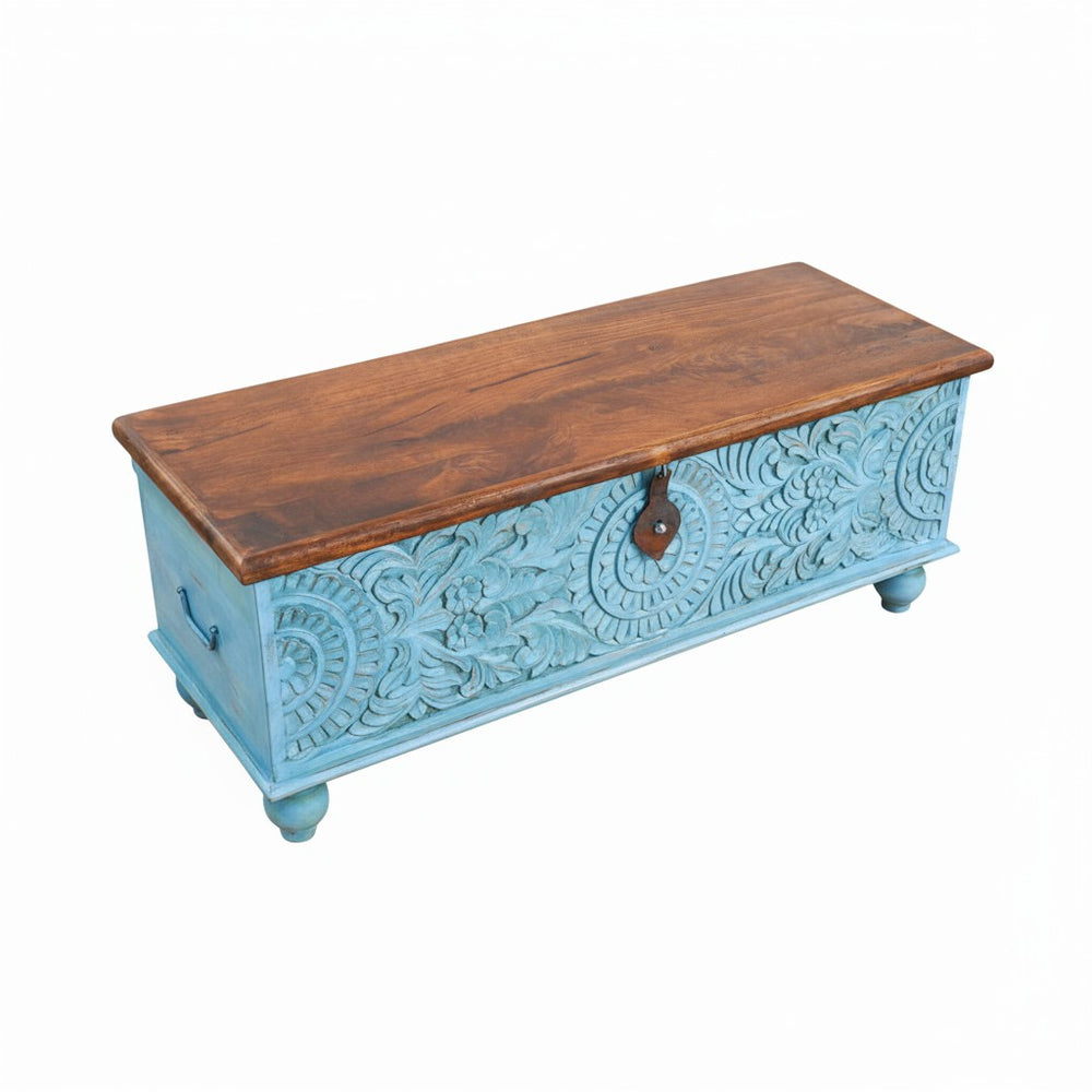 Bring home the essence of Indian artistry with this Blue Handcarved Mango Wood Blanket Chest, beautifully crafted by skilled artisans at Viratra Art Decor.