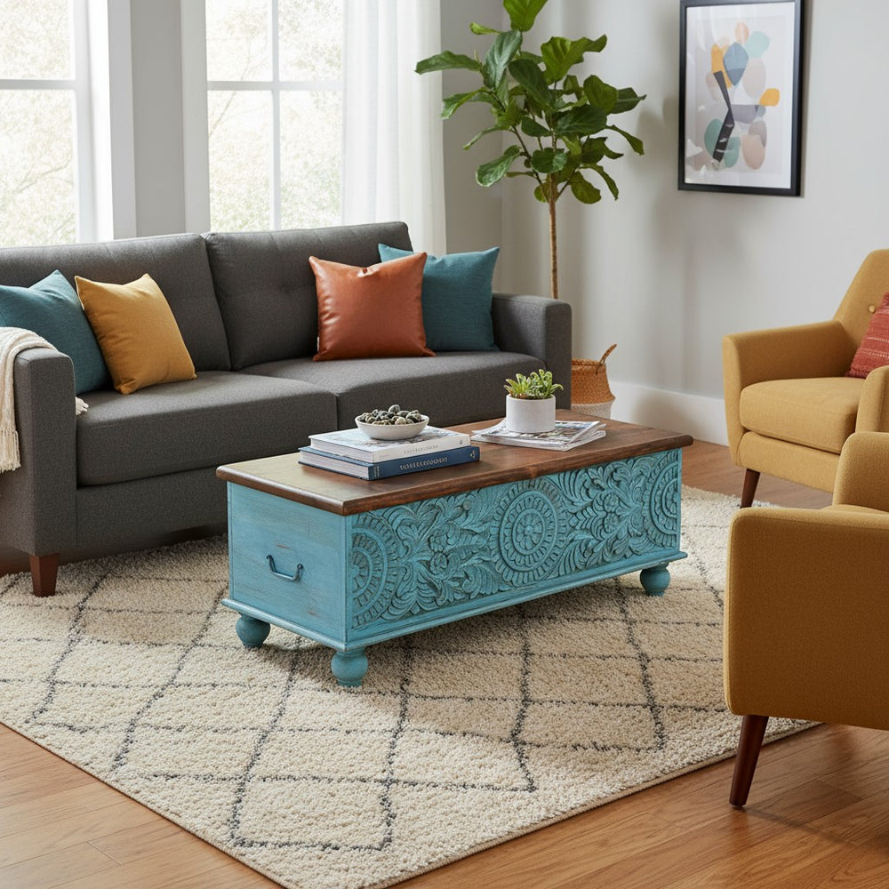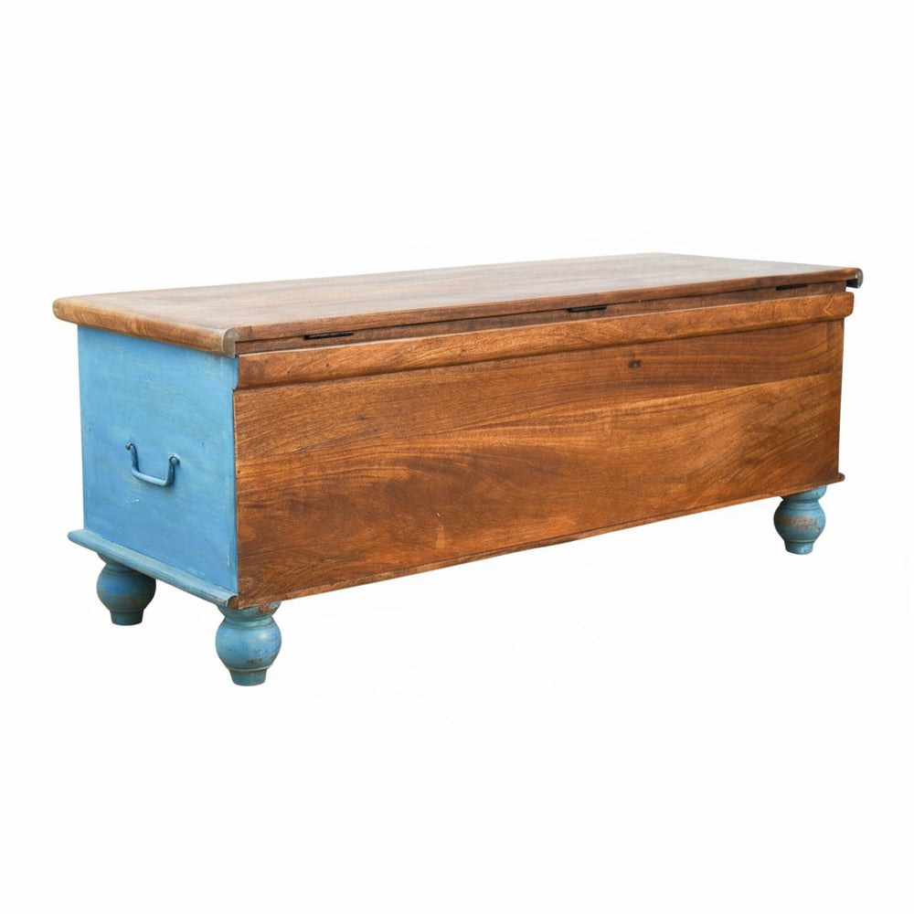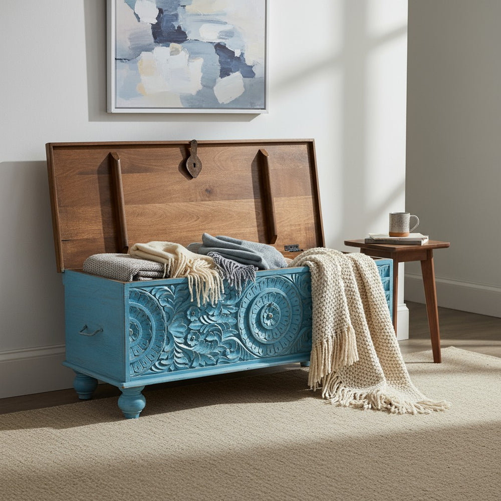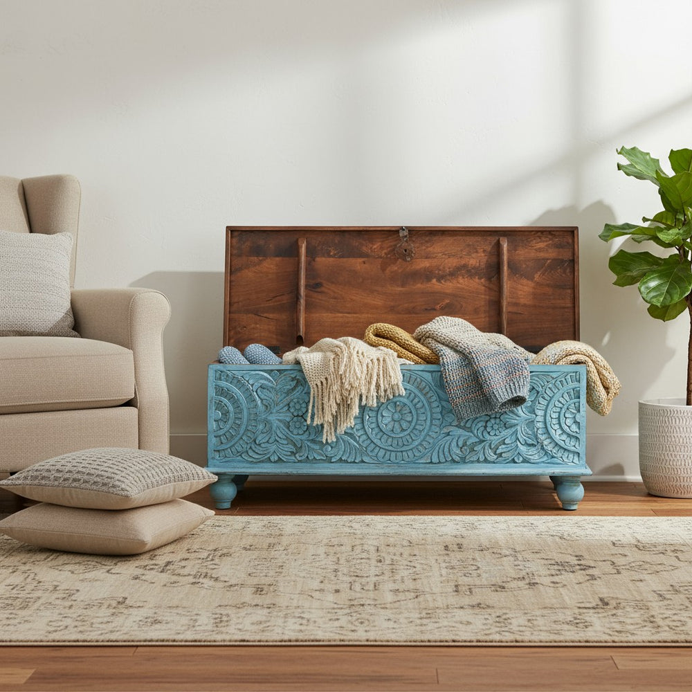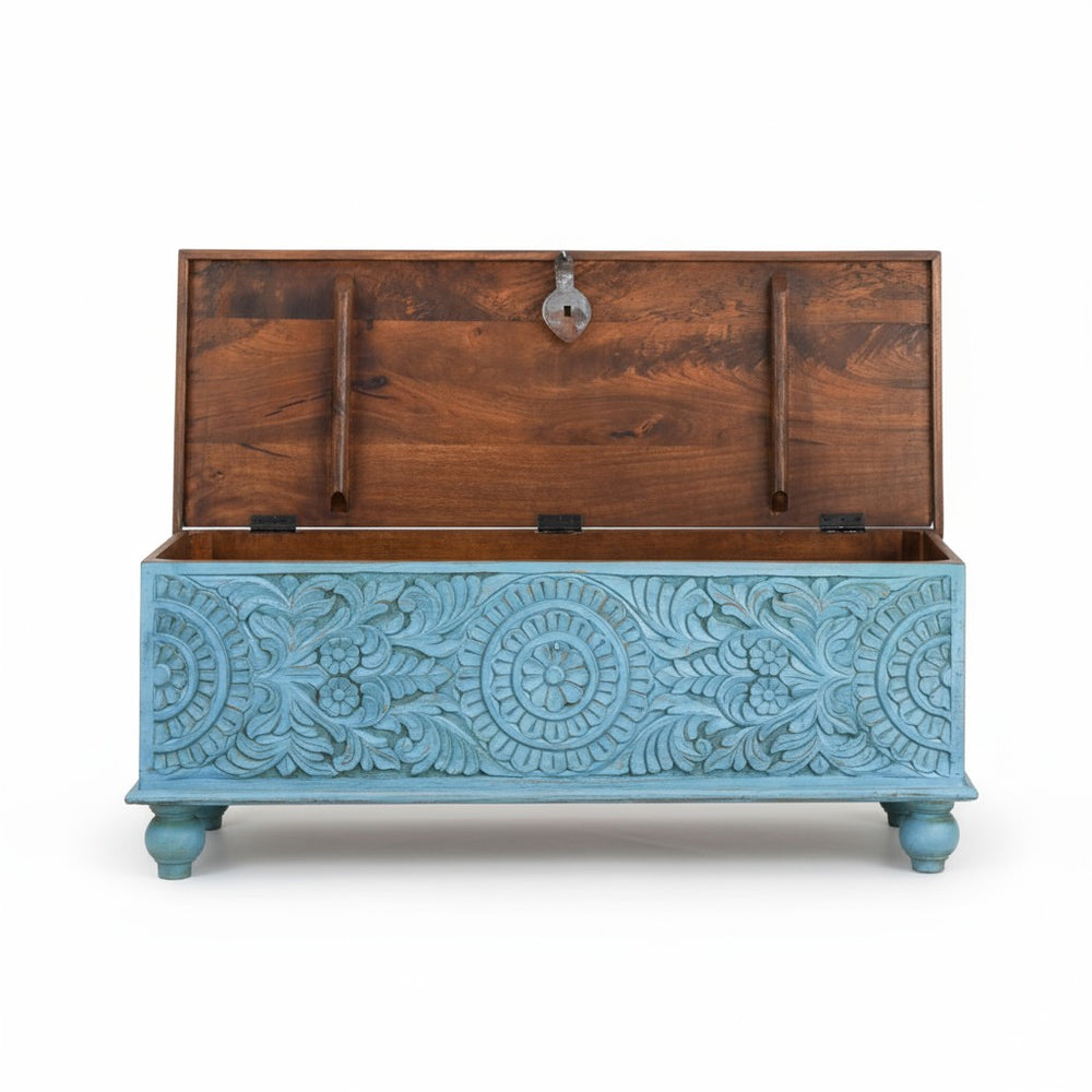 Bring home the essence of Indian artistry with this Blue Handcarved Mango Wood Blanket Chest, beautifully crafted by skilled artisans at Viratra Art Decor.