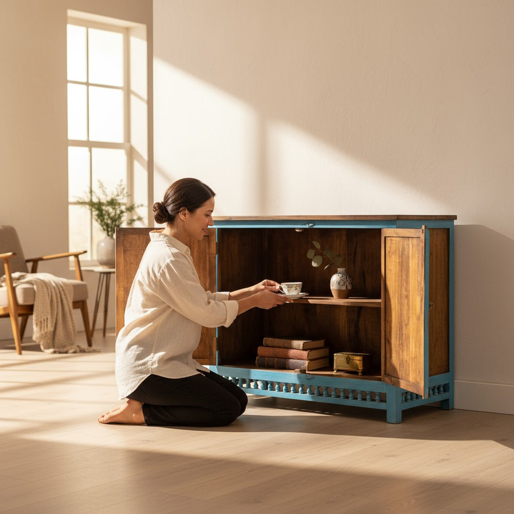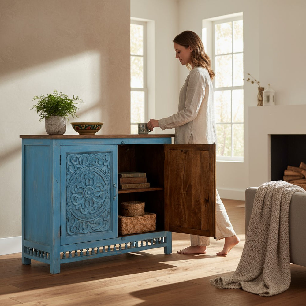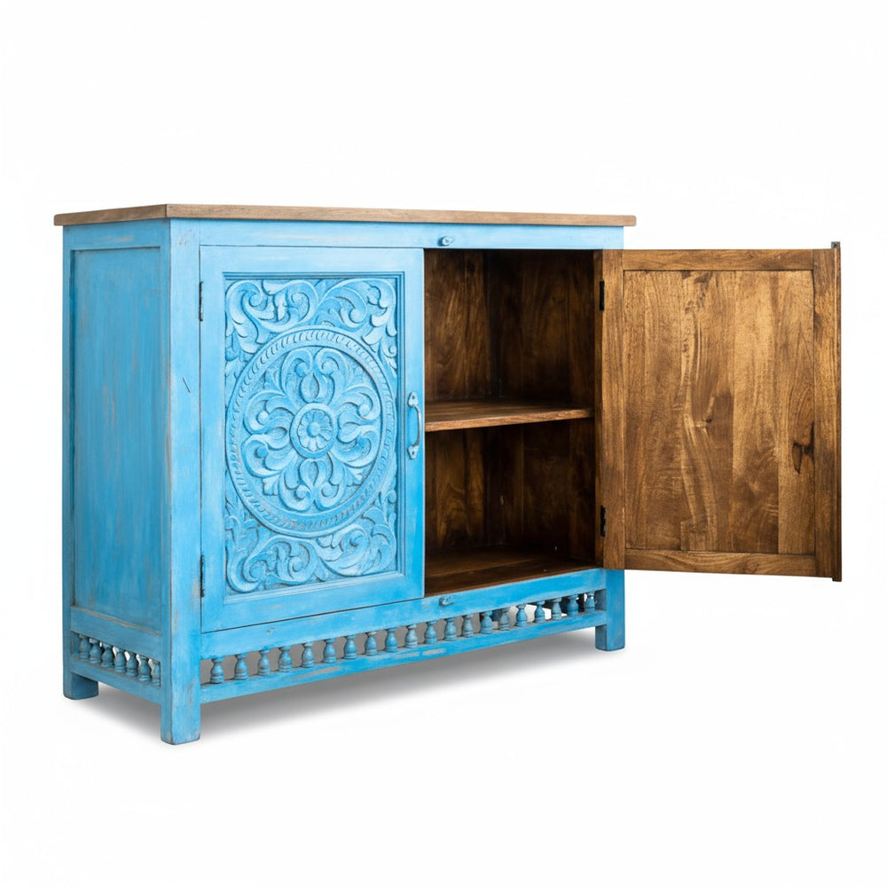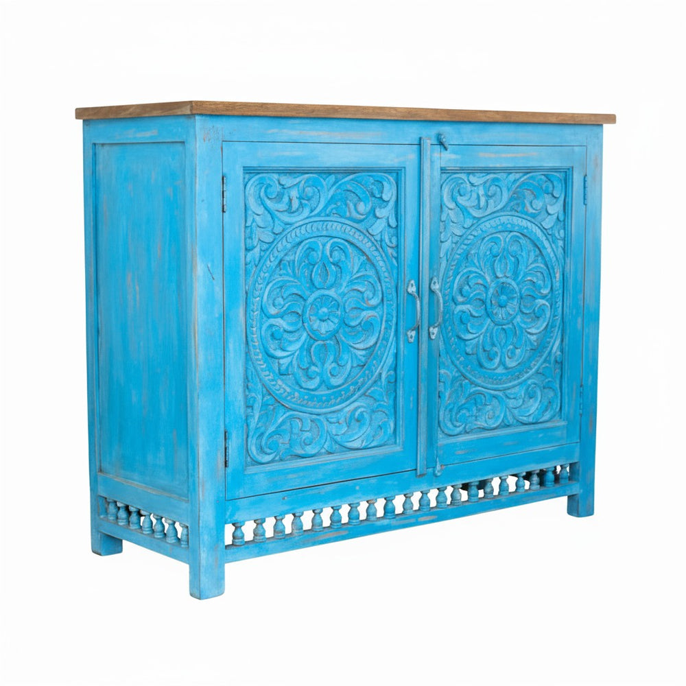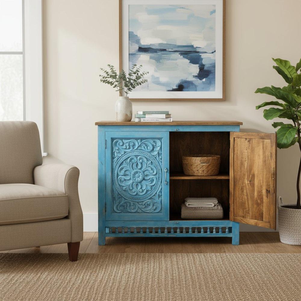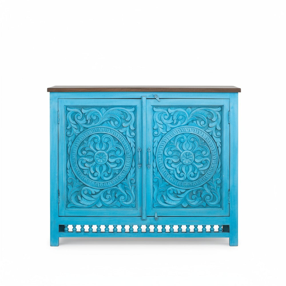 Meticulously carved from solid mango wood, this cabinet showcases a mesmerizing floral medallion design on its double doors — a tribute to the intricate handwork of Rajasthani artisans. The vibrant distressed blue finish gives it a weathered, bohemian allure that beautifully complements the natural wooden top.
