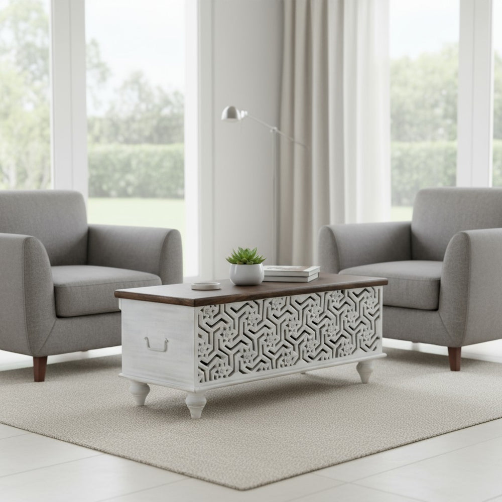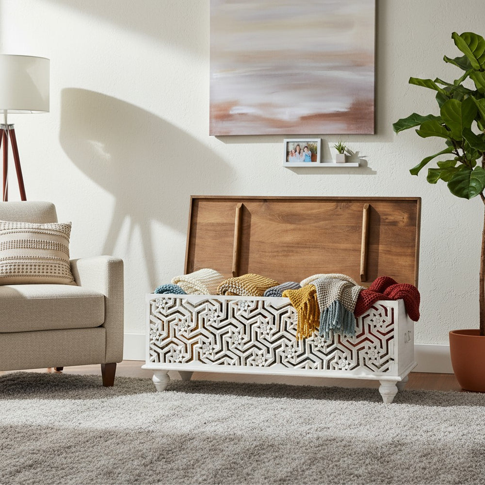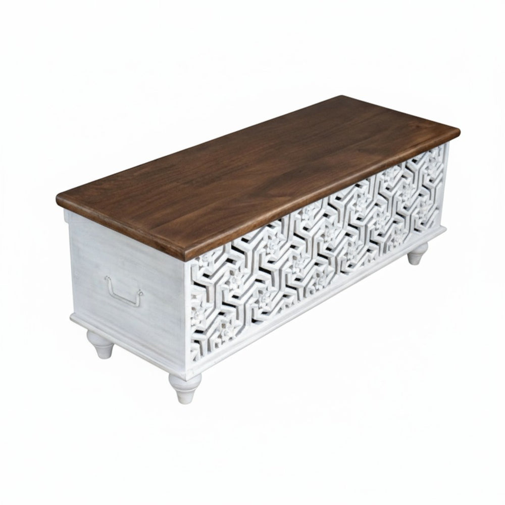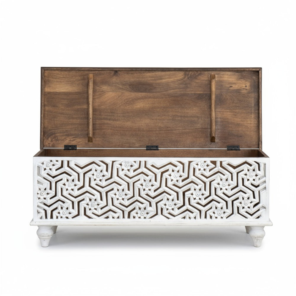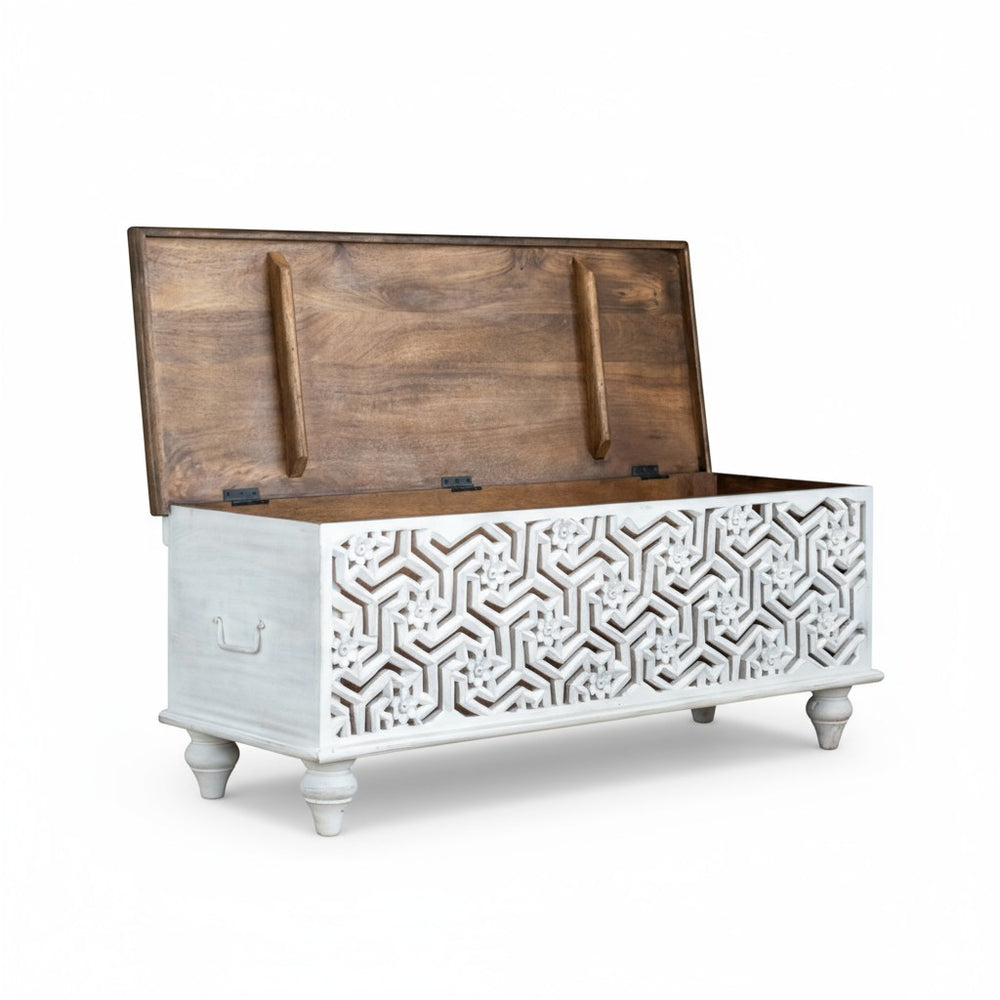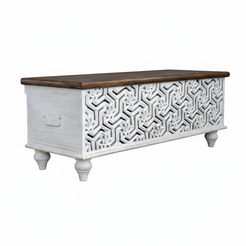 Made from solid mango wood, this elegant chest features a beautifully hand-carved geometric floral pattern on the front, finished in a subtle whitewash that enhances the intricate detailing. The contrast between the natural wood top and the distressed white body creates a striking rustic-meets-modern look, perfect for adding a touch of global sophistication to your home.