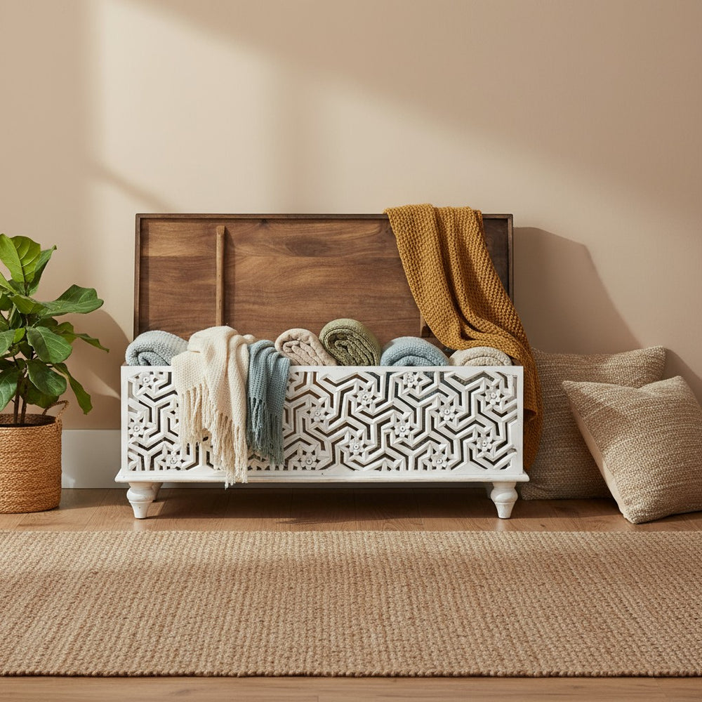 Experience the charm of timeless Indian craftsmanship with this Handcarved Mango Wood Blanket Chest, a stunning piece designed and handcrafted by skilled artisans at Viratra Art Decor.